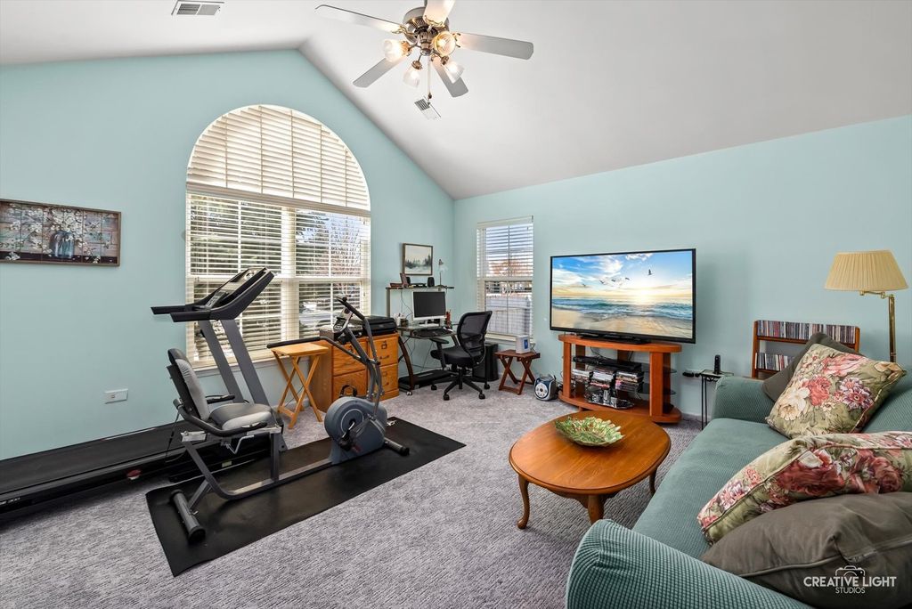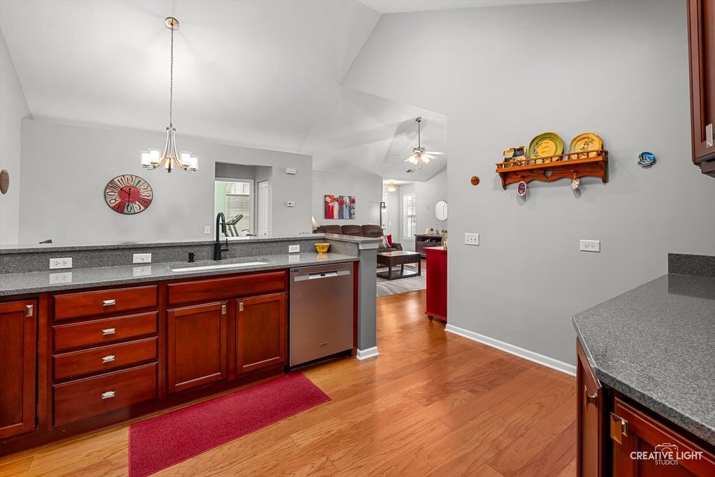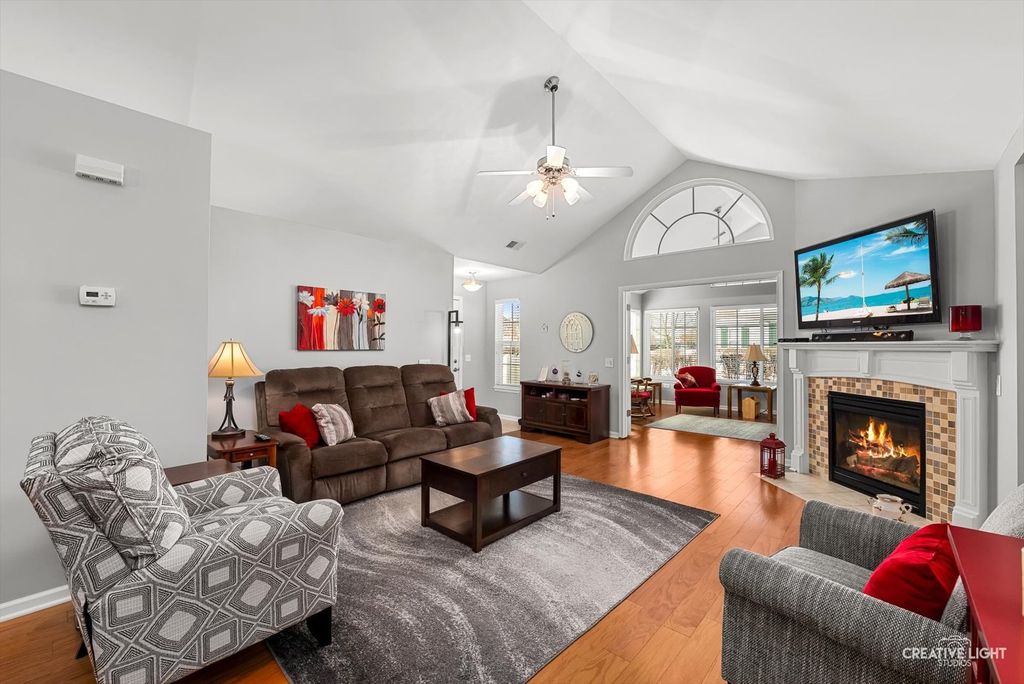 Absolutely gorgeous home in the highly sought-after Villas at Fox Run! This beautifully maintained ranch offers vaulted ceilings, stunning flooring, and high-end finishes throughout. Enter through a charming private fenced courtyard into a bright, open-concept living space. The living room features a vaulted ceiling and a cozy gas fireplace. The gourmet kitchen offers vaulted ceilings, custom cabinetry, granite countertops, tile backsplash, a breakfast bar, and a pantry, and opens seamlessly to the dining room, making it perfect for both everyday living and entertaining. The spacious primary suite boasts a vaulted ceiling, a private en suite bath, and an oversized walk-in closet. A large second bedroom also includes a vaulted ceiling and walk-in closet, offering comfort and flexibility for guests or a home office. Enjoy year-round relaxation in the sun-filled sunroom featuring beautiful flooring and elegant Palladian windows. Additional highlights include a generous laundry room with a utility sink, cabinetry, and extra storage, plus a 2+ car garage with adjustable wire rack shelving. Located just steps from the clubhouse with a heated pool, exercise room, and community space, there truly is something for everyone. Conveniently situated minutes from expressways and shopping, and within walking distance to two health centers. No age restrictions, this is maintenance-free ranch living at its finest! Recent updates include interior paint, bedroom carpeting, the primary shower fixture, light fixtures, and cabinet hardware in 2017; a paver front patio in 2018; a new dryer, paver back patio, and storm door in 2021; updated hardwood flooring in the sunroom, living room, dining room, and kitchen, along with new kitchen and bathroom faucets in 2022; a garbage disposal, washer, refrigerator, and dishwasher in 2023; a new stove and furnace motor in 2024; and a microwave, doorbell, and updated primary and guest bathroom faucets in 2025.
