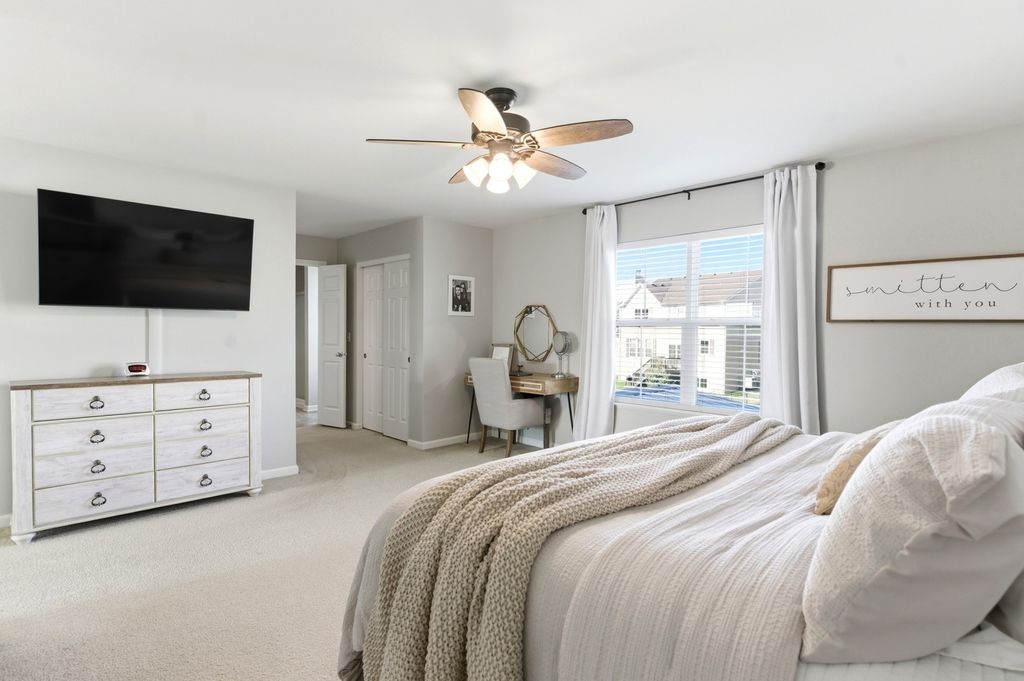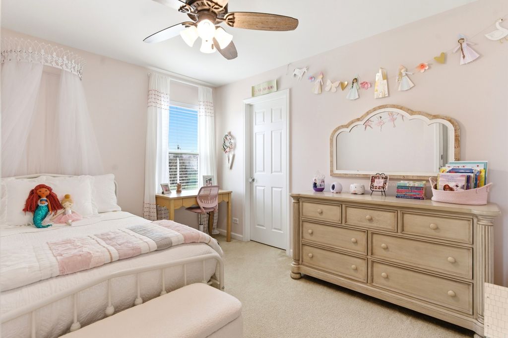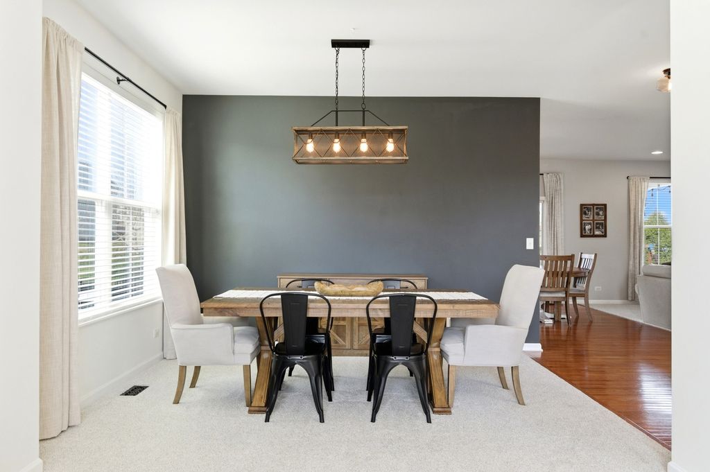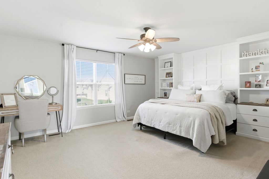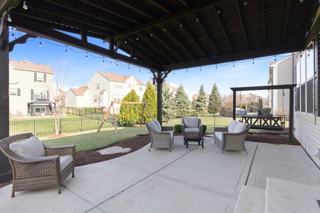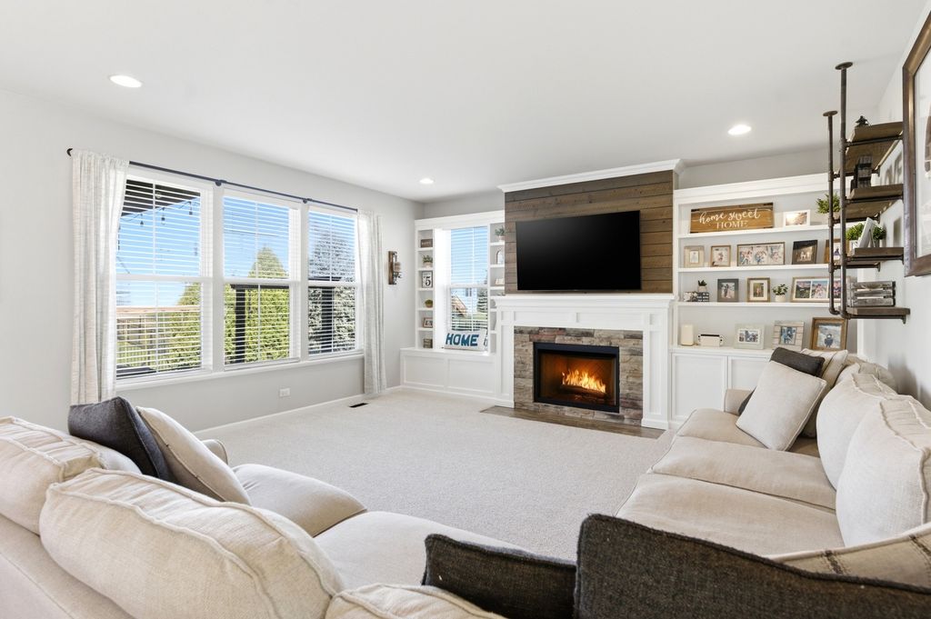 Move-in ready and beautifully updated Hanover model in sought-after Talamore Subdivision, offering 4 bedrooms, 2.1 baths, and an open floor plan ideal for everyday living and entertaining. Fresh neutral tones and new carpet on the first floor create a warm, updated feel, while hardwood flooring in the foyer, kitchen, and breakfast area adds timeless appeal. Updated fixtures throughout, custom built-in shelving in the family room and living room, and thoughtful designer touches add style throughout. The beautifully appointed kitchen features built-in double ovens, stainless steel appliances, center island, ample cabinetry, and a new backsplash, opening to the breakfast area and spacious family room. The first floor also offers an updated laundry room with built-in sink, shiplap accent wall, and storage, plus a mudroom with built-ins leading to the tandem 3-car garage. Upstairs, the oversized primary suite is a private oasis with a custom walk-in closet, built-in nightstands and shelving, double sink vanity, and walk-in shower. All bedrooms include ceiling fans, and one secondary bedroom features a designer paneled accent wall. The finished basement adds exceptional living space with a spacious open layout, wood-look flooring, and striking wood beam and column details, offering great flexibility for entertaining, recreation, exercise, or play. Enjoy summer evenings in the fully fenced backyard with professional landscaping, a large patio, pergola with lighting, and a brick grill surround for gas or charcoal grilling. Residents enjoy Talamore amenities including clubhouse, pool with water slide, party room, fitness center, and more. Located in the Huntley School District!