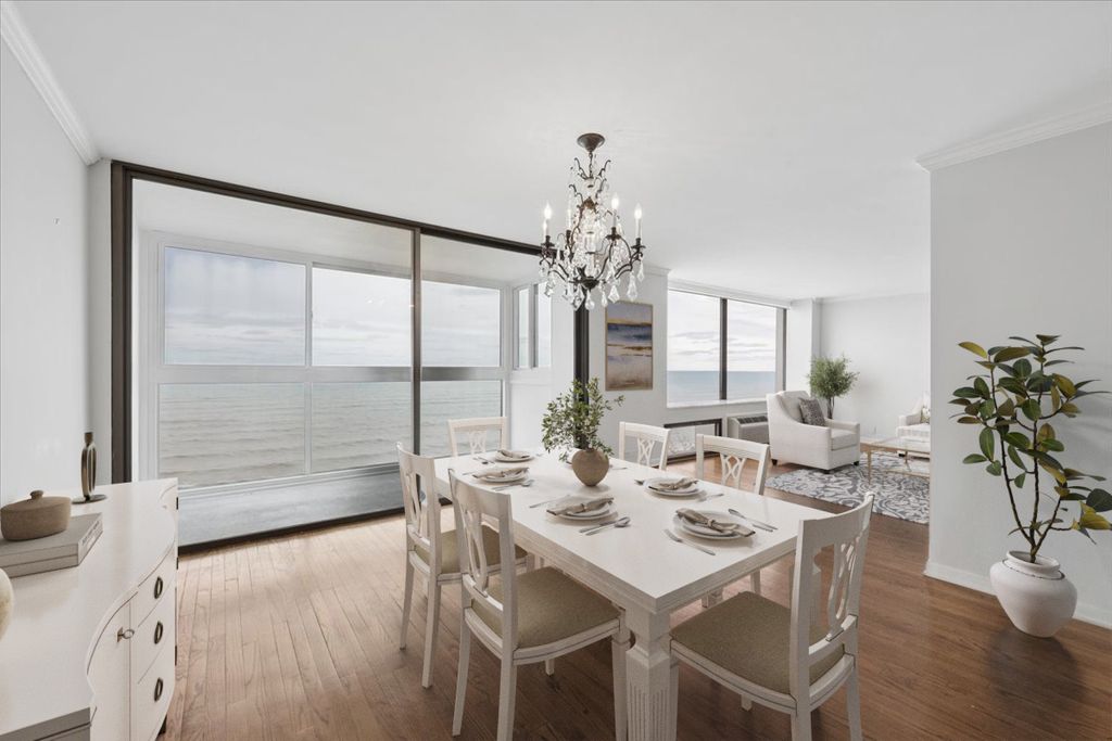 Gorgeous lakefront residence offering elevated living in one of the larger floor plans in this sought-after building. This 3-bedroom, 2.1 bath home showcases sweeping water views and an ideal layout for both everyday living and entertaining. Detailed millwork throughout, you will find an expansive living room with rich hardwood floors and stunning sightlines to the lake. The generous living and dining areas provide the perfect setting for gatherings, while the private balcony invites you to enjoy morning sunrises and serene water views. The classic white kitchen is thoughtfully designed with custom cabinetry, paneled appliances, granite countertops, and a movable island, offering additional counter space. The spacious primary suite features abundant closet space and a spacious bath complete with double vanity, separate shower, and soaking tub. Two additional well-sized bedrooms share an updated hall bath. A stylish powder room, in-unit laundry, and ample storage complete the home. Full-amenity building with 24-hour door staff, on-site management, lakefront pool, fitness center, and a renovated party room with kitchen located near the pool. Ideally location just steps from the newly enhanced Plaza del Lago shopping center which is one of the North Shore's premier lifestyle destinations, blending historic charm with a fresh mix of high-end retailers and restaurants. Easy, maintenance-free living! Move right in and start enjoying those show-stopping views!