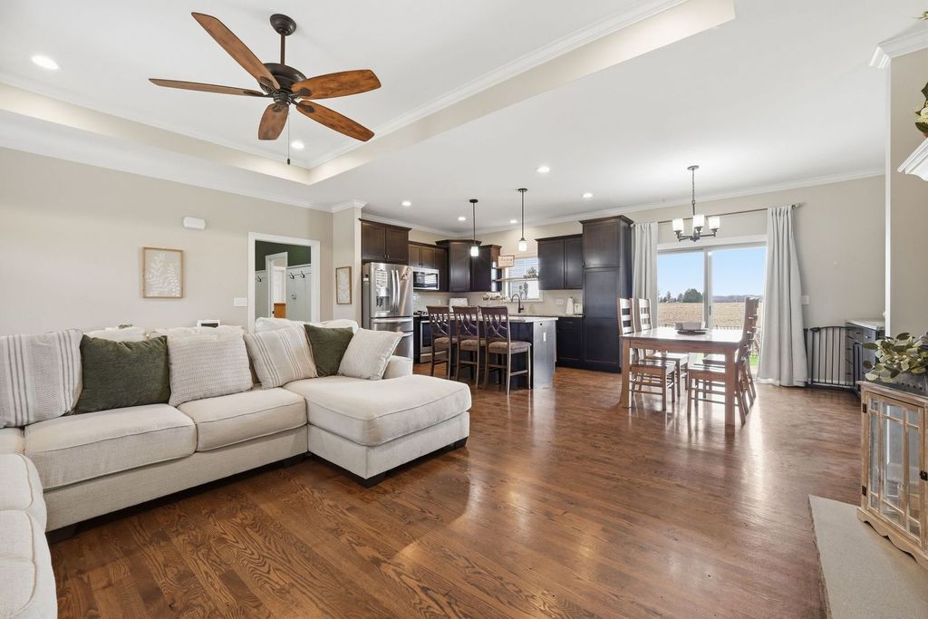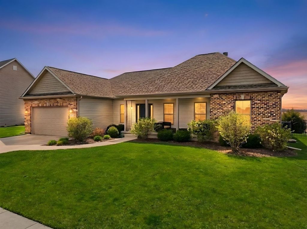 Multiple Offers Received! Highest & Best Offer Due at 12PM, Monday, March 30th! Beautiful custom ranch located in Camden Crossings in Sycamore! This desirable split-ranch floor plan offers an open layout with a private primary suite on one side of the home, featuring three closets, a spa-like bath with jetted tub, separate shower, and dual vanity. On the opposite side, you'll find two guest bedrooms and a full bath.The main living space showcases gorgeous antiqued oak floors and an inlaid travertine foyer, adding warmth and character. In the great room, enjoy 10-ft coffered ceilings with detailed crown molding throughout. Neutral decor carries throughout the home, complemented by upgraded finishes including a tile backsplash, granite surfaces, custom tile work, shiplap accent walls, built-in cabinetry, and a gas log fireplace.The partially finished basement provides additional entertaining space with a convenient half bath, plus a large unfinished area ideal for storage or future expansion, including rough-in plumbing for a potential fourth bathroom.Outdoor living shines with a spacious partially covered patio, fenced backyard, and stunning sunset views backing to an open field. The garage is plumbed for heat and features an additional storage closet for added functionality.