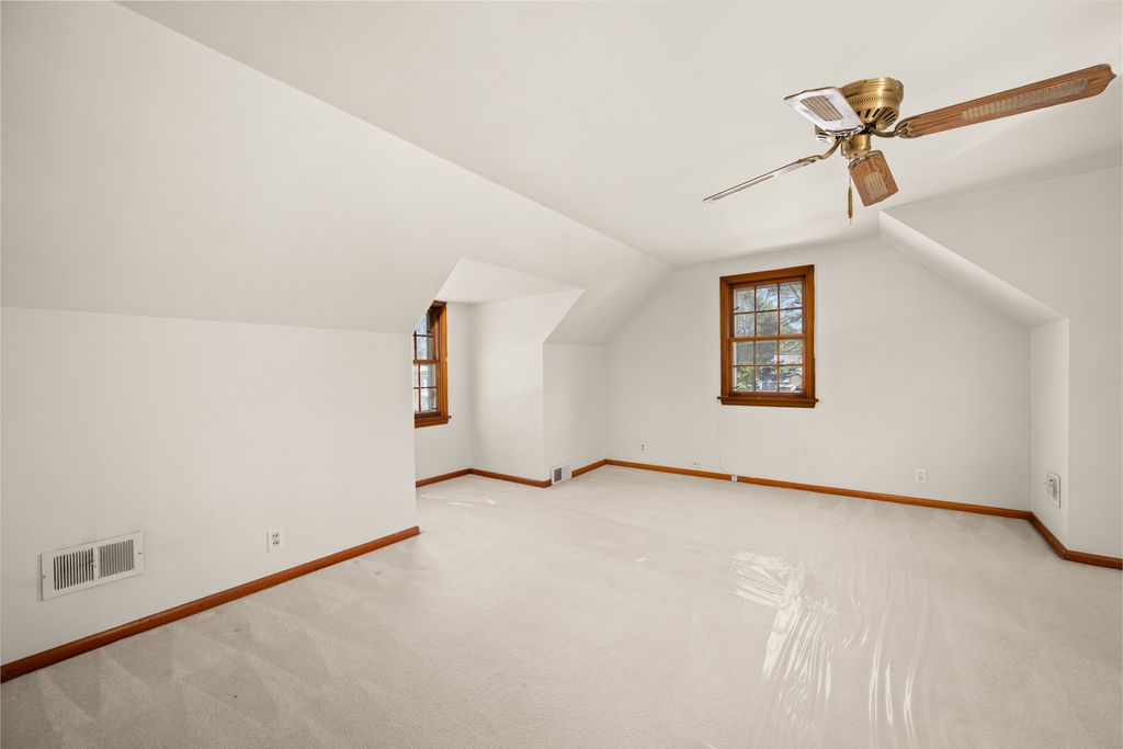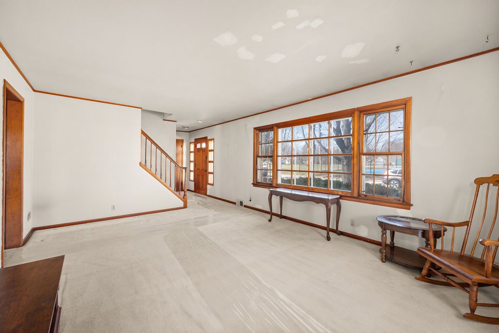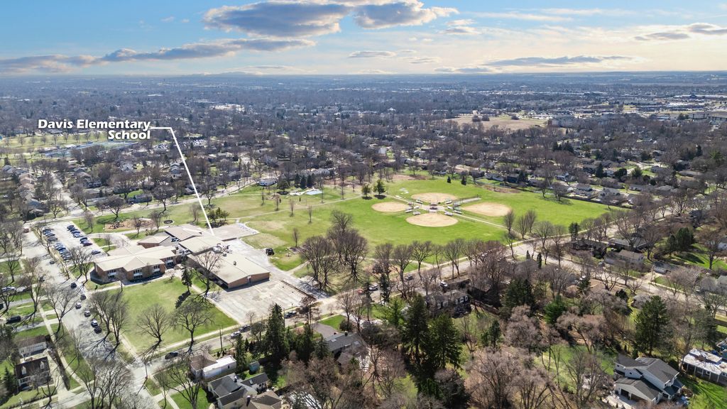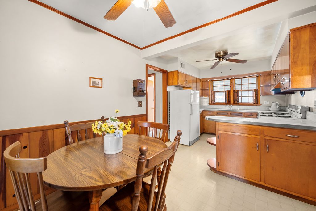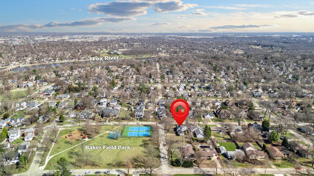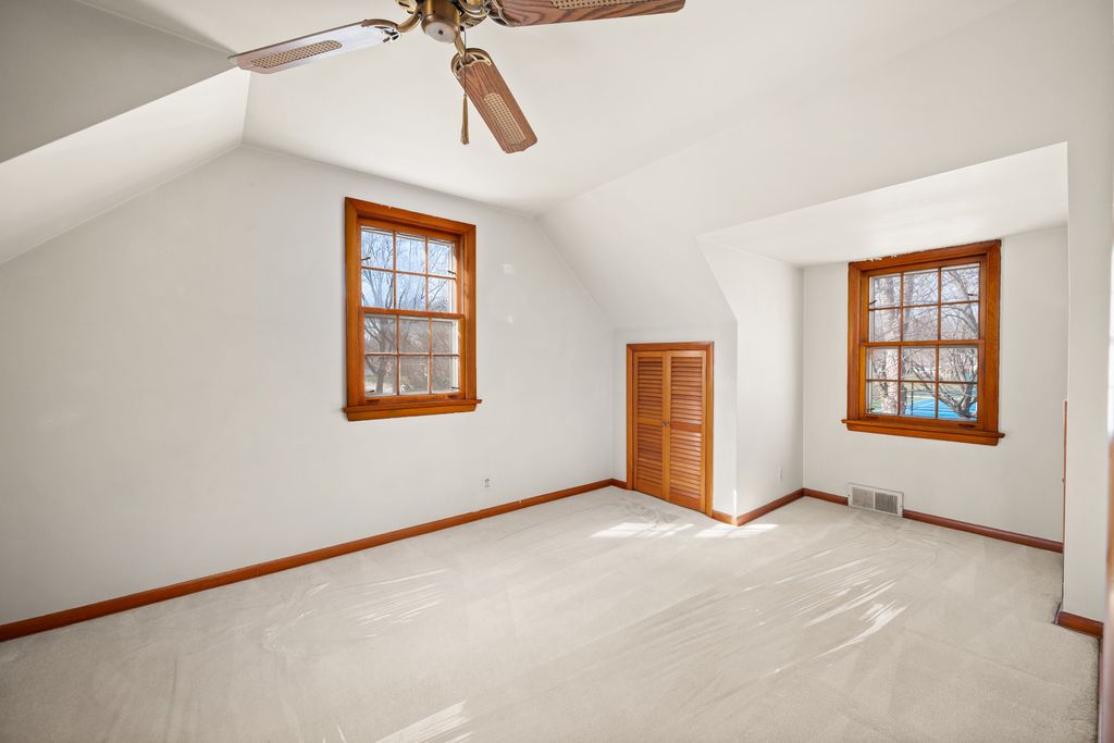 Nestled on a larger corner lot, across the street from Kehoe Park, this Cape Cod home is a rare find in an A+ location! Mature trees and charming curb appeal welcome you! The gently curving walkway culminates in an entrance framed by striking square-paned glass. The living room features an expansive, centrally located picture window flanked by operatable windows, creating a panoramic frame for the park views. Unwind in the heart of the home: a warm, inviting family room anchored by a stunning floor-to-ceiling stone wood-burning fireplace. Shutter doors and window shutters offer a welcoming, cottage-like feel in the kitchen. A knotty-pine accent wall, original wood cabinetry with built-in shelving, and modern mid-century countertops, complete this delightful space where cooking with love is a shared experience. A convenient half bathroom accommodates the main level. The enclosed knotty pine breezeway acts as a functional mudroom and versatile entertainment space, connecting the garage to the main house and opening onto the backyard patio. The thoughtfully designed staircase flows seamlessly into the upper sleeping area with a shared full bathroom displaying chrome fixtures and tile surround tub-shower combination. The bedrooms are very spacious and come equipped with ceiling fans. There is a walk-in closet or pocket office plus another closet in the primary bedroom. While you currently need to pass through one bedroom to reach another, it is possible to add another entrance and a short wall so that each bedroom has its own restricted access. The basement features 100-amp electrical service, copper plumbing, a cement block foundation, a workbench, hookups for a washer and dryer, a utility sink, a Trane furnace with 80% efficiency, a new (2023) Rheem Performance Platinum water heater, and a crawl space. Enhance your lifestyle with immediate access to nearby community amenities, including tennis courts, children's playground, and picnic areas just across the street. "With its charming atmosphere and welcoming community, this truly is a place where your heart can belong. Move in, meet the neighbors, and start living your best life!"