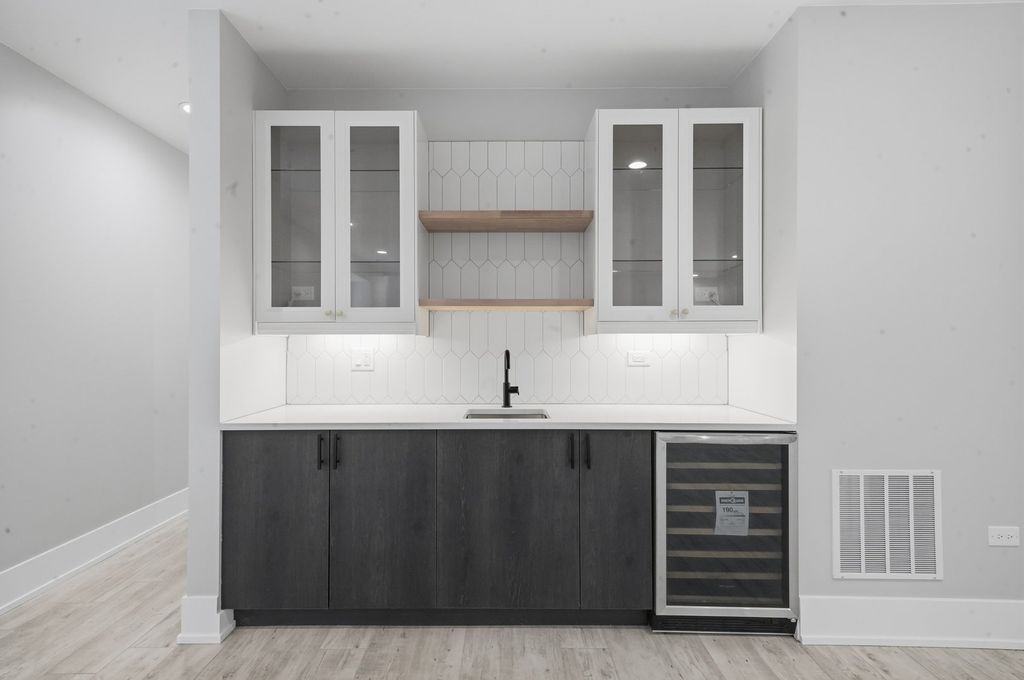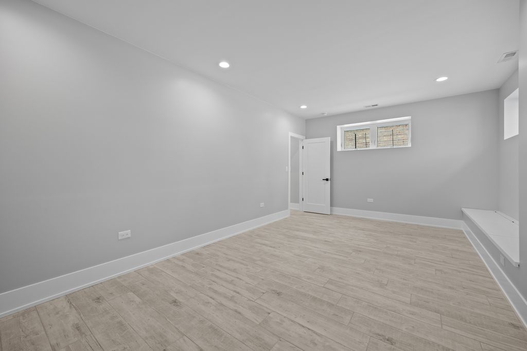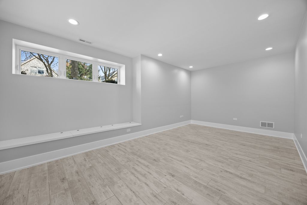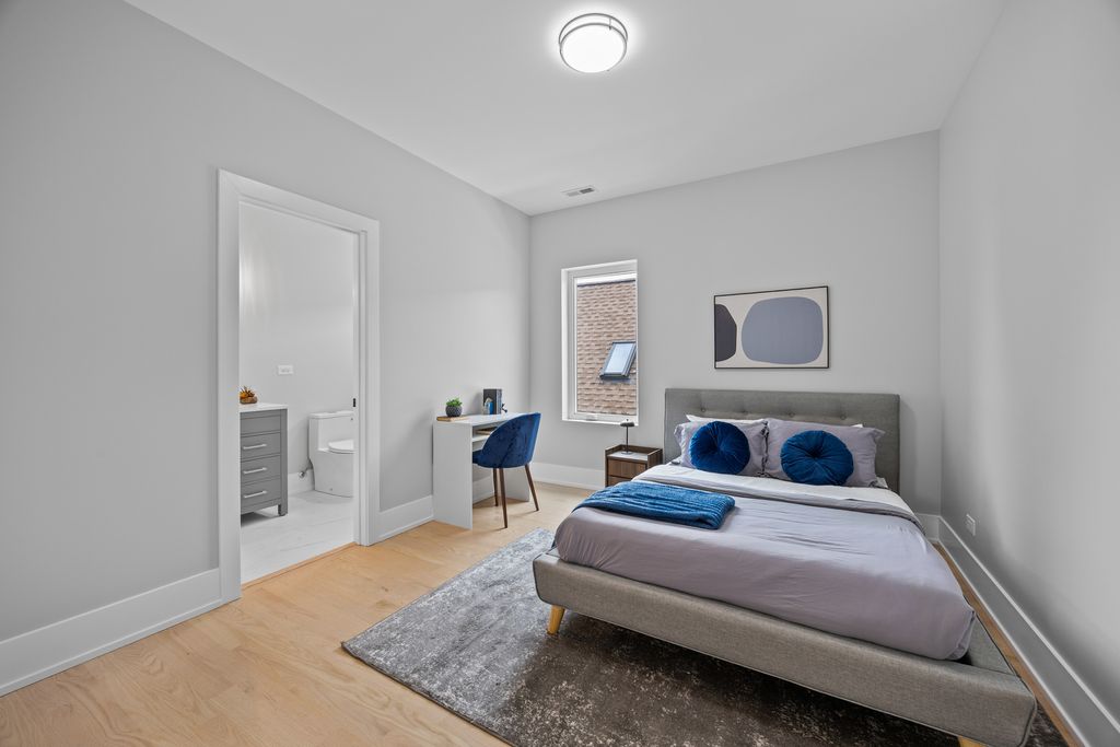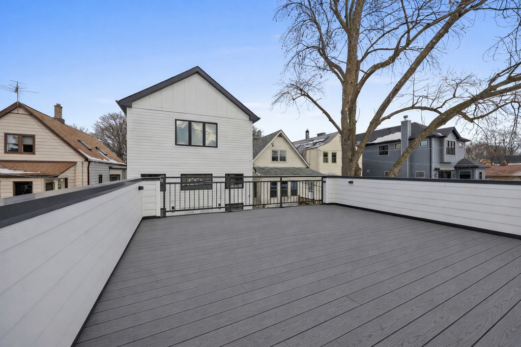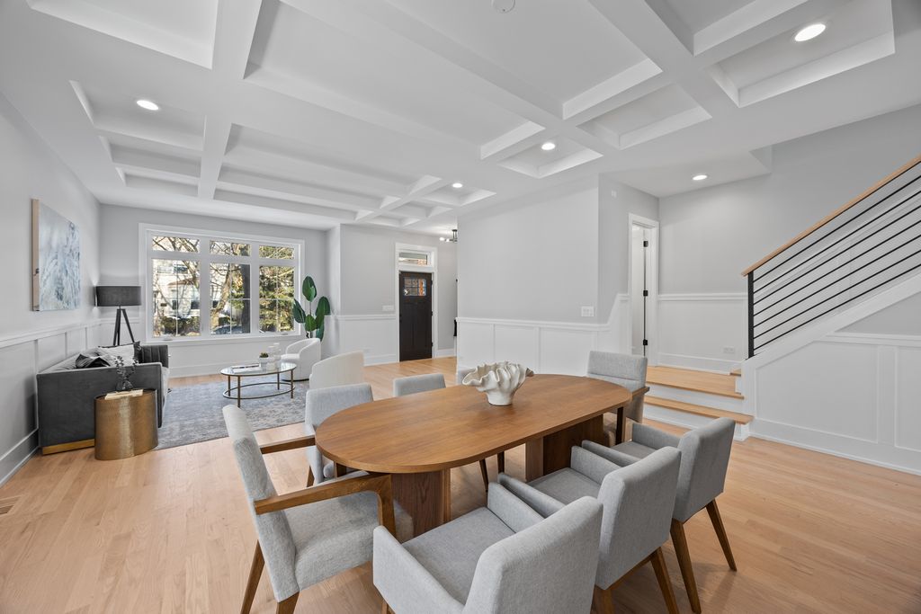 Welcome to this new construction single-family home located in Lincoln Square on an oversized 30' lot with an approximately 22' interior width. Situated within the sought-after Chappell Elementary School District, the home offers a spacious layout with 6 bedrooms and 4.1 bathrooms designed for modern living. The main level features white oak-stained hardwood floors, coffered ceilings, custom millwork, and oversized windows that provide abundant natural light. The open-concept living and dining areas lead to a chef's kitchen equipped with Bertazzoni appliances, custom cabinetry, quartz countertops, and a large island with designer lighting and a trimmed drop ceiling. The kitchen also includes a walk-in pantry and a butler's pantry with a wine refrigerator, providing additional storage and preparation space. The kitchen flows into the family room with floor to ceiling windows, a fireplace and access to a concrete patio and garage rooftop deck. The home includes four bedrooms above grade, including a primary suite with vaulted ceilings, a walk-in closet, and a bathroom featuring a freestanding soaking tub, dual vanity, and walk-in shower with body sprays. Two additional bedrooms are located in the lower level along with a prepped radiant heated floor with high 9-foot ceilings. Additional features include two laundry rooms, smart thermostats, Samsung washer and dryer, dual-zone high-efficiency HVAC systems, foam insulation, flood control system with dimple membrane, Cat 6 wiring with wireless access points, and pre-wiring for doorbells, security cameras, cable, and surround sound. The garage is pre-wired for an electric vehicle charger. Conveniently located near Lincoln Square, Andersonville, and Bowmanville, with access to Metra, CTA Brown and Red Line stations, Winnemac Park, West Ridge Nature Park, and nearby dining and shopping.