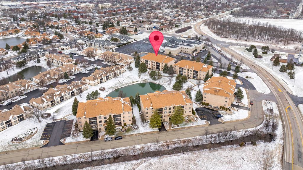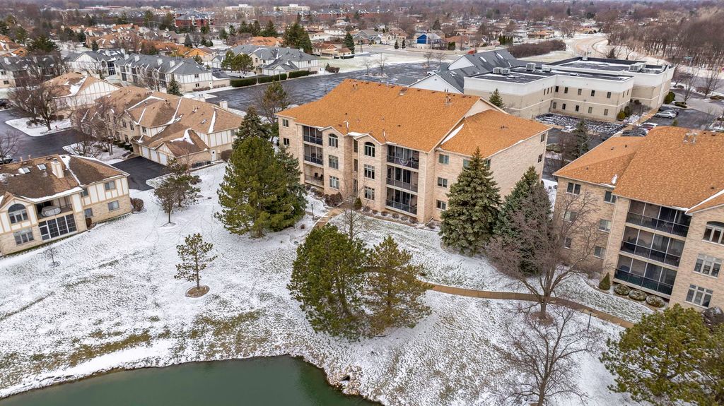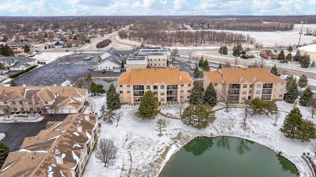 Beautiful, quiet penthouse in solid all-brick adult community condo w/elevator and heated garage. Gorgeous views of pond & grounds. Soaring ceilings, fireplace, in-unit laundry, master suite w/whirlpool tub & separate shower. Unit has 2 large bedrooms and 2 full baths. All wood laminate flooring throughout. Bright and open floorplan. There is a large, screened patio overlooking pond. A lot of storage and closet space in this unit including a 5' x 7' private storage area in heated garage. Great Tinley Park location, close to I80 and Metra train station as well as Downtown Tinley and other area amenities.
