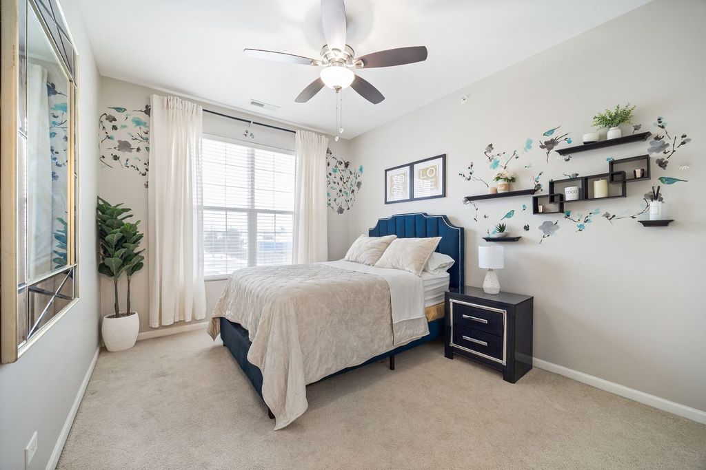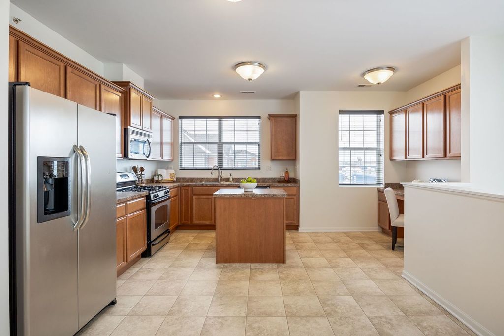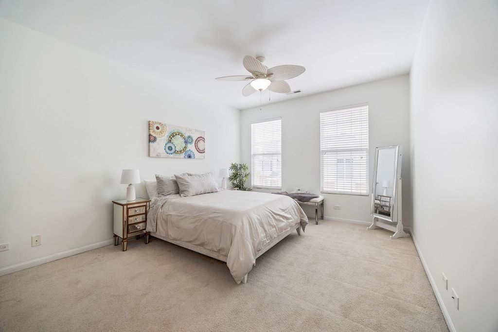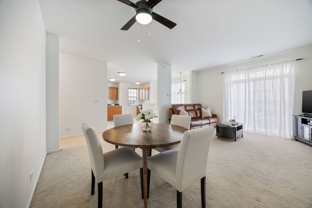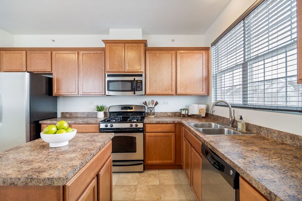 Welcome to this beautifully maintained end-unit condo in the highly sought after Bridgeview Place community. This 2 bedroom, 2 bath home offers an open-concept layout designed for both everyday living and easy entertaining. The combined living/dining room connects seamlessly to a well-designed kitchen featuring abundant cabinetry, a center island, stainless steel appliances, and a built-in desk perfect for work, planning, or a morning coffee moment. The primary bedroom is spacious and inviting, complete with a full bath, double vanity, and 2 closets with one being a walk-in. This home also offers a second generously sized bedroom, full guest bath, and separate laundry room. Enjoy high ceilings, modern ceiling fans, and oversized windows that create a bright, sun-filled atmosphere throughout. Step out onto the private balcony for an added outdoor space perfect for enjoying time with family and friends. Take advantage of the attached two-car tandem garage with extra storage. In addition, this community offers a surplus of guest parking and a playground. Located just minutes from shopping, dining, and major expressways including I-294 and I-55, this home offers the perfect balance of comfort and convenience.