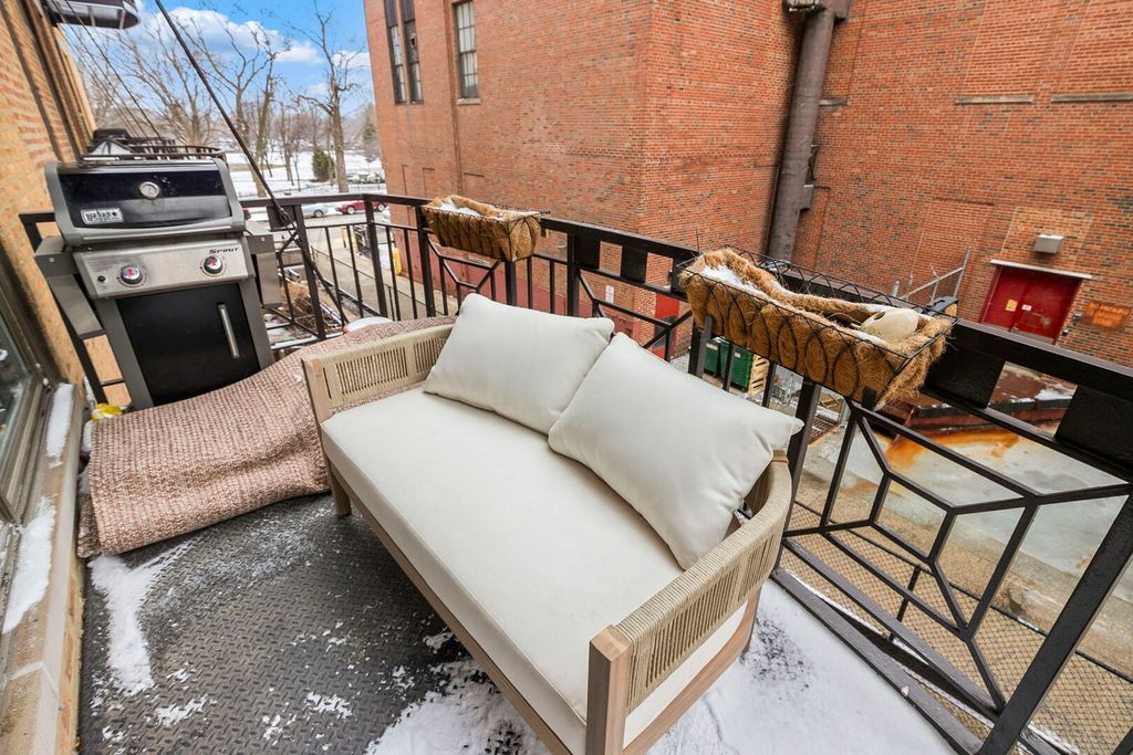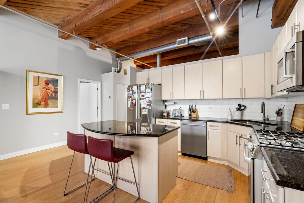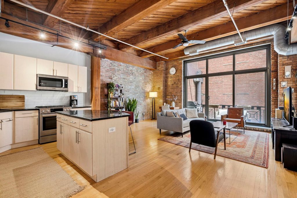 Stunning 2-bedroom, 1-bathroom brick-and-timber loft in the coveted Block Y community in the heart of the West Loop! With soaring 12-foot timber ceilings and exposed brick, every corner of this home exudes warmth, character, and charm. The chef's kitchen features granite countertops, a gorgeous tile backsplash, high-end Bosch stainless steel appliances, and an island with a breakfast bar overlooking the expansive living/dining room and sunny private balcony.The fully enclosed primary suite is a true retreat, complete with a wall of windows, ample closet space, and a beautifully remodeled dual-access ensuite bath with designer finishes, including a striking floating double vanity. A generous second bedroom, gleaming hardwood floors, in-unit laundry, and abundant storage throughout. This elevator building home features one attached garage parking space and one standard storage cage included in the price! Block Y offers some of the best green space in the West Loop, featuring a private professionally landscaped courtyard with beautiful gardens and a serene koi pond. Directly across the street, expansive Skinner Park offers walking and biking paths, lush flower gardens, and basketball, softball, and tennis courts. Absolutely incredible location, in the highly ranked Skinner and Whitney Young school districts, and just moments from Randolph Street's renowned restaurant row, the United Center, the Loop, I-90/94, and the Green and Pink lines. This is West Loop living at its finest - don't miss your chance to own this truly special home in one of Chicago's most dynamic neighborhoods!