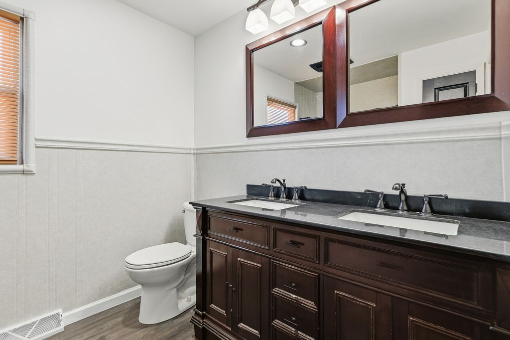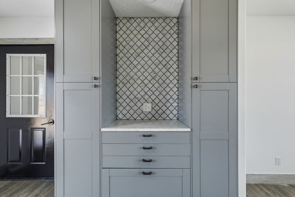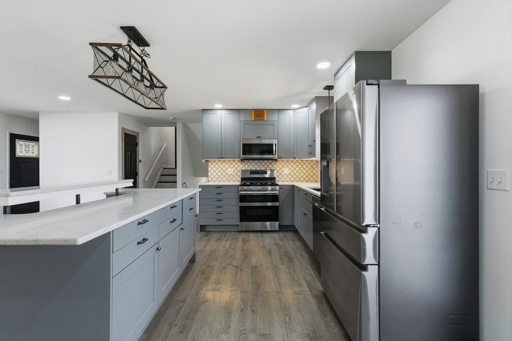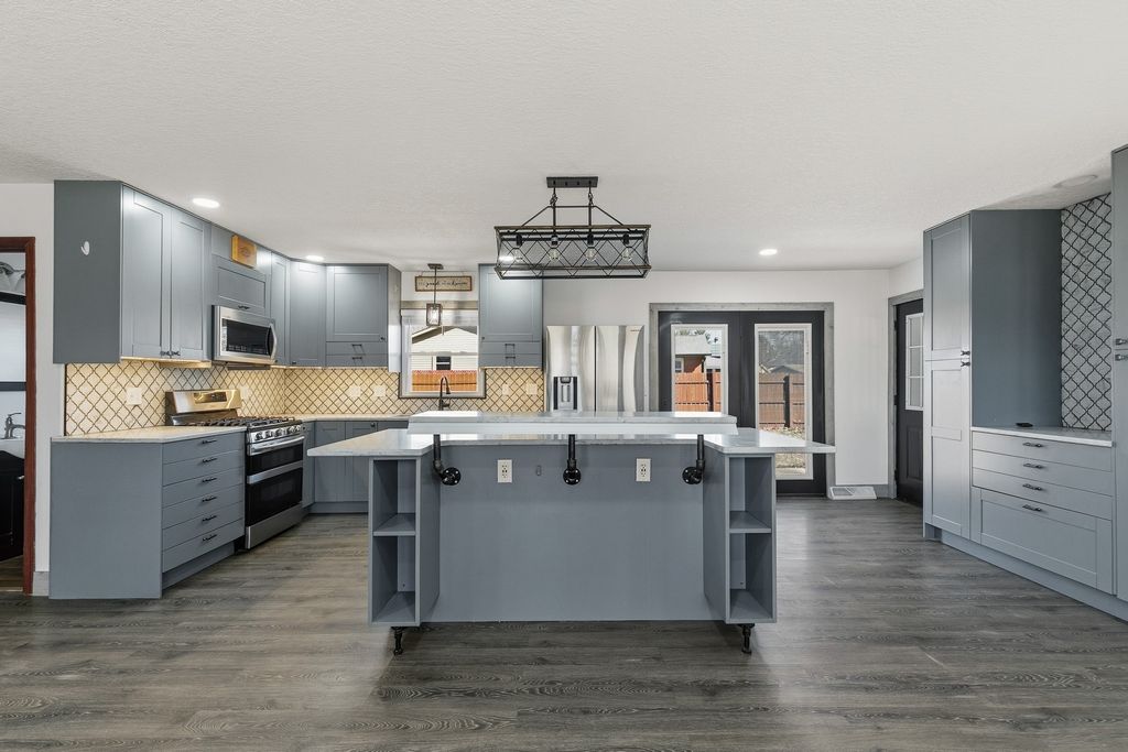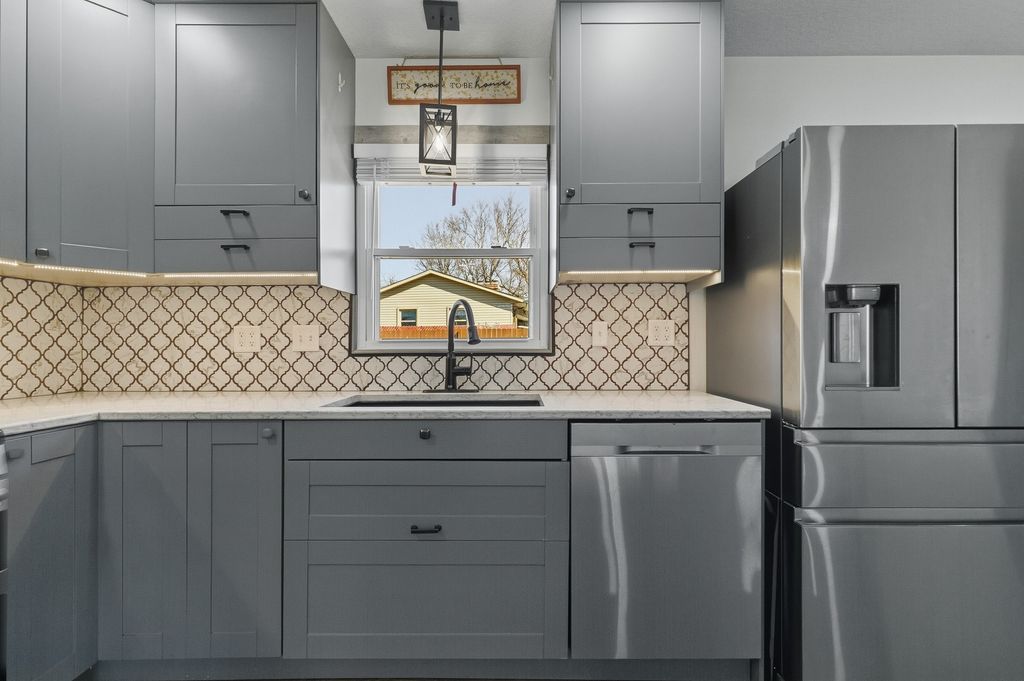 Completely remodeled and move-in ready, this stunning 4-bedroom, 21/2-bath quad-level home is perfectly situated on a level, corner fenced lot in a rural subdivision. From the moment you arrive, you'll appreciate the inviting covered front porch-ideal for morning coffee or simply relaxing. Step inside to a beautifully updated main level featuring a show-stopping kitchen with quartz countertops, a unique backsplash, stainless steel appliances, and a dedicated coffee bar & 1/2 bath. French doors lead to a brand-new concrete patio overlooking the privacy-fenced backyard-perfect for entertaining, pets & enjoying quiet evenings outdoors. The upper level offers (3) spacious bedrooms with new carpet and a stylishly updated full bath. On the lower level, you'll find a striking concrete landing, a private primary suite complete with a new ensuite featuring a beautifully tiled shower, along with a rec room/game room for additional living space. The basement features the laundry area with washer, dryer, and water softener. Two car attached garage also features a custom concrete floor, adding both function and style. All appliances are included and sold "as is." This one-of-a-kind property blends modern updates with unique design elements-ready for its new owners to move in and add their own personal touches to make it their OWN!!!