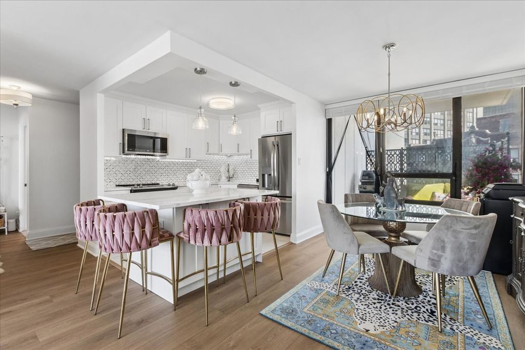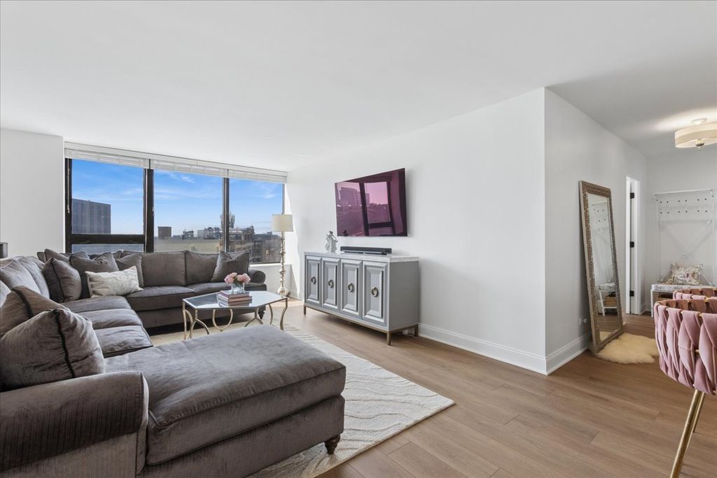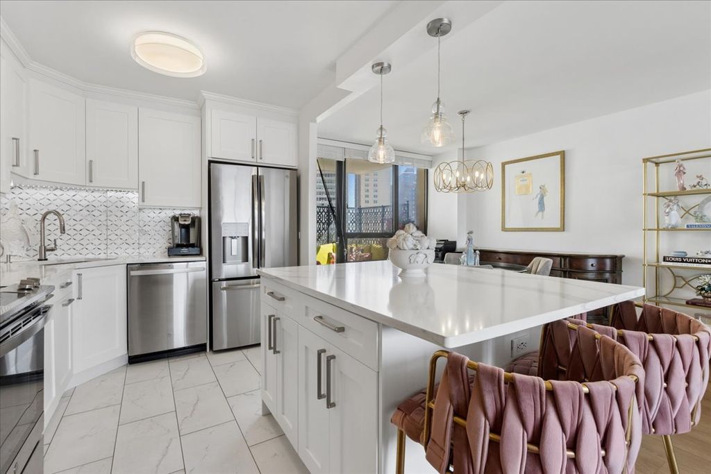 This rare corner gem, large one bedroom unit with balcony in Chicago's beautiful Lakeview East neighborhood offers an unparalleled blend of sophistication and serenity at Lake Park Plaza- a luxury high-rise renowned for its resort-style living. Indulge in a fully rehabbed kitchen that exudes timeless elegance: sleek quartz countertops paired with a stunning mother-of-pearl and marble backsplash tile that shimmers with iridescent luxury. A delight for any inspired chef that desires a luminous focal point for effortless entertaining. Freshly painted white gardenia walls and brand-new luxury vinyl plank (LVP) flooring throughout provide a pristine, modern foundation. The corner unit is sun drenched with natural light from every angle. This exceptional "16 tier" space remains the largest one-bedroom floor plan in the building (approximately 850 sq ft), and graced with a private balcony perched along the lakefront-your exclusive outdoor retreat with lake breezes or sunset views over the city and lake. The corner layout radiates in sunlight and boasts generous room sizes, with distinct living and dining areas, abundant closet space, and a spacious bedroom ideal for a king-sized bed for your serene sanctuary. Step into the opulently renovated white stone bathroom, featuring an exquisite art deco mirrored vanity, crystal chandelier lighting, and spa-like finishes that elevate everyday routines to pure indulgence. Reside in unparalleled amenity-rich luxury property: escape daily life to a breathtaking resort level sparkling pool, sophisticated lounge seating with fire pits, al fresco bar, extensive grill stations, abundant chaises for sunbathing, children's play area, tennis and basketball courts, a state-of-the-art fitness center, entertainment room, laundry facility, additional locker storage, package room, and 24 hour secure front desk attendant service. Perfectly positioned just off Lake Shore Drive, mere steps from the iconic lakefront trail, lush parks, premier transit (buses and el train), and the vibrant energy of Broadway/Sheridan Road-restaurants, boutique shopping, and city conveniences await at your doorstep. This turn-key masterpiece is move-in ready and designed for discerning buyers seeking elevated, maintenance-free skyline luxury living in one of Chicago's most coveted urban enclaves. A true rarity-don't miss this opportunity to own a piece of refined lakefront elegance! Garage parking is available for rent in the building.