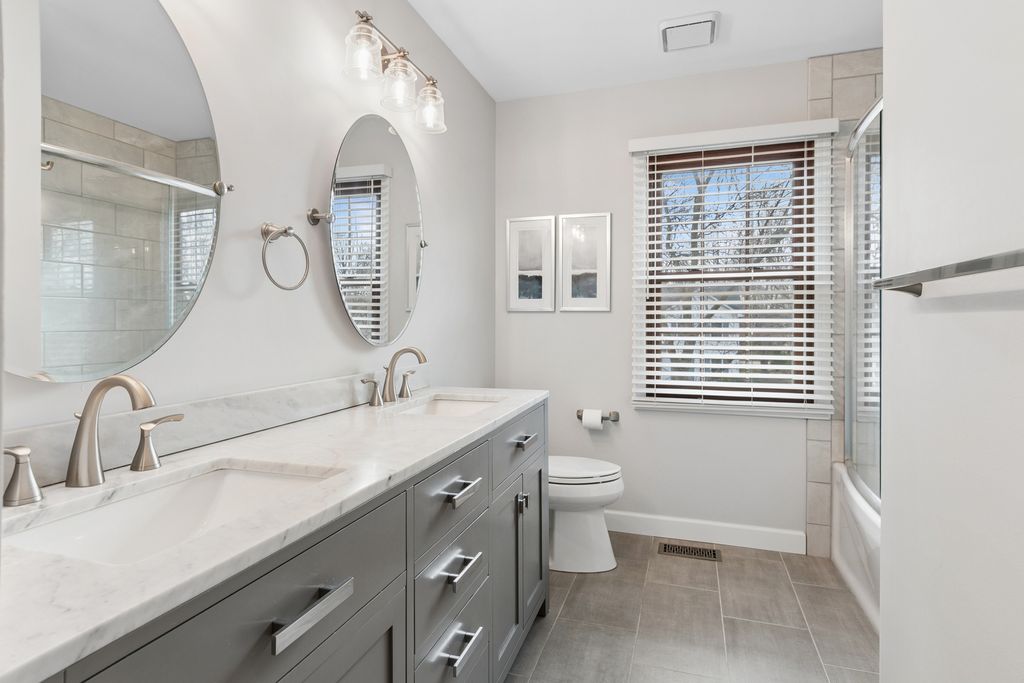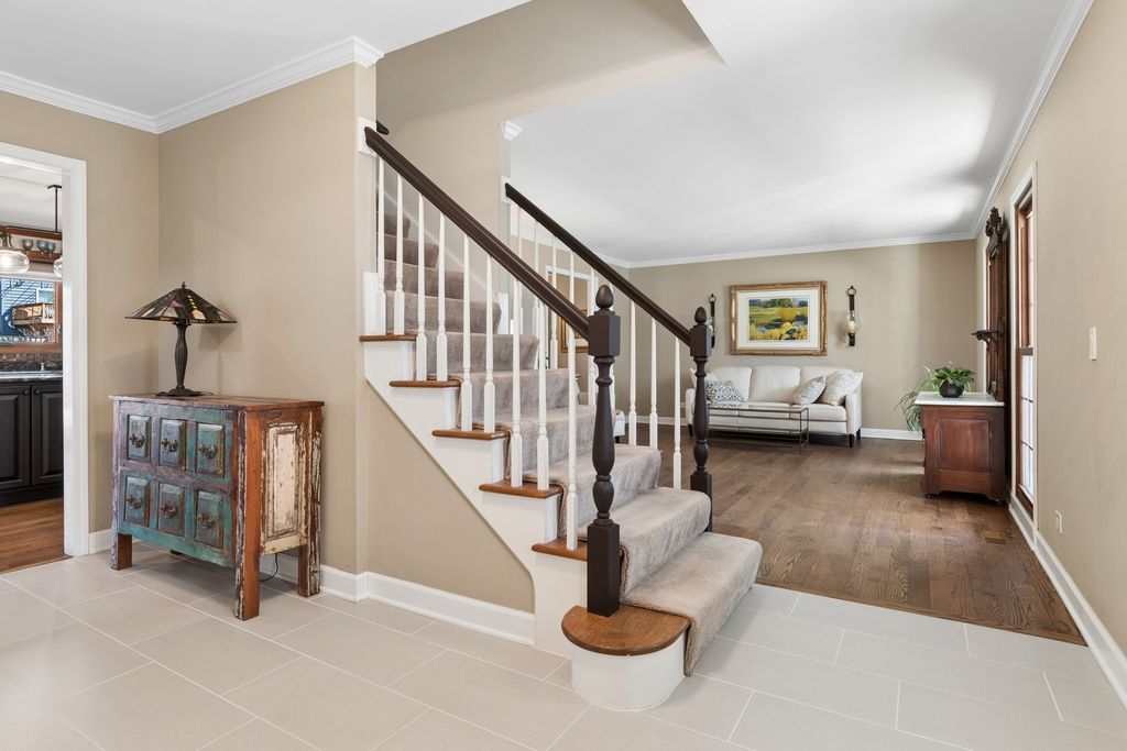 Beautifully updated home located in the highly sought-after River Woods Elementary district! The main level welcomes you with a porcelain tile foyer, updated powder room, and rich hardwood flooring throughout the living room, dining room, kitchen, and family room. The spacious kitchen is a true centerpiece, featuring a large island, granite countertops, stainless steel appliances, and two pantries, all opening seamlessly to the inviting family room with a cozy fireplace and custom built-in shelving. Upstairs, the expansive primary suite offers dual walk-in closets, an updated bath with separate vanities, and a beautifully designed walk-in shower. The remodeled hall bath and three additional generously sized bedrooms complete the second level. If you like to entertain, the finished basement provides exceptional additional living space with a large recreation room, dedicated office, and game area-plus pool table, chairs, and accessories included! Step outside to enjoy the fully fenced backyard with a maintenance-free deck and lush landscaping-perfect for relaxing. This move-in ready home truly has it all-space, updates, and the perfect location!