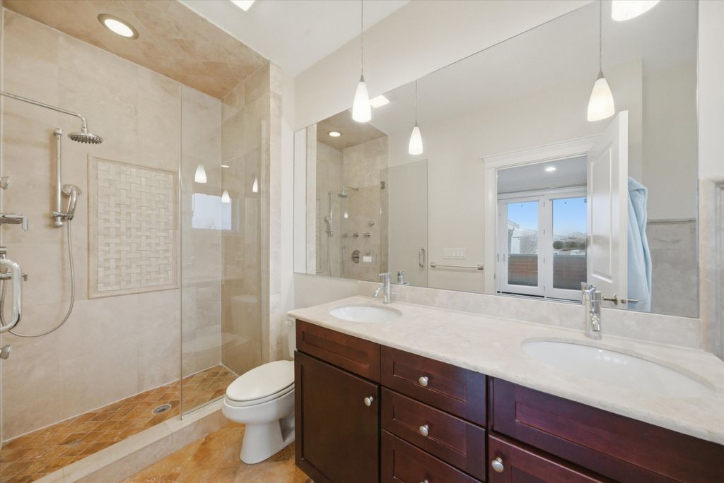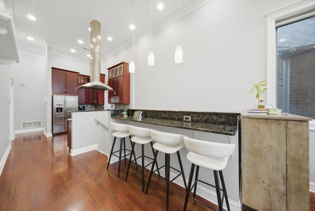 Stunning 3-bedroom, 2.1-bath PENTHOUSE in the heart of Wicker Park featuring a spectacular custom-built private rooftop deck with breathtaking Chicago skyline views. This top-floor home lives like a single-family residence in the sky, offering a unique multi-level layout that thoughtfully separates living and private spaces. The main living level welcomes you with an immediate "wow" factor-a bright and airy living and dining room showcasing soaring 14-foot ceilings and a dramatic wall of windows overlooking tree-lined Greenview Avenue. French doors lead to a spacious front terrace, perfect for easy outdoor access right off the main living space. The living room is anchored by a gas fireplace and features cherry hardwood floors, crown molding, and incredible natural light throughout. The kitchen offers double-height shaker-style cherry cabinetry with illuminated glass-front uppers for additional storage, granite countertops, tile backsplash, and stainless steel appliances, creating a functional and stylish space for cooking and entertaining. Upstairs, escape to your fully built-out private rooftop oasis, professionally designed by Chicago Urban Rooftops. Enjoy panoramic skyline views while relaxing under the custom pergola with freestanding fire pit, or host unforgettable gatherings in the tiled outdoor dining and kitchen area complete with custom cabinetry and granite counters. A turf area with built-in planters provides additional space ideal for lounging, a putting green, or a hammock retreat. The primary suite offers a spacious bedroom, two closets, and a large ensuite bath with double vanity, soaking tub, and walk-in shower. French doors open to a private balcony off the primary bedroom. The lower level includes two additional bedrooms, a full bathroom, and a newer stackable washer and dryer. Additional features include California Closets throughout the bedrooms, custom-made bar, one garage parking space and an unbeatable location just steps from the restaurants, bars, and shopping along Division Street and North Avenue, plus only two blocks to the Division Blue Line stop for easy commuting. A truly unique home with exceptional outdoor living-just in time to enjoy summer on your private rooftop retreat. Explore the property in 3D! Click the 3D button to take a virtual tour and walk through every detail.