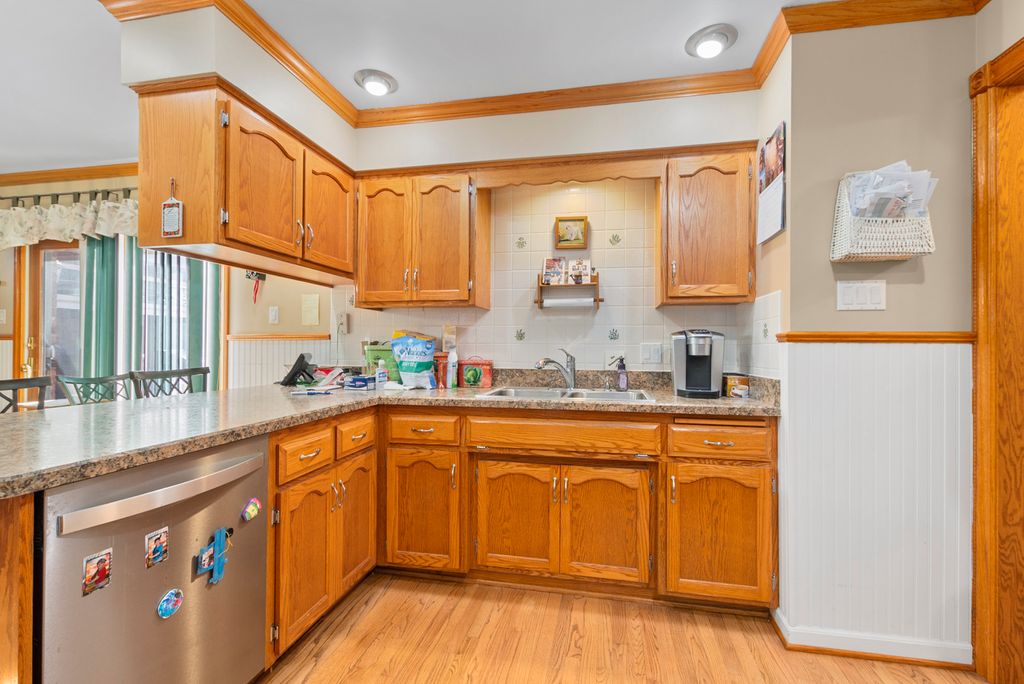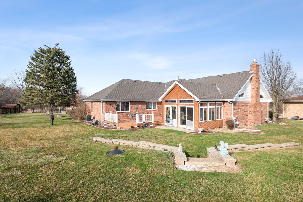 Fantastic custom ranch located in a cul-de-sac offering both great curb appeal and a private back yard with views of the forest preserve. Notable upgrades include the newer roof approx. from 2014, Lennox furnace installed approx. in 2023, and impressive trim around the doors along with crown molding. The main level features 3 generous size bedrooms with 2 full baths and 2 additional half bathrooms. A desirable layout starts with a nice foyer and opens into an enormous great room with brick fireplace, soaring ceilings, custom built in cabinets and shelving. The Andersen French doors flows into an inviting light-filled enclosed 3 season sunroom with picturesque views of the expansive yard and nature. The large open kitchen features solid oak cabinets, breakfast bar, stainless appliances, generous counter space and pantry. The dining area is perfect for gatherings and entertaining guests featuring wainscoting and crown molding. The primary suite offers vaulted ceilings, full private bath, along with a large walk in closet and many Andersen windows. The main floor laundry has extra cabinets for storage and a utility sinks. The sprawling finished basement with another possible bedroom, office, or exercise room allows for so many possiblities along with a half bath and plenty of storage closets. Enjoy the relaxing outdoors space on the patio or deck area. This home also comes with the nice size storage shed. You're not going to want to miss this rarely available property!
