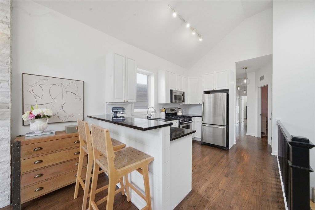Penthouse, sun-filled 2-bedroom, 2-bath condo in a prime Lakeview location! Vaulted ceilings and skylights brighten the spacious living and dining area, featuring a cozy gas fireplace and seamless flow into a stylish kitchen. The kitchen offers white cabinetry, granite countertops, a breakfast bar, and stainless steel appliances. The primary suite includes generous closet space and an en-suite bath with a dual vanity. A well-sized second bedroom is perfect for guests or a home office, with a second updated bath conveniently located just across the hall. Hardwood floors run throughout, along with a newer washer and dryer. Enjoy a large private deck with direct access from the primary bedroom, perfect for relaxing or entertaining. Garage parking and additional basement storage are included. Recent upgrades include a new sliding glass door in the primary bedroom (2025), full renovation of the primary bath (November 2024), guest bathroom renovation (May 2025), custom closets in all bedrooms, and new paint and light fixtures throughout. Unbeatable location, just steps from the restaurants and shops of Southport Corridor! Explore the property in 3D-click the 3D tour to walk through every detail.