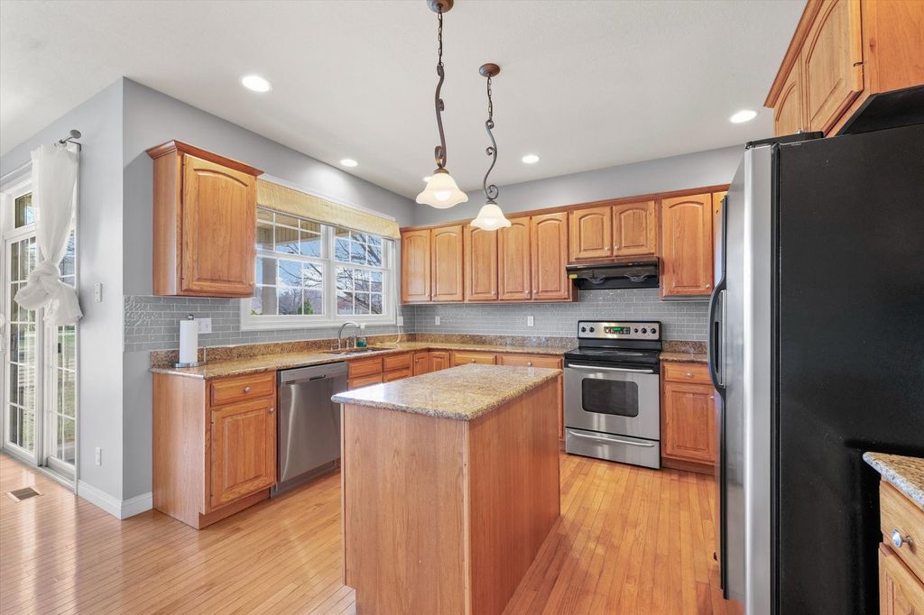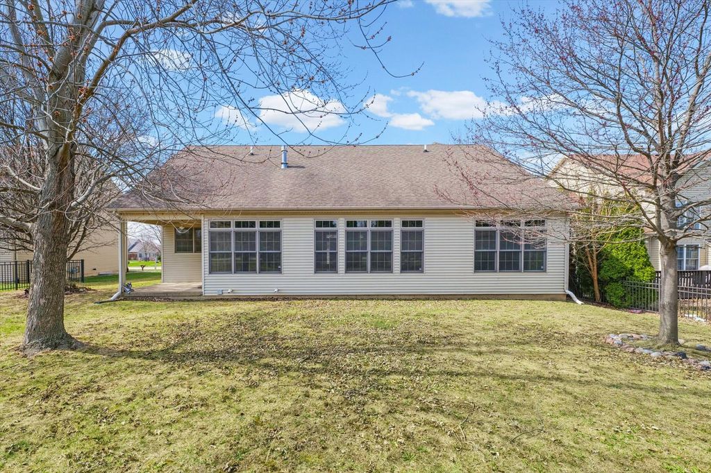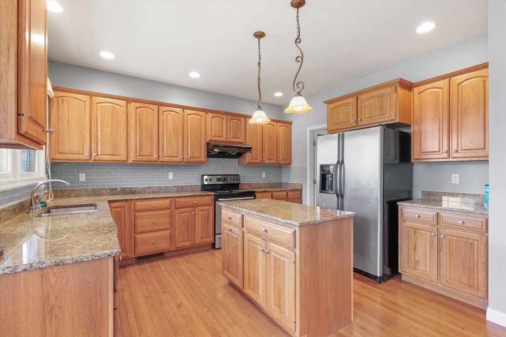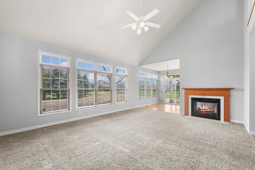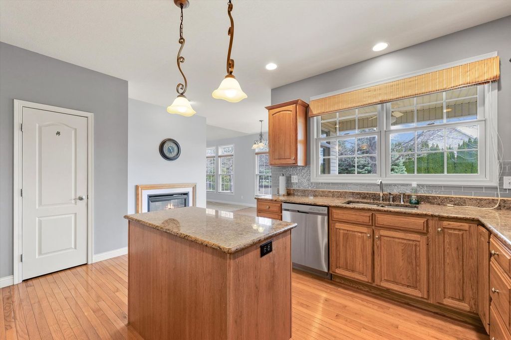 This stunning custom-built two-story home in Trails Edge offers an exceptional open floor plan designed for both comfortable living and effortless entertaining. The main level features a spacious first-floor master suite complete with a walk-in closet and a luxurious full bath. A beautifully appointed kitchen showcases granite countertops, stainless steel appliances, and a striking two-way gas fireplace that opens to the inviting living room. The home is filled with natural light from impressive floor-to-ceiling windows and enhanced by elegant hardwood flooring and a cathedral ceiling. Upstairs, a versatile loft provides additional living space. The expansive finished basement includes a fifth bedroom, full bath, large family room, execise room, and ample storage-perfect for guests or recreation. Additional highlights include a heated three-car garage, central vacuum system, and thoughtfully designed living spaces throughout. Outdoor living is equally impressive, with a covered porch and professionally landscaped yard backing to a peaceful commons area, offering both privacy and scenic views.