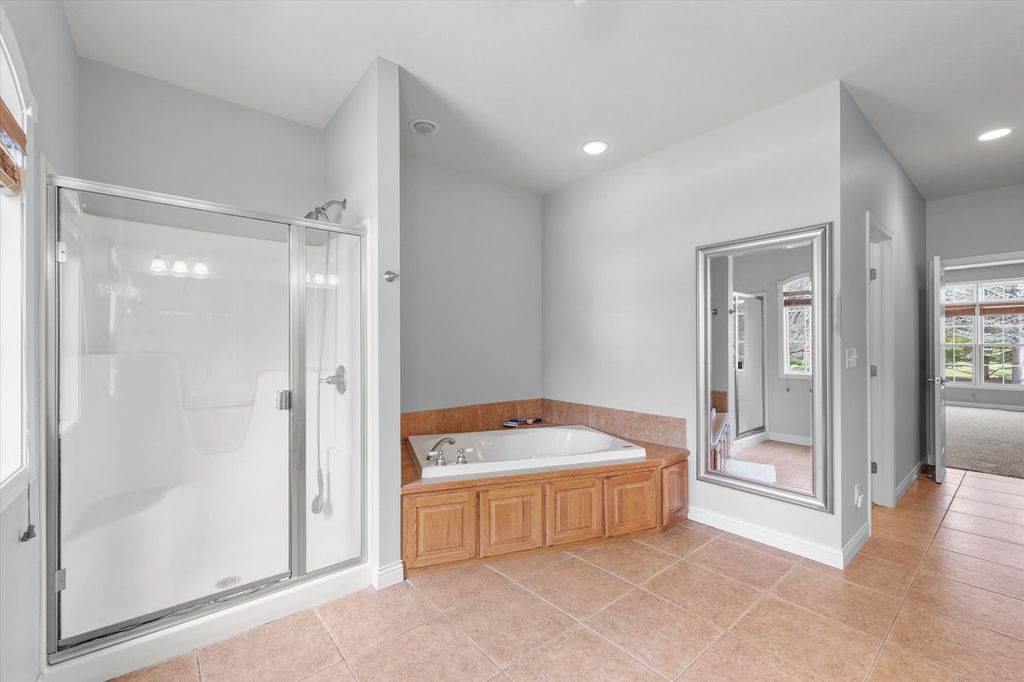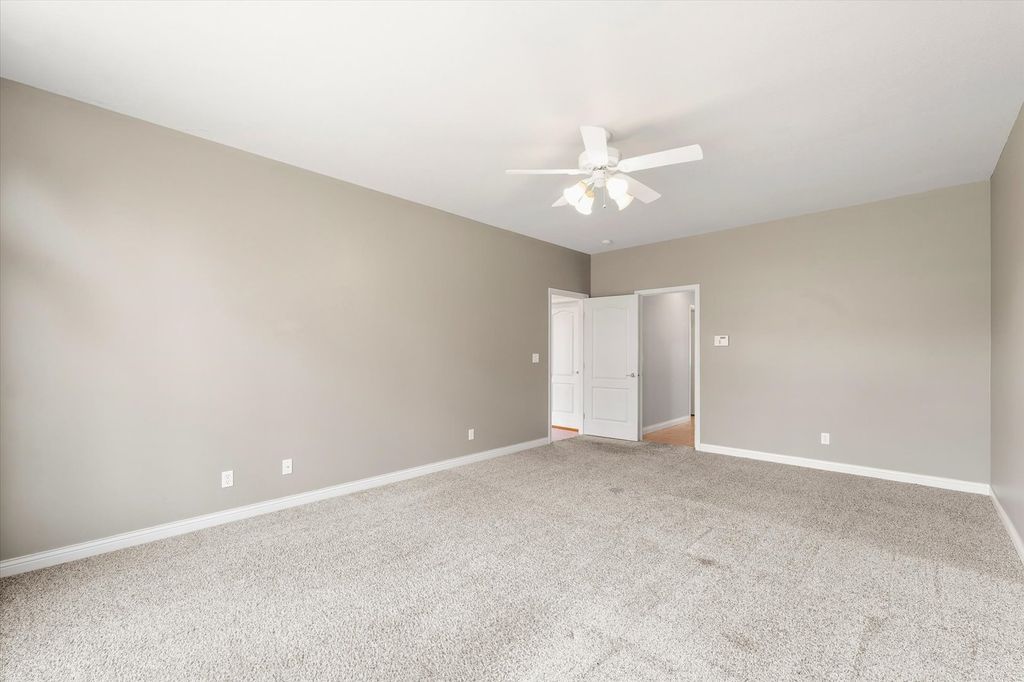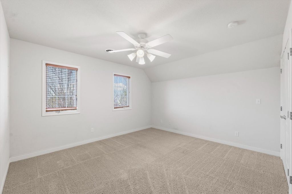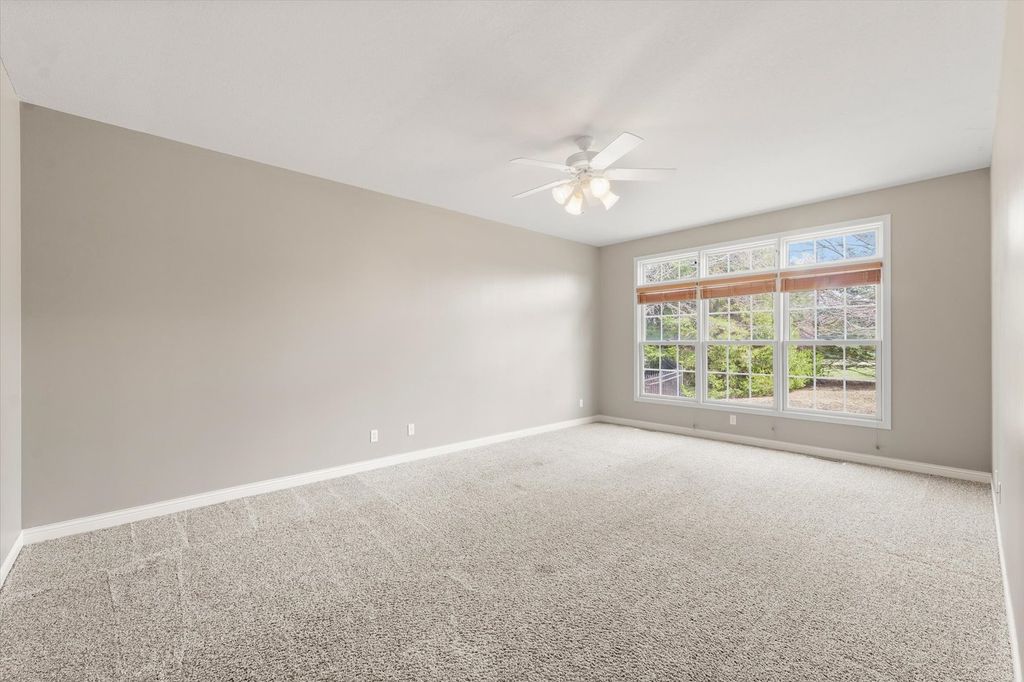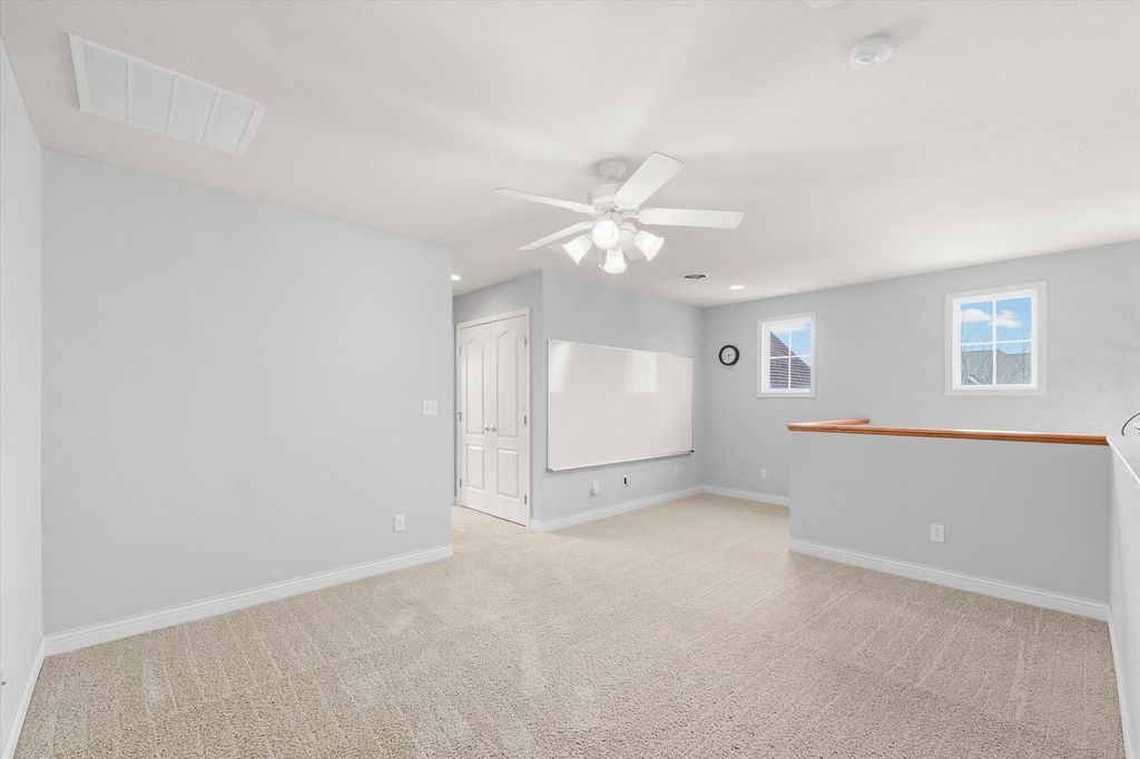 This stunning custom-built two-story home in Trails Edge offers an exceptional open floor plan designed for both comfortable living and effortless entertaining. The main level features a spacious first-floor master suite complete with a walk-in closet and a luxurious full bath. A beautifully appointed kitchen showcases granite countertops, stainless steel appliances, and a striking two-way gas fireplace that opens to the inviting living room. The home is filled with natural light from impressive floor-to-ceiling windows and enhanced by elegant hardwood flooring and a cathedral ceiling. Upstairs, a versatile loft provides additional living space. The expansive finished basement includes a fifth bedroom, full bath, large family room, execise room, and ample storage-perfect for guests or recreation. Additional highlights include a heated three-car garage, central vacuum system, and thoughtfully designed living spaces throughout. Outdoor living is equally impressive, with a covered porch and professionally landscaped yard backing to a peaceful commons area, offering both privacy and scenic views.