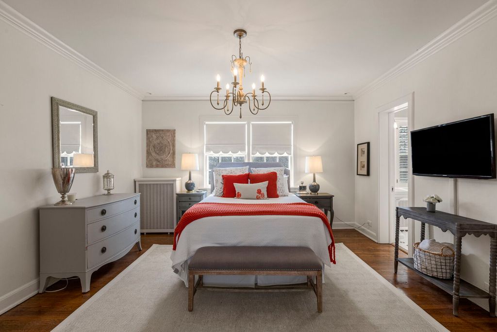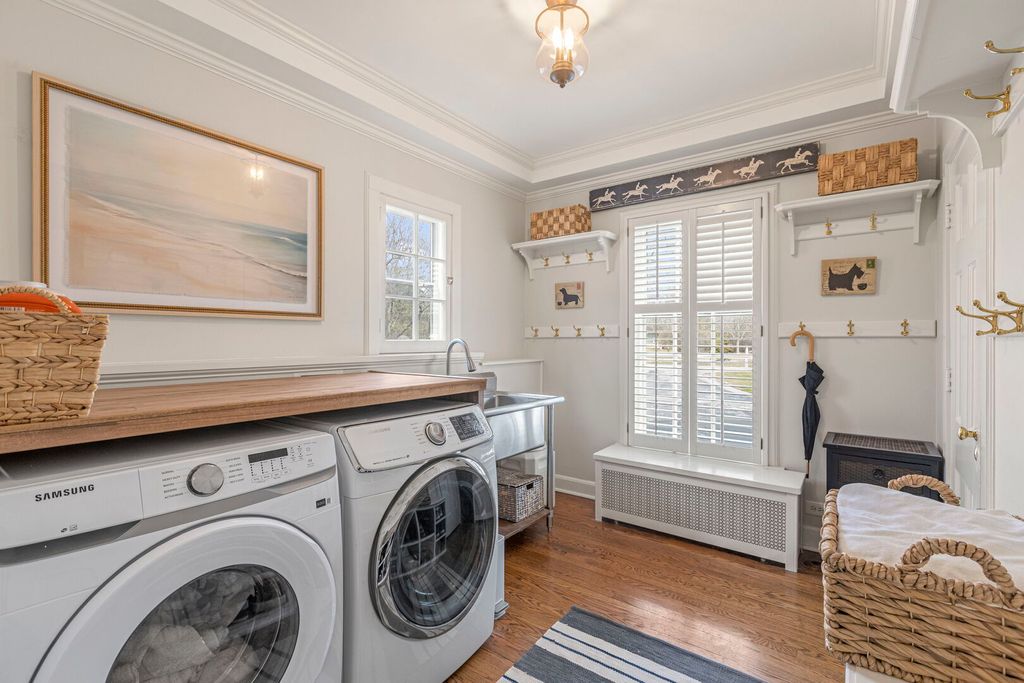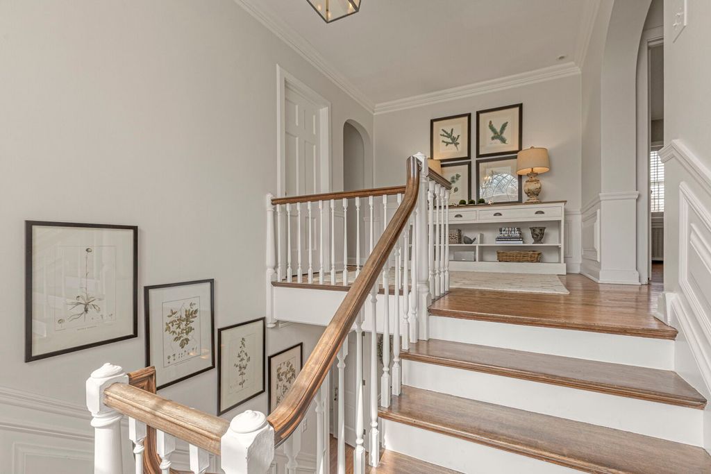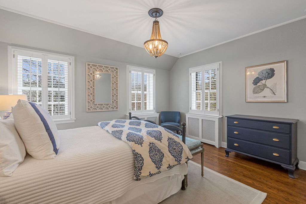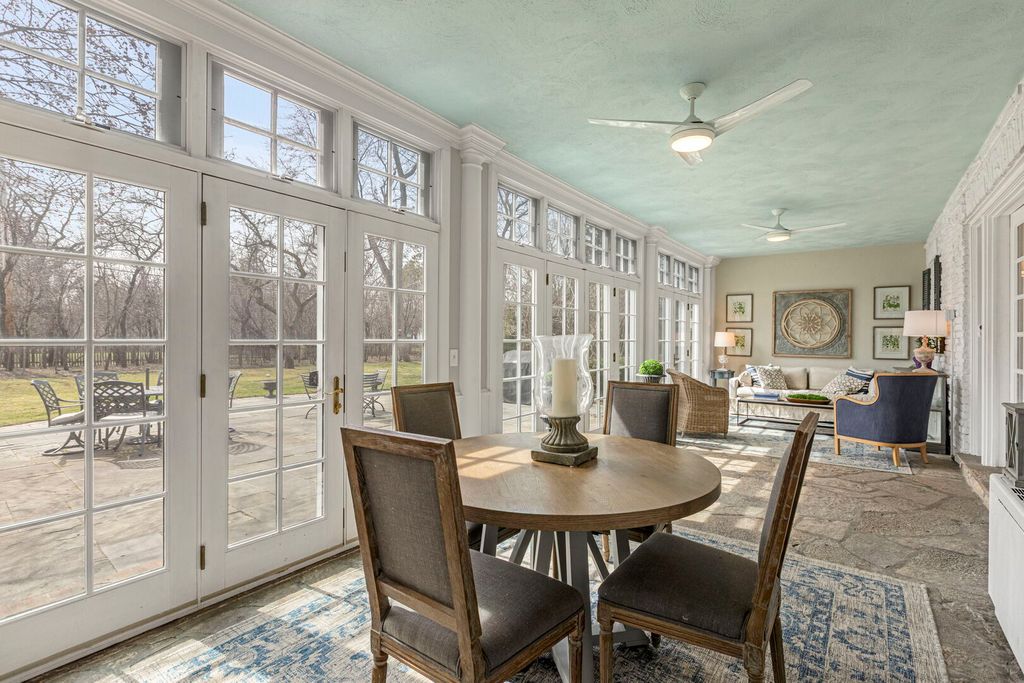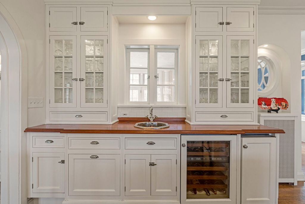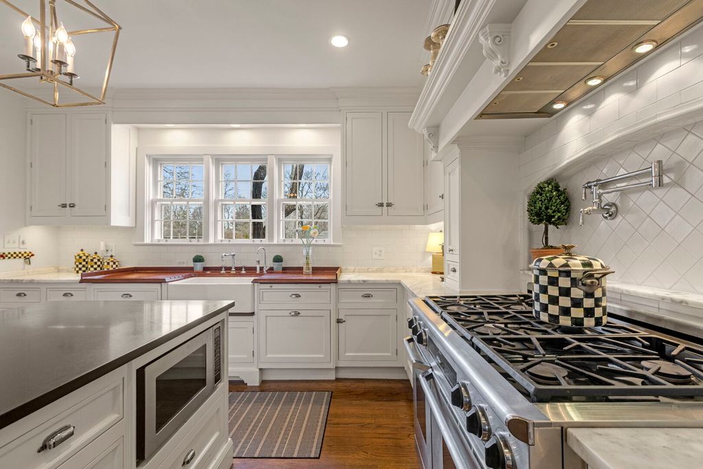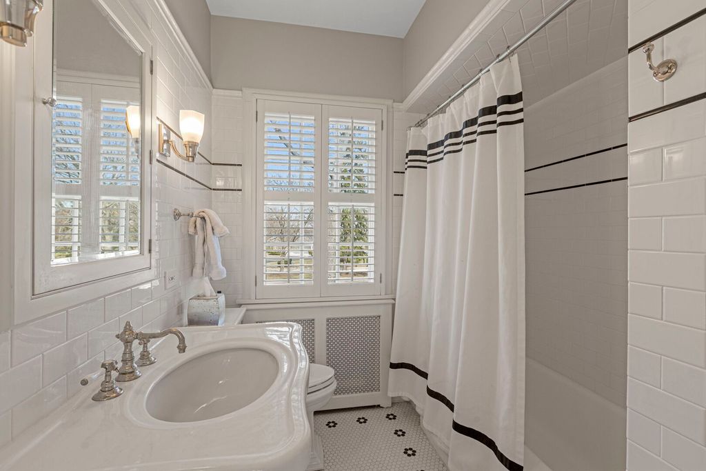 Designed by the highly regarded architect Stanley Anderson and built in 1930, this classic Colonial Revival estate in North King Muir represents one of Lake Forest's finest examples of preserved historic architecture. Restored to its original splendor and meticulously reimagined for contemporary living, the residence spans over 5,200 square feet with multiple light-filled spaces for entertaining within its historic proportions. A circular drive and Lannon stone and brick facade offer a commanding presence before one even reaches the front door. Inside, impeccable bones and vintage character throughout: hardwood floors, mouldings, wainscotting, arched doorways, original re-plated brass hardware. The main level flows beautifully from the grand foyer to a front office/den, sunny living room, and spacious dining room. Extending from the living and dining rooms, the heated sunroom creates a year-round connection to the grounds and opens to the bluestone patio just beyond. The classically inspired Christopher Peacock kitchen is the heart of the home. Commercial-grade appliances, abundant cabinetry, marble, granite, and teak countertops, two sinks and a generous center island anchor the space. A thoughtfully placed pantry with barn door rests off the kitchen, as does a breakfast room which opens directly into the family room via a charming cased pass-through bar. A bonus room with an ideal first-floor guest bedroom or office, large sunny laundry room, and full bathroom complete the first floor. Upstairs, five generously sized bedrooms each enjoy their own ensuite bath featuring vintage-style tile and traditional details. One bedroom opens onto a deck overlooking the yard. The primary suite functions as its own private wing: a boutique-worthy walk-in closet and dressing area, a fully remodeled spa-inspired bath, a private staircase to the kitchen below and a view overlooking the backyard. Outside, an expansive bluestone patio opens to a professionally landscaped lawn framed by a wooded setting and wrought iron fence, creating a true private sanctuary on nearly an acre. A two-car garage, full basement, and a long list of upgrades complete this extraordinary property.