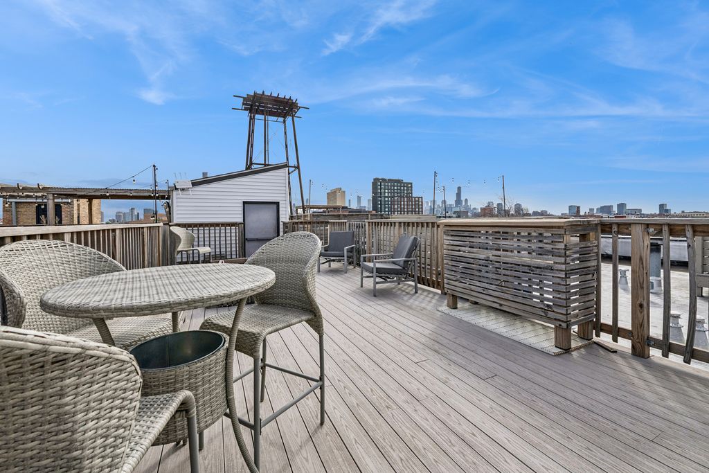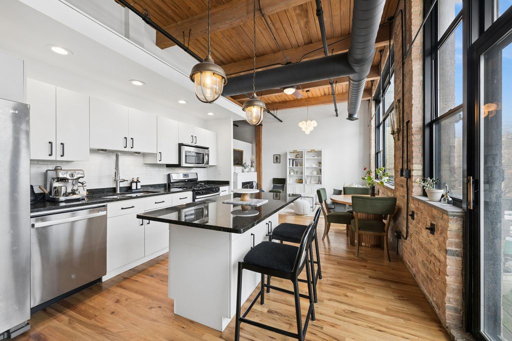 Exquisite brick & timber loft in the heart of Wicker Park! This stunning unit features large black-framed windows that flood the space with abundant natural light. The open floor plan is perfect for entertaining and includes a cozy fireplace, a large balcony, an updated kitchen with new backsplash and updated hardware, and high-end lighting throughout. Additional highlights include refinished hardwood floors, new doors and hardware, fresh paint, and dramatic exposed ductwork. The primary bedroom is fully enclosed with new light-filled windows and an updated en-suite bath, complemented by custom built-in closets. Additional features include a second bedroom with a barn door, an updated powder room, in-unit laundry, and an assigned, gated parking spot. The building offers a common rooftop deck with amazing city views, additional basement storage, a bike room, and secured entry. Nestled on a quiet tree-lined side street, you're just steps from popular restaurants, coffee shops, shopping, and entertainment along Division, Milwaukee, and Damen. Enjoy easy access to Wicker Park, Farmers Market, The 606, Jewel, the CTA Blue Line, Pritzker Elementary & I-90!