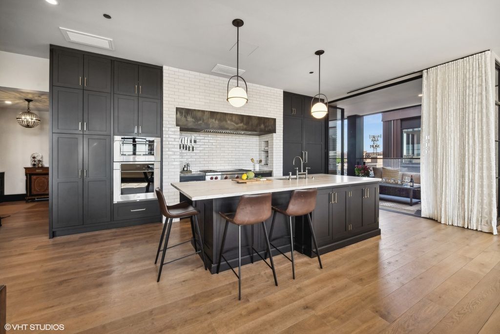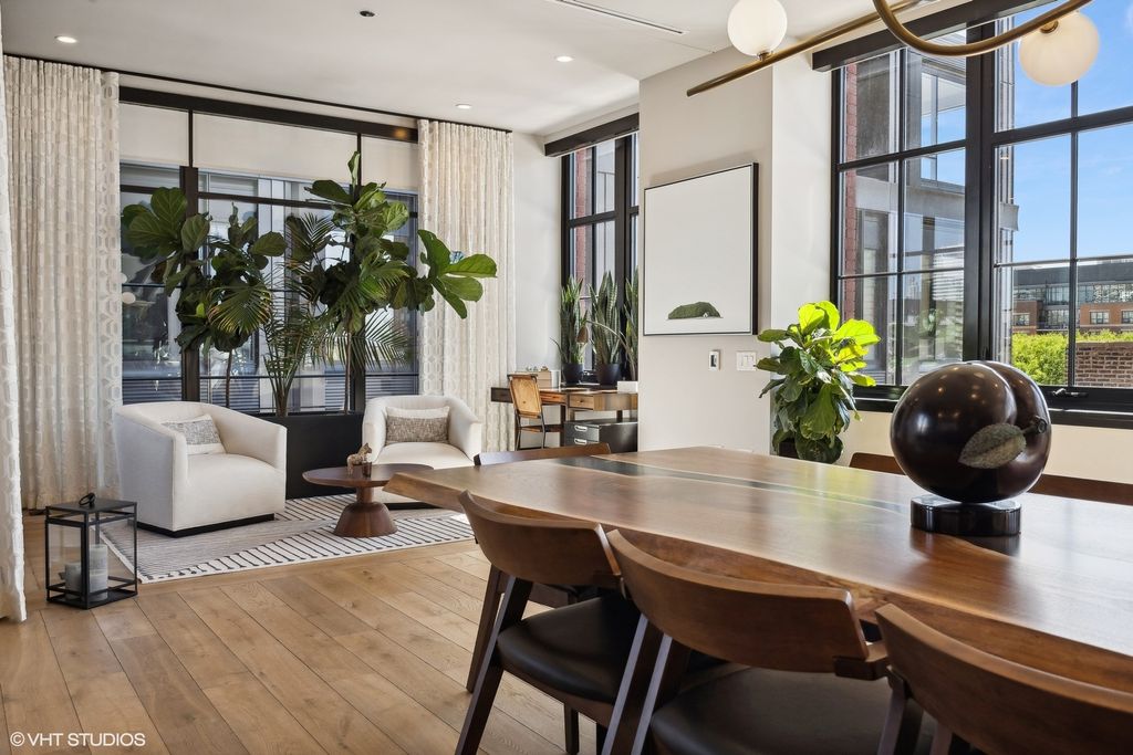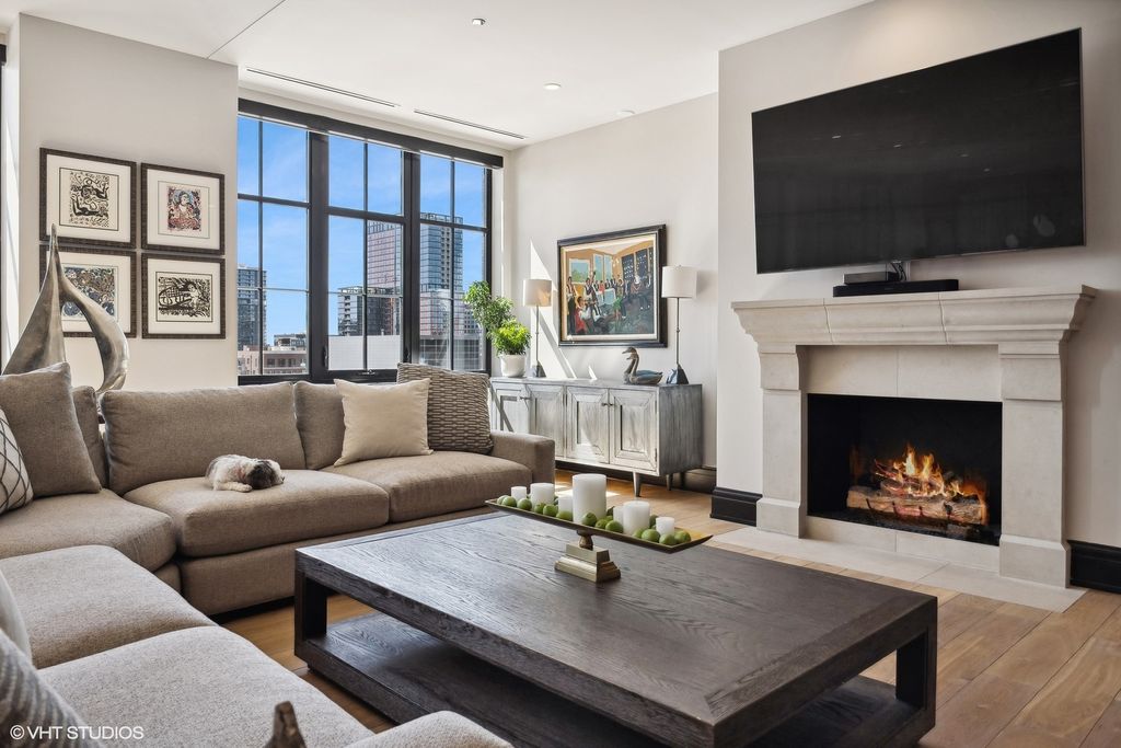 Exquisitely designed with the finest finishes, this spectacular residence is located on the most desirable southwest corner of The Hayden in the heart of the West Loop. A private elevator entry welcomes you into this incredible, light-filled 38 ft wide floor plan with an expansive wall of windows that flood the space with natural sunlight. Captivating Stoneham European hardwood flooring throughout complemented by the grand 10-foot ceilings that enhance the sense of spaciousness. The phenomenal living space flows together flawlessly: a living room with limestone gas fireplace, a dining area anchored with a gorgeous new chandelier and ample space to entertain on a large scale. Tastefully appointed, the kitchen features leather Macuba quartzite countertops, Bentwood cabinets with gold brass hinges, an oversized island/breakfast bar with slab quartzite counter anchors this kitchen. The range is the center piece with zinc accents and glazed brick tiles. Top-of-the-line appliances including a built-in Wolf espresso coffee maker, Subzero fridge, and a Wolf range and wine chiller, and a wet bar with an additional sink. With convenient access from the kitchen, the oversized terrace with Nana wall system is a welcome extension of the living and entertaining spaces creating a seamless indoor/outdoor experience. The primary suite features new Ralph Lauren wallpaper, a customized elegant walk-in closet and a luxurious ensuite bath with Calcutta Delicato slab marble counters, Tribeca tub, separate oversized shower, dual vanity, and private commode. Two additional graciously sized bedrooms offer ample closet space and beautiful ensuite baths. A powder room with natural stone counters and antique brass finishes is convenient for guests. A large laundry room with LG washer/dryer, a sink, and ample cabinet space completes the living space. Lutron automation shades and Crestron home automation system allows you to control the entire residence and customize it for your needs. Enjoy the highest quality designer home all within walking distance to the finest restaurants, nightlife, parks, playgrounds, and neighborhood amenities Chicago has to offer. Additional information on the home finishes available upon request. The building features a 24hr door staff. Two private indoor heated side-by-side parking spaces included.