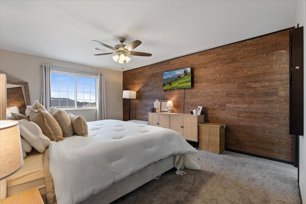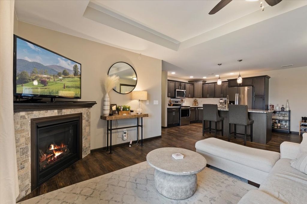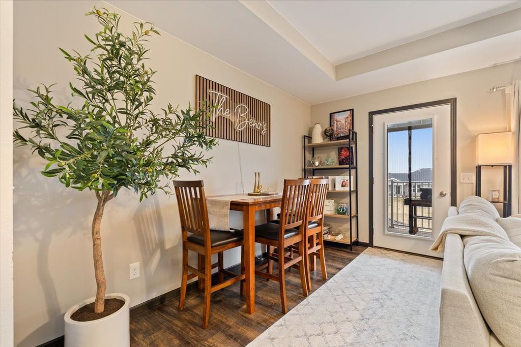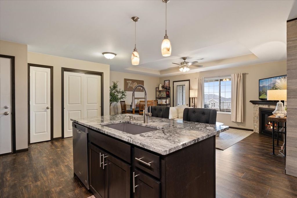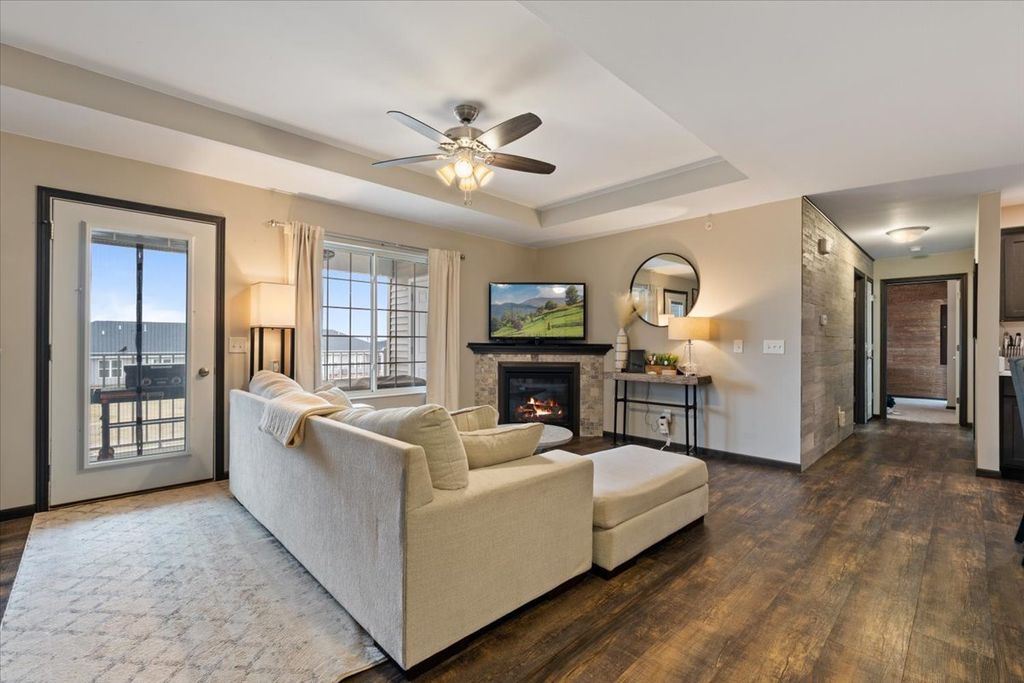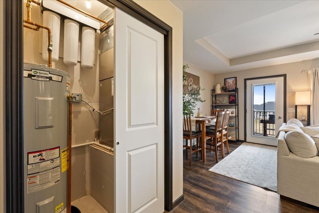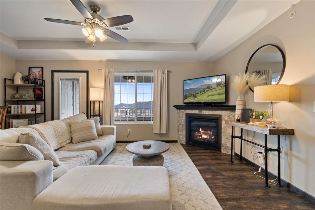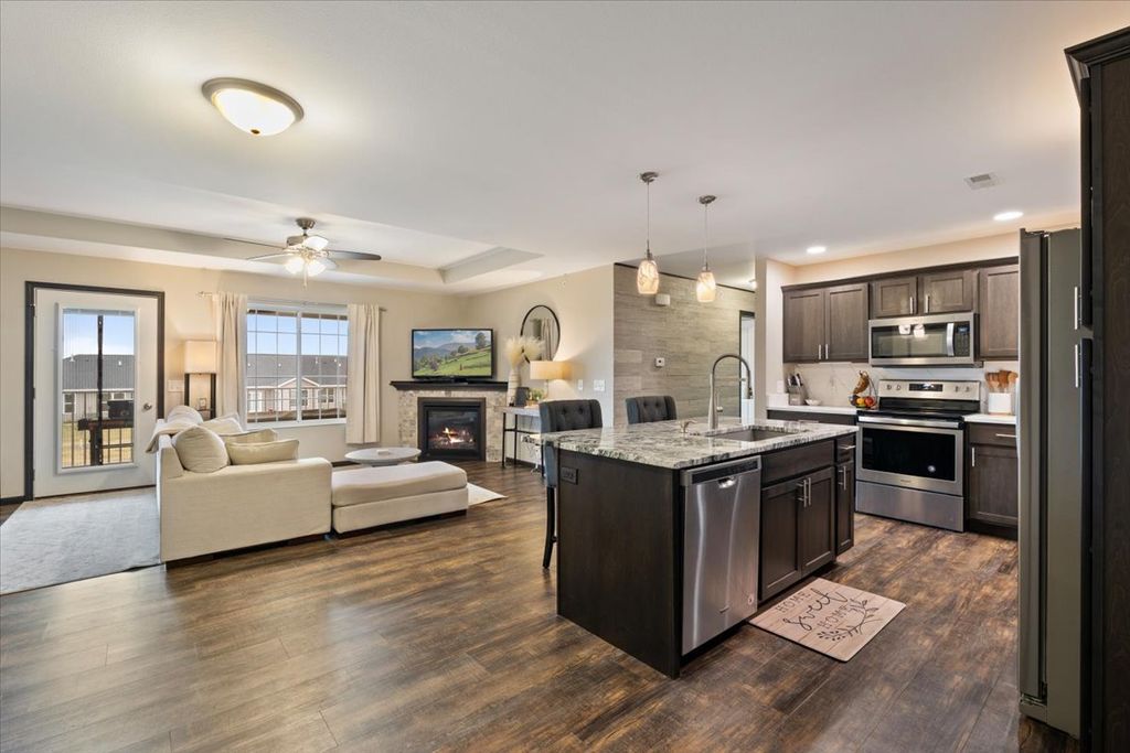 Welcome home to this beautifully maintained 2-bedroom, 2-bathroom second-floor condo in the desirable Eldridge community! Built in 2016, this newer construction offers modern finishes, stylish touches, and comfortable, low-maintenance living. Step inside to find a bright and inviting living space filled with natural light and enhanced by tasteful, well-chosen decor that adds a warm and sophisticated feel throughout. The open-concept layout flows seamlessly into the kitchen, where you'll love the stainless-steel appliances, a spacious kitchen island with a built-in sink on a granite countertop along with quartz on the other countertops. And ample cabinetry-perfect for both everyday living and entertaining. 2025 water filtration system for clean water! The primary suite offers a private full bathroom and generous closet space, creating a relaxing retreat. A second bedroom and full bath provide flexibility for guests, a home office, or additional living space. Enjoy the convenience of a 1-stall garage and a large private deck with two storage closets. All within close proximity to parks, shopping, and dining. Located in the highly sought-after North Scott School District, this condo truly checks all the boxes. Don't miss your chance to own this move-in ready home with style and comfort-schedule you're showing today! Seller reserves - storage shelfs in garage, portable fan in garage, deep freezer in garage, mirror in primary bedroom on wall, and all curtains) Seller will leave - Curtain rods, table in garage, water filtration system, both bedroom TVs and mounts.