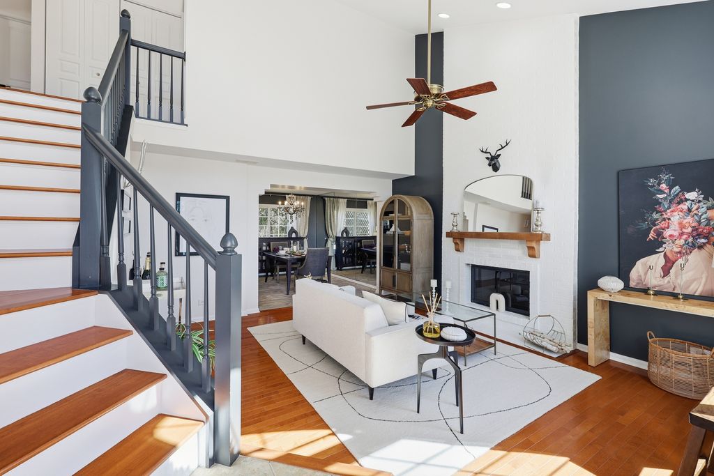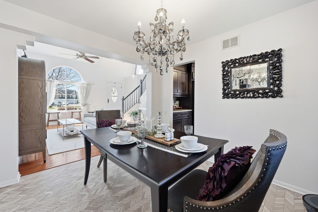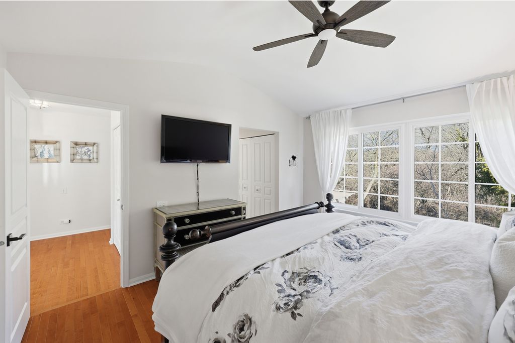 This home shows like a model! Gorgeous 3-bedroom, 2.5 bath home backing to open wooded space in a quiet Bartlett neighborhood. The open and airy floorplan features abundant natural light, a dramatic 2story living room, and vaulted ceilings in the primary bedroom. The fully remodeled kitchen offers 42" cabinets, stainless steel appliances, solidsurface counters, a breakfast bar, and beautiful tile work. Hardwood flooring and a cozy brick fireplace add warmth and charm. Modern bathrooms and quality finishes are found throughout. Freshly painted and beautifully decorated, this home is truly movein ready. The fully finished basement includes a large recreation room and an impressive full bath with a soaking tub and separate shower-perfect for guests or additional living space. Major updates include a new AC (2024), roof (2020), and water heater (2020). Enjoy serene, wooded views from the spacious deck-ideal for entertaining or relaxing. Impeccably maintained and close to parks, schools, Metra, shopping, and more. Welcome Home!