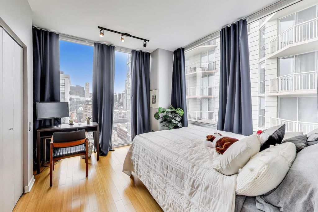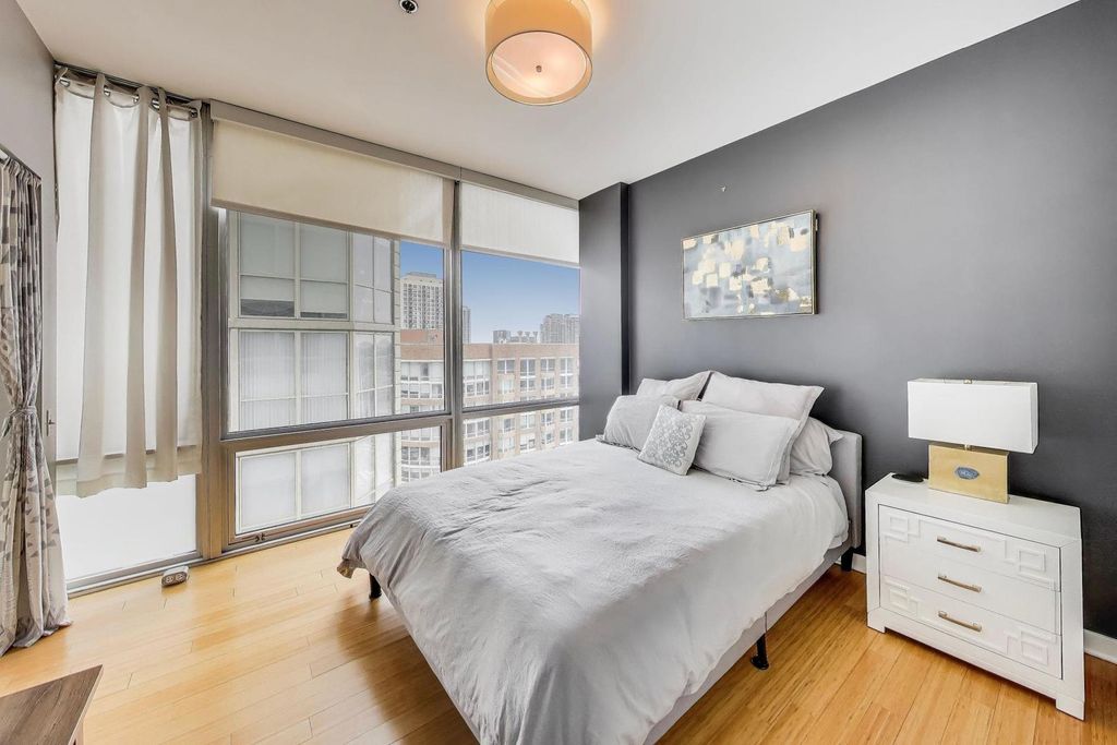 High floor corner unit at Kingsbury on the Park. Iconic steel and glass tower with sweeping views of city and Montgomery Ward Park. Located in prime River North neighborhood known for dining, entertainment and a sophisticated urban lifestyle. Open floorplan with floor-to-ceiling windows and large balcony. Kitchen features Bulthaup cabinets, stainless steel appliances, large granite kitchen island, window treatments, in-unit washer/dryer, custom shades and hardwood floor throughout. Primary bedroom boasts 2 walk-in closets and ensuite bath with separate tub and shower. Building amenities include 24 hour door staff, onsite property management, newly renovated lobby, updated fitness room, bike room and storage locker. Walking distance to Riverwalk, park, playground, dining, shopping, nightlife, art galleries and public transportation. Easy expressway access and walkable to Loop and downtown. Large indoor heated prime parking space on 1st floor included. Don't miss out to live in one of Chicago's most desirable neighborhoods!