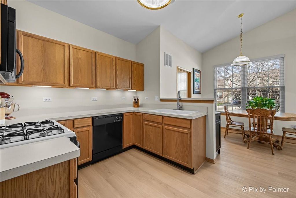 Welcome home to this beautifully maintained ranch end unit in the Fieldstone subdivision, full of natural light and move-in ready. The open floor plan flows effortlessly from the kitchen, featuring abundant cabinet space, a pantry, and an eating area into the bright and airy living room with vaulted ceilings and floating walls. Brand new luxury vinyl plank flooring runs throughout, giving the home a fresh, modern feel. The primary suite features double closets, a walk-in shower with a built-in shower seat, and a linen closet. The hall bath has been recently updated with a new comfort-height toilet and showerhead. Step outside to your private patio right off the living room, ideal for morning coffee, entertaining, or simply soaking up the outdoors. The two-car garage includes built-in shelving for plenty of extra storage. With no steps anywhere, not even at the entry, this home is perfectly suited for anyone seeking effortless, comfortable living. Conveniently located near Shales Parkway, Chicago Street, and Schaumburg Road. Don't miss out! End units like this don't last long!