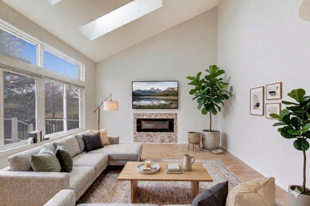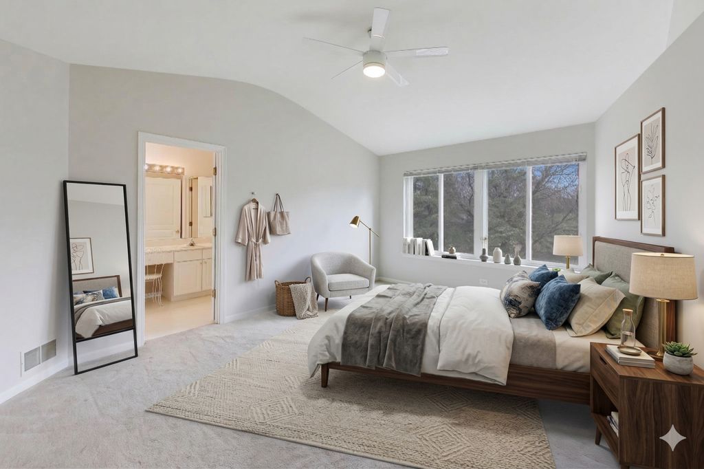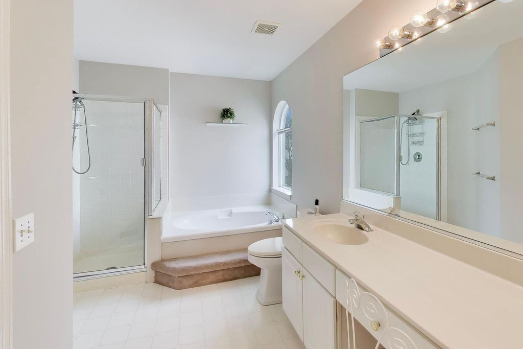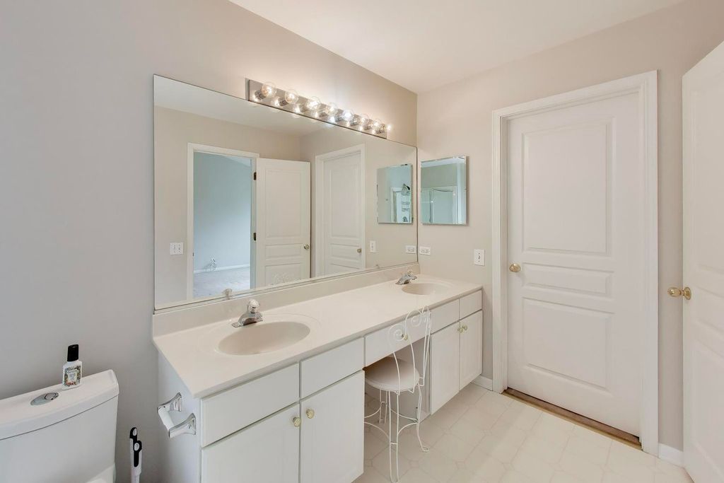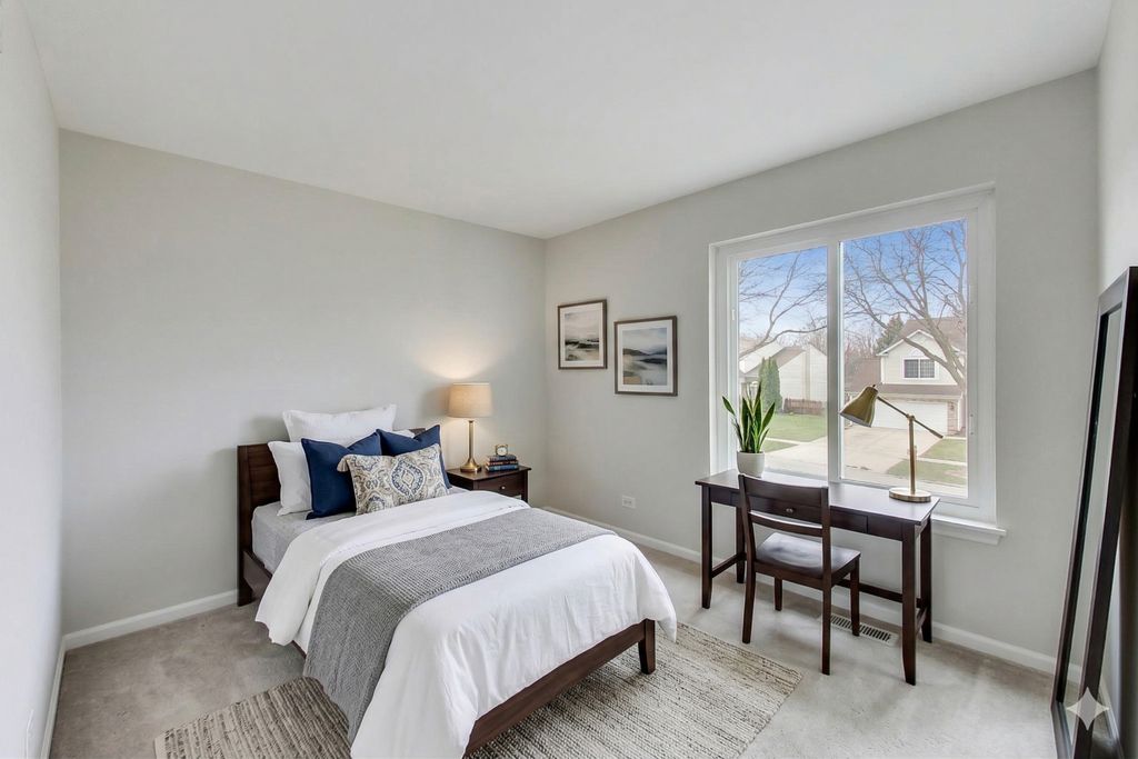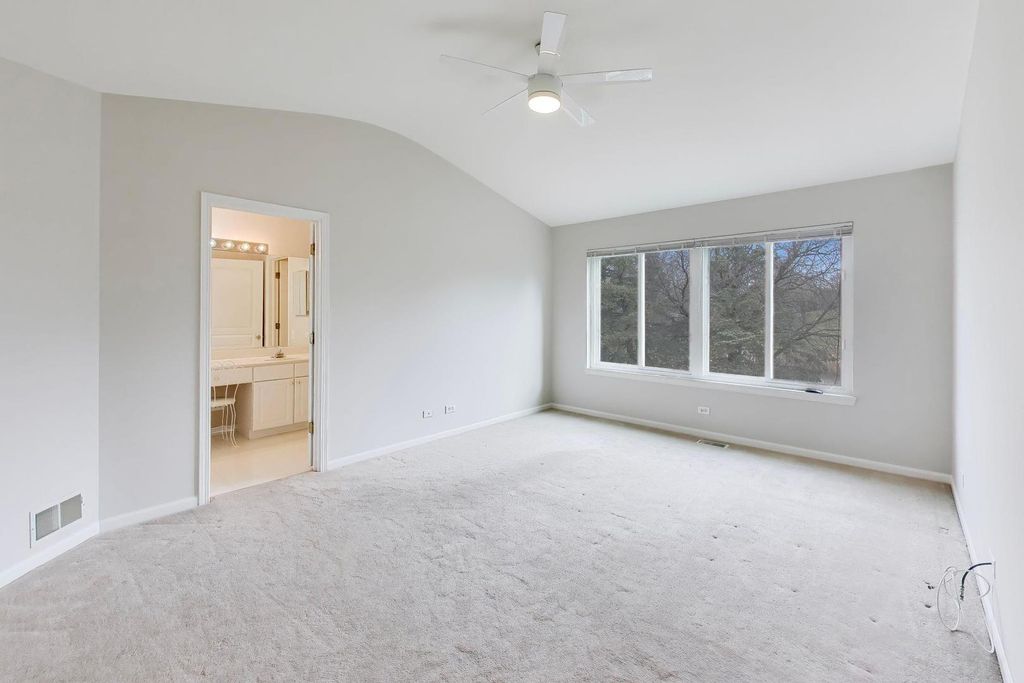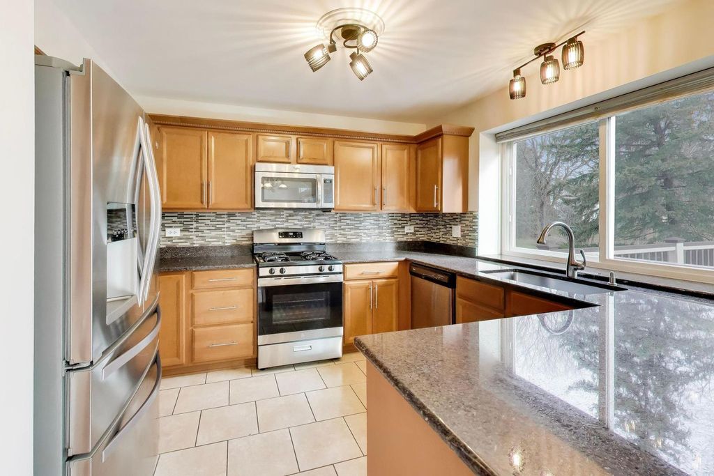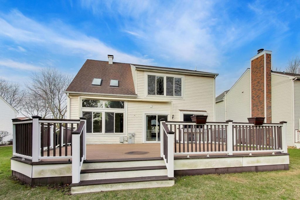 Welcome to this stunning 2-story home offering 4 bedrooms, 2.5 bathrooms, and over 2,100 sq ft of beautifully updated living space, plus a fully finished basement - all set on a premium lot with breathtaking pond and golf course views. Step inside to a bright and airy main level featuring hardwood floors throughout, soaring cathedral ceilings, and skylights that flood the home with natural light. The open-concept layout is perfect for both everyday living and entertaining, with a spacious family room, electric fireplace, and oversized windows, including elegant Palladian windows. Double sliding glass doors lead you seamlessly to the outdoor living space. The kitchen is a true centerpiece, showcasing maple cabinetry with dentil molding, granite countertops, stainless steel Whirlpool appliances (including a new stove), a stainless steel apron-front sink, Moen Arbor pull-down faucet, pantry closet, and a large island with seating. Enjoy serene views through the double window overlooking the backyard, pond, and golf course. Upstairs, the primary suite offers a private retreat with high ceilings, abundant natural light, a walk-in closet with custom closet system, and beautiful views. The spa-like en-suite bathroom features a double vanity with a seated prep area, a separate soaking tub, and a walk-in shower. The second level also includes 2 additional bedrooms and a stylish overlook with wood balusters. The fully finished basement provides exceptional additional living space, complete with a large entertainment area featuring an electric fireplace, an additional bedroom, and a versatile flex room perfect for a home office, gym, or guest suite. Step outside to a large composite deck overlooking the scenic backyard, where you can relax or entertain while taking in peaceful water and golf course views. Additional highlights include fresh paint throughout, custom closet systems in every closet, 3-panel white interior doors, main-floor laundry with Amana washer & dryer, and a 2-car garage. This home offers the perfect blend of space, style, and location - a rare opportunity you won't want to miss.