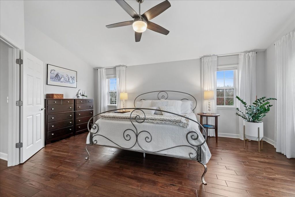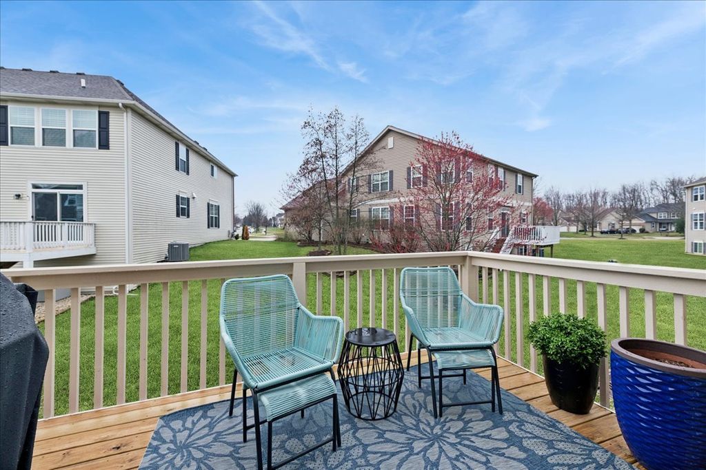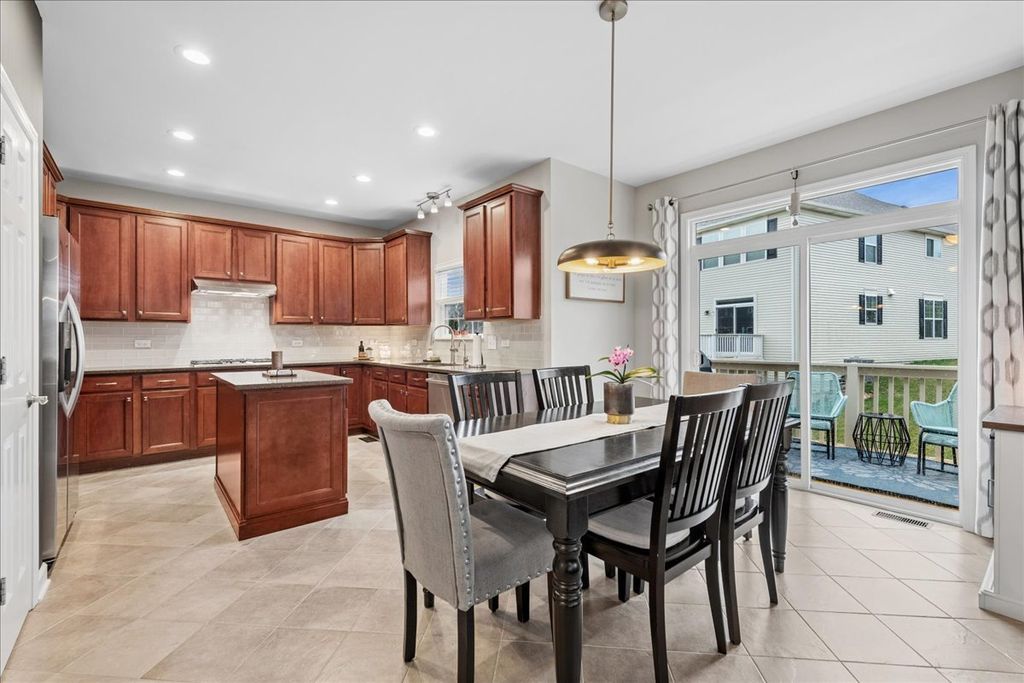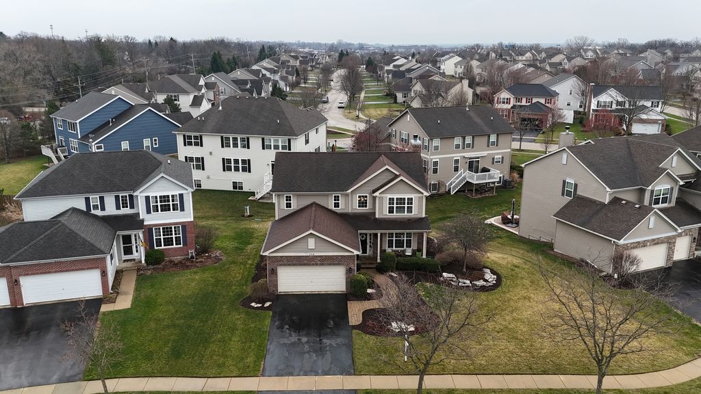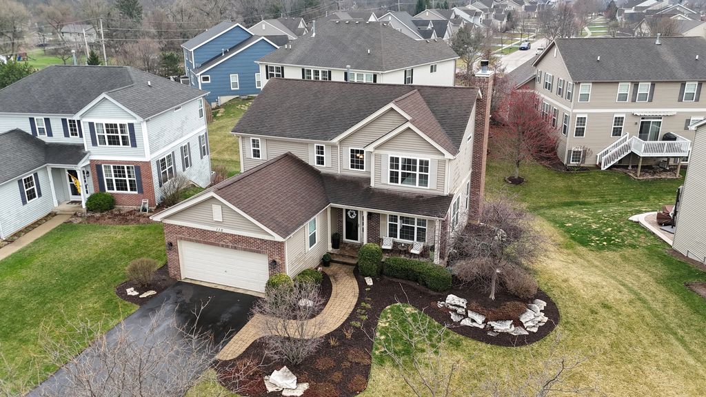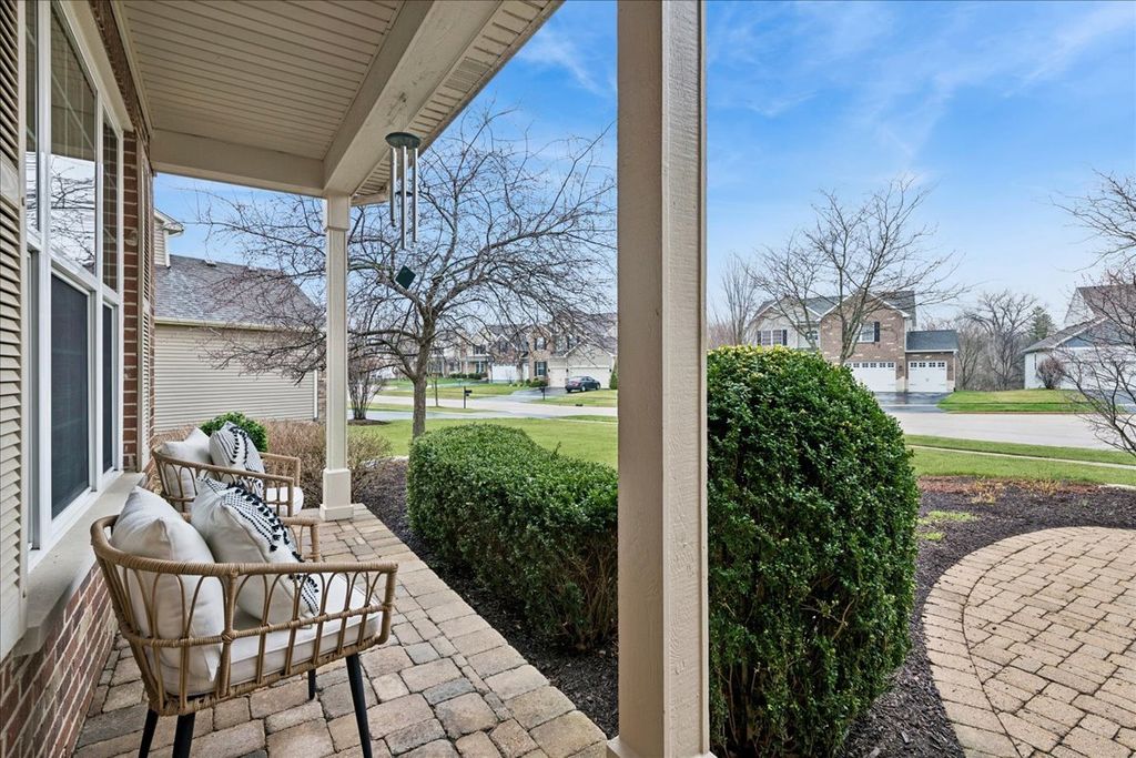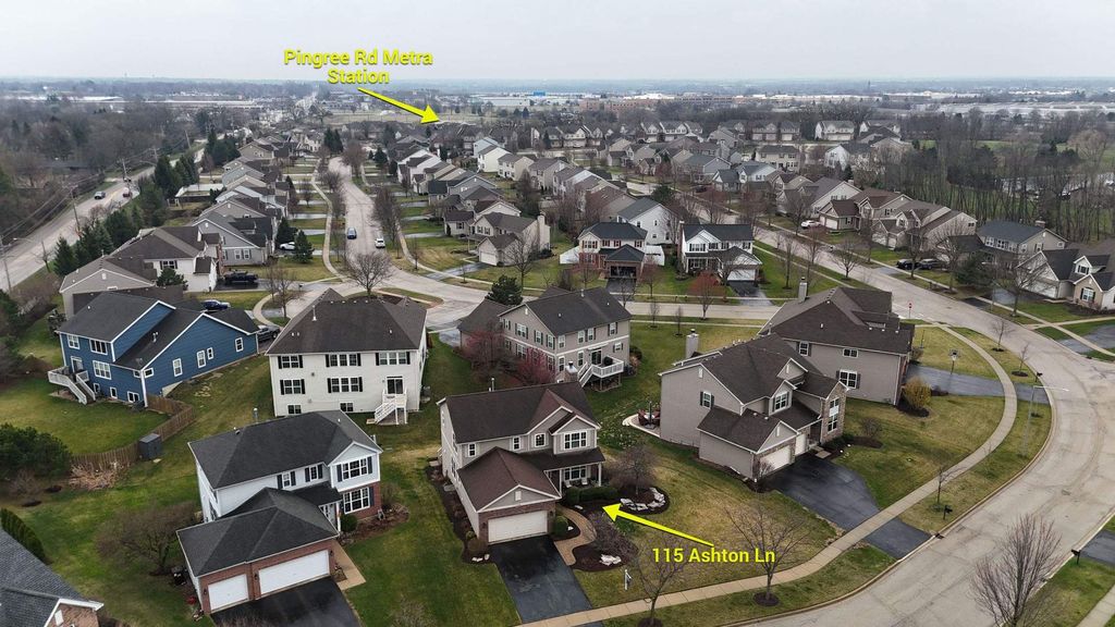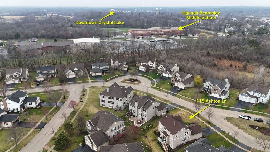 Located in the highly sought-after Ashton Pointe subdivision of Crystal Lake, this meticulously maintained 2-story home-offered by its original owners-beautifully blends thoughtful design, quality updates, and an unbeatable location. From the moment you arrive, the home makes a lasting impression with its inviting curb appeal, highlighted by a covered front porch and classic brick front facade, all set on a quiet cul-de-sac. Step inside to a spacious and welcoming foyer that opens to a bright, open-concept floorplan designed for both everyday living and entertaining. The main level is accented by stunning hand-scraped hardwood floors, elegant white trim, neutral tones, and tasteful finishes throughout. The front living space features white glass-paneled French doors that create a seamless transition into the warm and inviting family room, where a beautiful wood-burning fireplace with wood mantle serves as the focal point. The kitchen is both stylish and functional, featuring rich cabinetry, quartz countertops, stainless steel appliances, double oven, cooktop with hood, tiled backsplash, and a pantry, all flowing effortlessly into the dining area accented with elegant wainscoting. Upstairs, the home continues to impress with hardwood flooring throughout and a versatile loft space ideal for a home office, playroom, or additional lounge area. The spacious primary suite offers a vaulted ceiling, dual closets, and a well-appointed en-suite bath complete with double vanities, separate shower, and jetted tub. The secondary bathroom has been attractively updated. The spacious loft provides valuable flex space for a home office, lounge, or play area, and can be easily converted into a 4th bedroom in line with the home's original design. The finished lookout basement delivers exceptional additional living space with a modern industrial feel, featuring an exposed black ceiling, expansive recreation area, dedicated exercise space, full bathroom, and ample storage. Additional highlights include a beautifully updated powder room with shiplap detail, a well-designed laundry room with elevated washer/dryer, built-in shelving, cabinetry, countertop workspace, and wall hooks, as well as a striking staircase with wrought iron spindles that anchors the home's design, and an RO system for kitchen refrigerator & faucet. Step outside to enjoy the newly installed deck and staircase overlooking a professionally landscaped yard with full foundation plantings-creating an ideal setting for both relaxation and entertaining. All of this in an unbeatable location-just a short walk to the Pingree Rd Metra station with direct subdivision access, and minutes to Route 14, Route 176, downtown Crystal Lake, shopping, dining, and entertainment.
