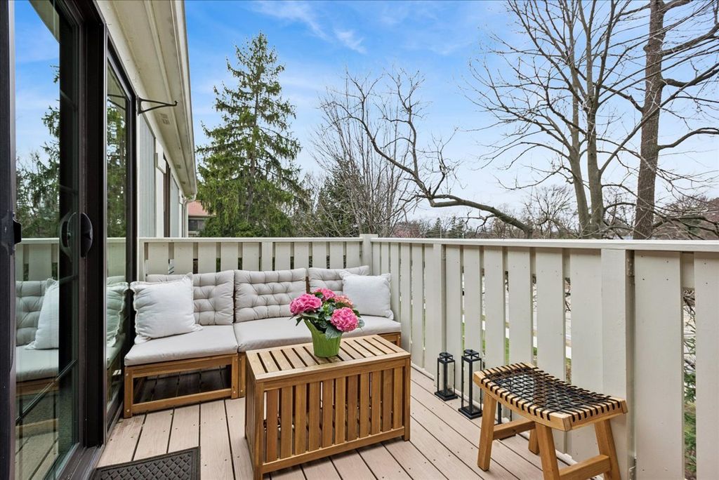 Tucked within the sought-after Adare Farms community, this inviting second-floor end unit offers a bright retreat with thoughtful updates throughout. Sunlight pours through multiple skylights, accentuating the soaring vaulted ceilings and creating a warm, open feel across the main living areas. Multiple sliding glass doors lead to a private balcony, perfect for unwinding at the end of the day. The expanded kitchen boasts updated cherry cabinetry, granite countertops, a large storage closet and ample breakfast table space. With two generously sized bedrooms and two updated full baths, the layout offers flexibility for an expanding family, guests, a home office, or a den. The primary suite features a generous walk-in closet, while the second bedroom includes unique character with a wood-burning fireplace and abundant closet space. Additional highlights include in-unit laundry, newer windows, upgraded white trim and doors, and a spacious private garage. Fresh, clean, and move-in ready, this home combines comfort and convenience and is just minutes from shopping, dining, parks, and Metra commuter access.
