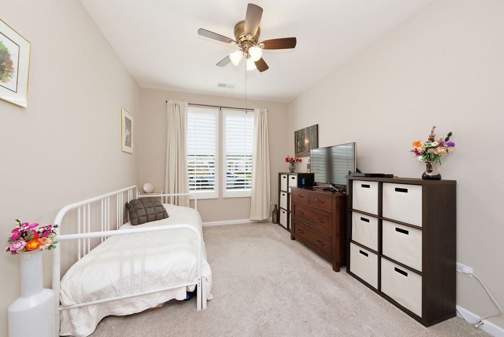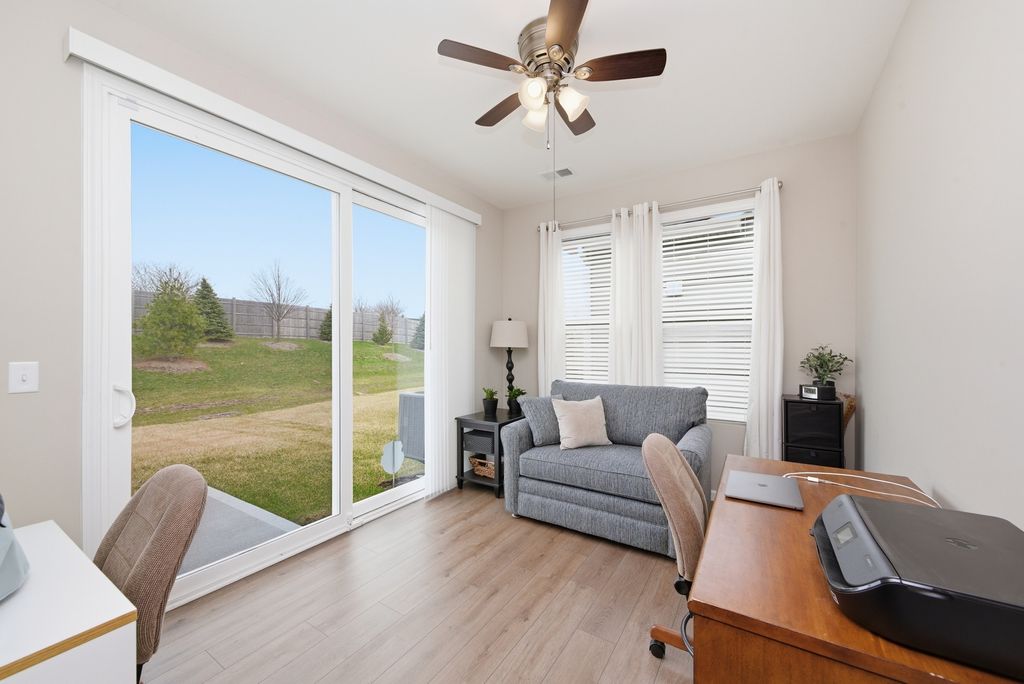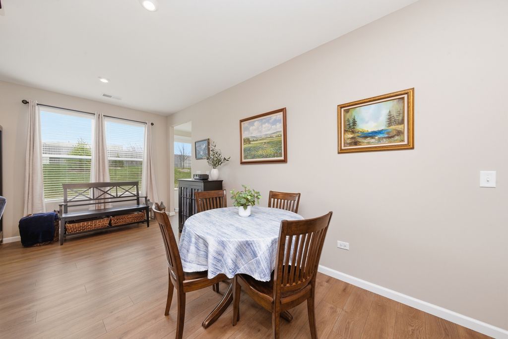 Welcome home to this nearly new ranch in Del Webb Lincoln Prairie, a vibrant and highly sought-after 55+ community where resort-style living meets everyday convenience. Skip the wait for new construction and step right into this beautifully upgraded Vista model, ideally located just moments from the impressive 16,000 sq. ft. clubhouse featuring indoor and outdoor pools, a state-of-the-art fitness center, social spaces, pickle ball and tennis courts, billiards, bocce ball, and more. Plus, enjoy the added convenience of nearby shopping, dining, and entertainment just a short drive away. *** Inside, the open-concept layout is enhanced by 9-foot ceilings and luxury vinyl plank flooring that flows seamlessly throughout the main living areas. The heart of the home is the stunning gourmet kitchen, showcasing 42" white cabinetry with crown molding, quartz countertops, a stylish tile backsplash, and an oversized island with upgraded pendant lighting, perfect for both entertaining and everyday living. Stainless steel appliances and a vented exterior hood complete this impressive space. The kitchen opens effortlessly to the expansive great room, filled with natural light, and flows into a bright and inviting sunroom-an ideal spot to enjoy your morning coffee or unwind at the end of the day. A sliding glass door leads to the oversized concrete patio, offering additional outdoor living space. *** The private primary suite is thoughtfully positioned away from the main living area and features a luxurious bath with a comfort-height dual vanity, walk-in shower, and a spacious walk-in closet. A second bedroom and full bath are located on the opposite side of the home, providing privacy for guests or a flexible space for a home office. *** This home truly stands out as better than new, offering numerous builder upgrades along with thoughtful enhancements completed after closing, including a full irrigation system, home security system with exterior cameras, Hunter Douglas window treatments, additional recessed lighting, upgraded HVAC with a 5" filter and whole-house humidifier, expanded low-voltage wiring with additional coax and ethernet ports, and an insulated garage and garage door. Lawn care and snow removal are covered by the HOA, allowing you to fully enjoy the low-maintenance lifestyle and exceptional amenities this community has to offer. Conveniently located with easy access to shopping, dining, and recreation, this is the perfect place to call home.
