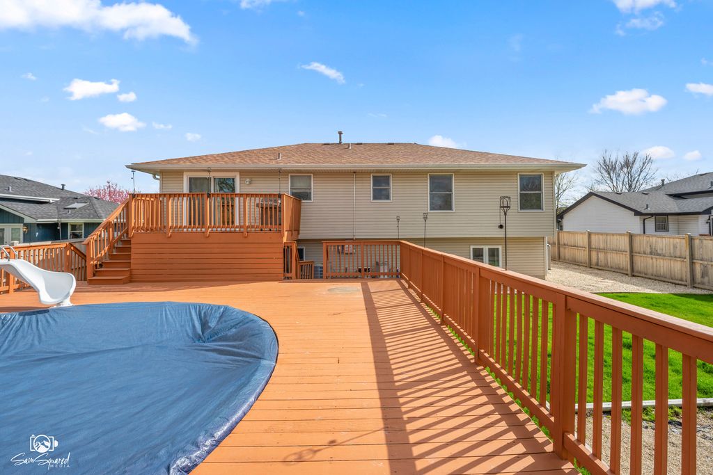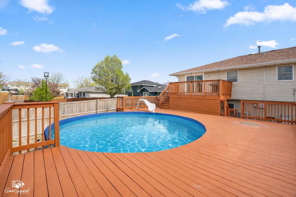 Welcome to this spacious 4-bedroom, 2-bath raised ranch offering over 2,500 square feet of comfortable living space, perfectly situated on a generous quarter-acre lot. This well-maintained home blends functionality and potential, making it an ideal opportunity for buyers looking to add their personal touch. The main level features a bright and inviting layout, while the finished basement provides additional living space complete with a cozy wood-burning fireplace-perfect for relaxing or entertaining. Step outside and you'll find a true backyard oasis. Enjoy summer days by the above-ground pool with a wraparound deck, all enclosed by a newer 2-year-old fence for added privacy. The outdoor space is ideal for gatherings, quiet evenings, or simply unwinding at home. Major updates and features include a newer roof (2020), garage door (approx. 4 years), refrigerator (7 years), dishwasher (5 years), and washer and dryer (6 years). A new humidifier was recently installed, adding comfort during colder months. Additional highlights include a newer pool liner (approx. 2 years), new pool filter, and hardwired security cameras. With solid bones, generous space, and standout outdoor living, this home offers incredible value and endless potential.