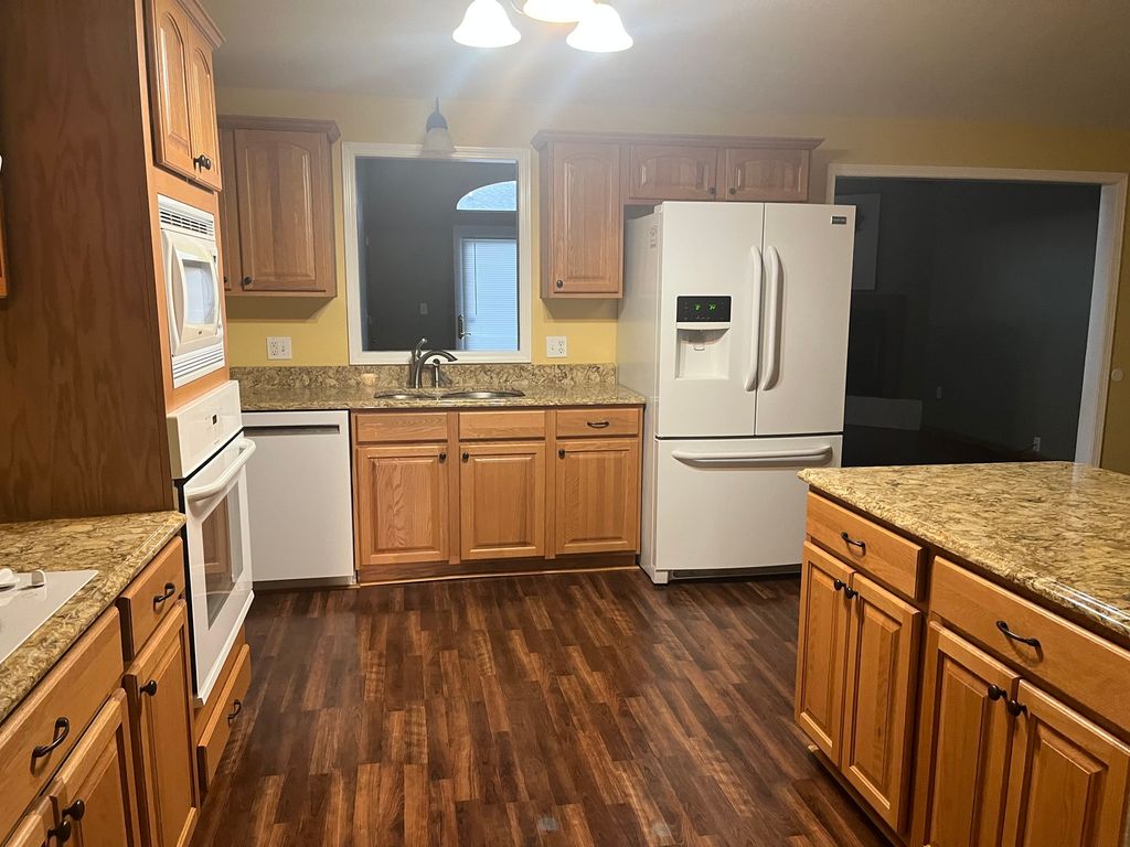 Don't miss out on this move-in-ready ranch home in a highly sought-after neighborhood! This meticulously cared-for home is an absolute must-see. Step inside from the inviting rocking chair front porch and discover a large living room with high ceilings, perfect for modern living. From the kitchen and dining area, a large family room with a fireplace and a walk-in storage closet is just waiting for game night or a quiet retreat to read a book. The kitchen seamlessly connects the living, dining, and family rooms, where you can be together yet still have a separate living space. Enjoy abundant cabinetry and generous granite countertops. The adjacent large laundry room/mud room offers plenty of space with access to the backyard. The large primary suite includes two spacious closets and an en suite bathroom. Both the primary and guest bathrooms have been updated. Easy-care laminate wood flooring throughout most of the home. The large, fenced backyard is accessible from both the laundry and family rooms and includes a deck for grilling and a large shed with a loft for tools and toys. An attached two-bay garage with separate doors, one upgraded with an automatic garage door opener, completes this home. A new roof and gutter system replaced in 2025, offers peace of mind and cost savings.