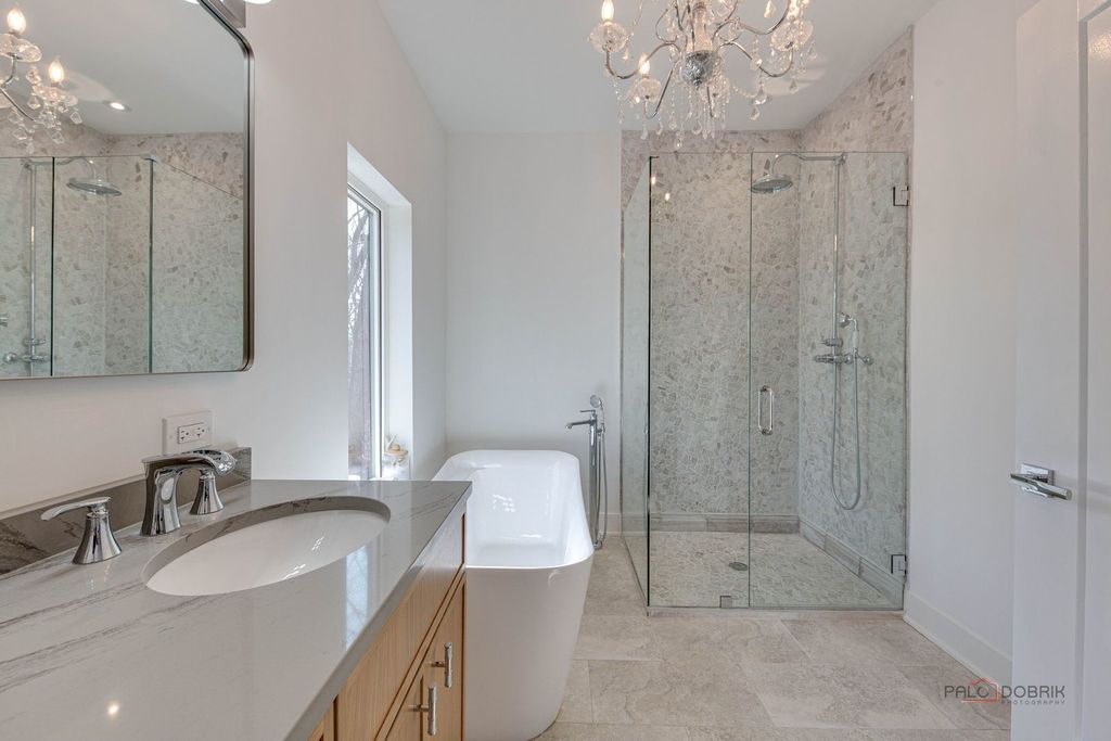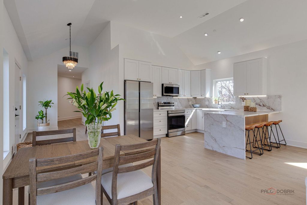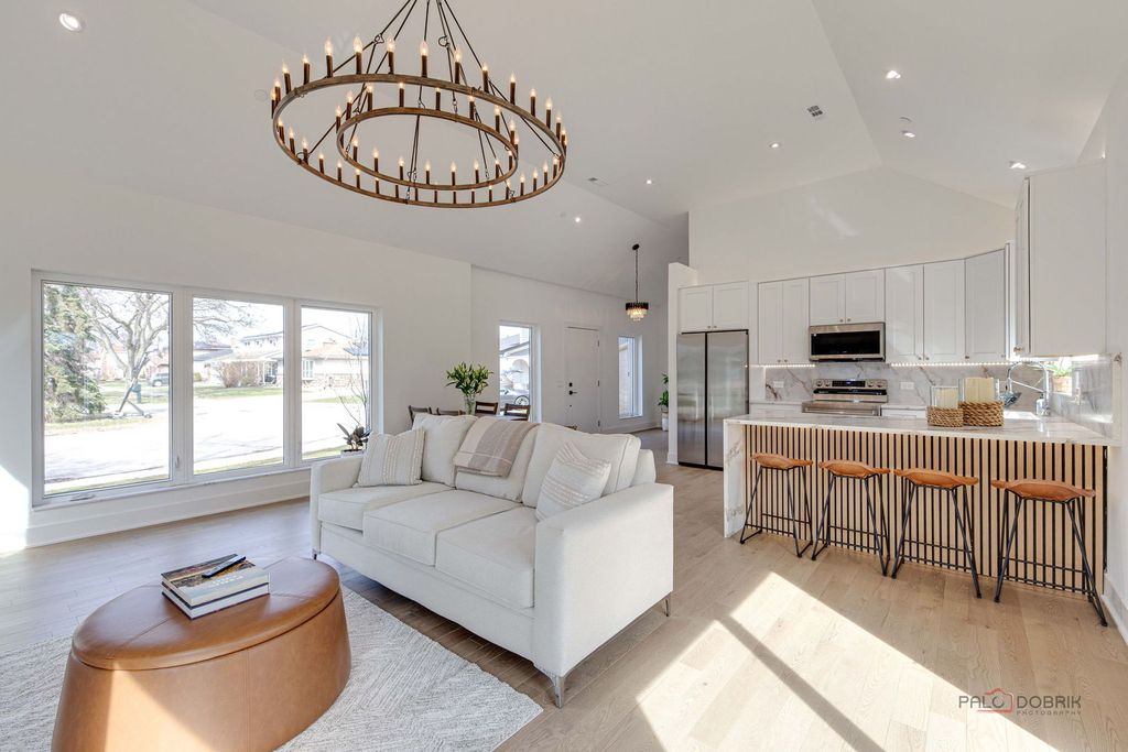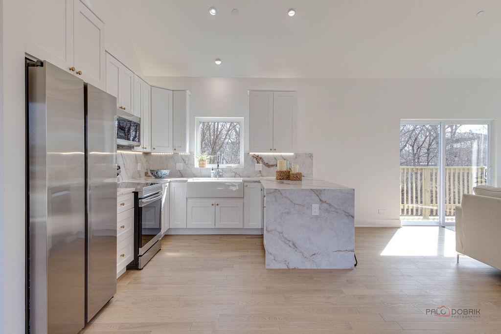 Discover this beautifully designed new construction ranch-style home offering desirable main floor living in the heart of Des Plaines and overlooking a serene creek, seamlessly blending modern luxury living with natural surroundings. Thoughtfully built with all-new construction, every detail-from mechanicals to finishes-is brand new, offering low-maintenance, move-in ready living and peace of mind. This single-family home offers 2 bedrooms, 2 bathrooms, plus a versatile office or flex room, and showcases bespoke, high-end finishes throughout. Natural red oak hardwood floors, soaring ceilings, and expansive European-style windows flood the space with natural light, creating a bright and airy open floor plan. The open-concept living space is enhanced by architectural lighting and elegant chandeliers. The gourmet kitchen is thoughtfully designed with quartz countertops, a full quartz backsplash, and a waterfall-edge peninsula, complemented by Samsung appliances and custom panel detailing with integrated accent lighting. Quartz-trimmed window parapets add architectural interest throughout the kitchen, living room, and foyer. The luxury primary suite offers a spa-inspired retreat with a natural stone walk-in shower, freestanding soaking tub, wall-hung toilet, dual vanities, and a spacious walk-in closet, along with direct access to a private brick patio-perfect for indoor-outdoor living. A dedicated main-level laundry room includes an LG washer and dryer, utility sink, and additional storage. Exterior highlights include a natural stone front facade, brick driveway, and a wood deck with concrete stepping stones. Sliding doors from the kitchen create seamless indoor-outdoor living, ideal for entertaining or enjoying peaceful creek views. Ideally located within top-rated school District 57 and just moments from Mariano's, the Metra train station, shopping, dining, and parks, this home offers both convenience and a refined lifestyle in Des Plaines.