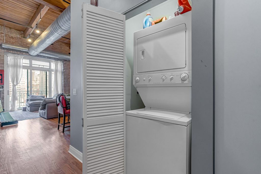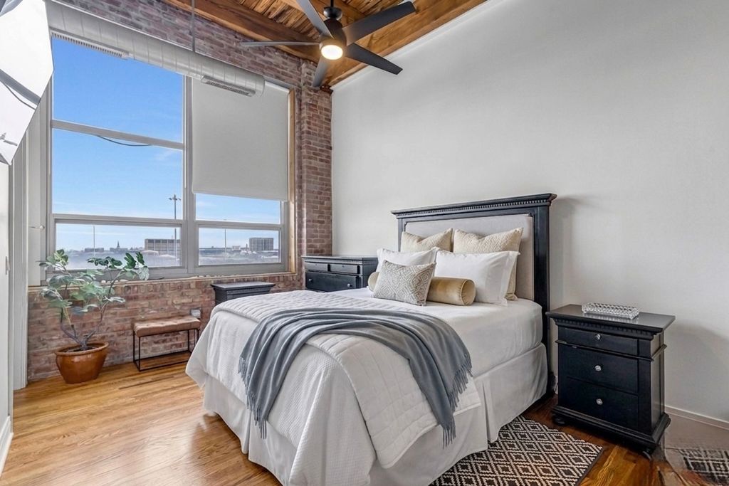 Southeast corner timber loft in Chicago's West Loop - originally the building's penthouse before two concrete floors were added above. The result: soaring 12'9" timber ceilings and exposed brick with the soundproofing of a concrete high-rise. A solid concrete ceiling above and double drywall party wall deliver a level of quiet that's nearly impossible to find in a loft building. Two walls of oversized 9-foot windows flood the home with natural light from morning through afternoon, with long south and east views over the neighborhood. Custom automated blackout roller shades on every window. Granite kitchen with stainless appliances, breakfast island, and 42" cabinetry. Primary suite with dual vanities and organized walk-in closet. In-unit laundry, east-facing balcony with city views, and a full-height storage locker. Walk Score 96, Transit Score 97 - steps from Greektown, Randolph Restaurant Row, Fulton Market, Google and McDonald's HQs, and multiple CTA lines. HOA includes heat, water, gas, parking, and fitness center.