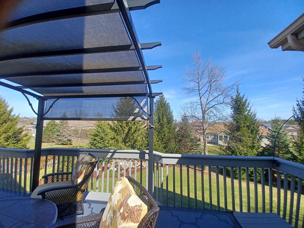 Gorgeous, meticulously maintained ranch in Sunset Ridge sitting on the ridge with lovely views. Owner just invested close to $20,000 in landscaping including a lovely little waterfall and beautiful trees. Over 3500 square feet of finished living space!!!Gleaming hardwood floors, granite counters, skylights, vaulted ceilings, cozy fireplace, 3 season room, huge balcony with pergola and fence yard are just a few of the amenities. Custom window treatments throughout, custom designed master closet is large enough to be a dressing room. Full walkout basement was professionally finished by KLM with a huge rec area, 4th bedroom, 3rd full bath and kitchenette (ss fridge included), craft area in addition to separate storage area. Radon mitigation system in place Under the sun room there is an equipment room with electricity and fits a riding mower lawn equipment. The 2 stage furnace was new in '15, AC new in '18, roof in '19, newer water heater and kinetico water softener. Newer fence with 5 gates. The love and care of this home is evident. You will love it.