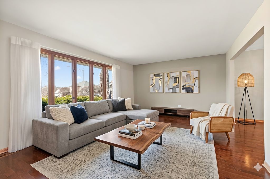 Welcome to this beautifully appointed and thoughtfully designed home in desirable Orland Park, offering 5 bedrooms and 3.5 baths, located within the 135 and 230 school districts. The main level features a formal living and dining room, along with a spacious, light-filled kitchen complete with stainless steel appliances, custom cabinetry with additional built-in storage, and an eat-in seating area perfect for an additional table. The kitchen opens to a large welcoming family room with a cozy fireplace, ideal for everyday living and entertaining. Rich wood floors run throughout most of the first floor, with large attractive tile in the entryway and kitchen. A standout feature is the first-floor bedroom with a full attached bath-perfect for related living, guests, or a second primary suite. Upstairs, you'll find four generously sized bedrooms, including a serene primary suite with French doors. The primary ensuite bath offers a walk-in shower and a large jetted soaking tub. An adjacent bedroom is perfectly situated for a versatile flex room; ideal for a nursery, home office or an additional sitting area. This bedroom/flex area is bathed in natural light from the newly install glass sliding door which leads to a second floor private balcony. Additional bedrooms share well-appointed bath, completing this spacious and functional layout. The finished partial basement provides additional living space with a built in surround sound system and recreational space. The laundry room, with new washer and dryer, along with plenty of storage and future potential complete the basement. Step outside to a beautiful paver brick patio with an 9x17 awning, perfect for outdoor entertaining, dining, or relaxing, all overlooking a backyard enhanced by multiple garden areas-ideal for gardening enthusiasts or those who appreciate a thoughtfully landscaped outdoor retreat. Love a good garage? This 3 car garage touts a Traxtile floor with a 5x7 landing providing extra space perfect for an easy entrance into the home. The entire property is a wonderful blend of comfort, flexibility, and style in a sought-after location.