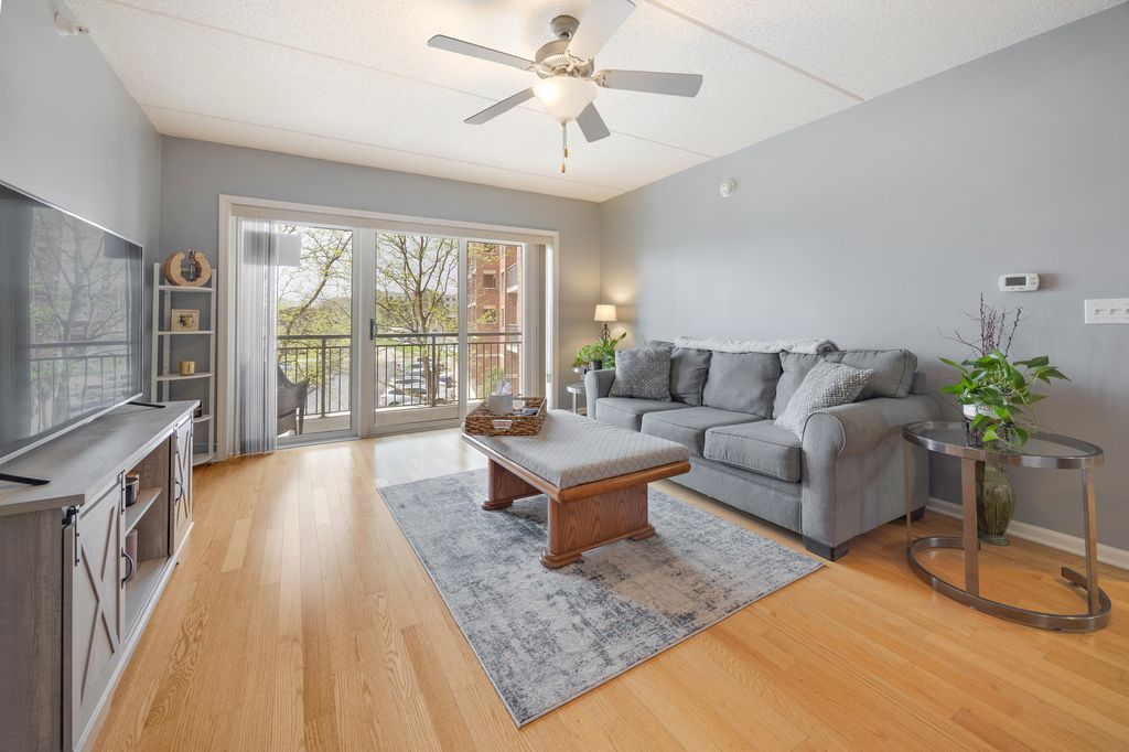 Move-in ready 1BR/1Bath condo unit in downtown Roselle with an open floor plan, hardwood flooring throughout, and a large sunny west exposure balcony. This Park Street Crossing condo building is walking distance to the Metra station, restaurants, a winery, Village Hall and public library. There is also a fitness center adjacent to the building. This condo unit has a large kitchen with lots of cabinet space, granite counter tops and newer stainless steel appliances. The large bedroom has a walk-in closet and there is also a convenient in-unit laundry room with newer washer and dryer and utility sink. The full bathroom has a shower/tub combination and 36-inch vanity. The unit also has an assigned garage space #33 and storage.