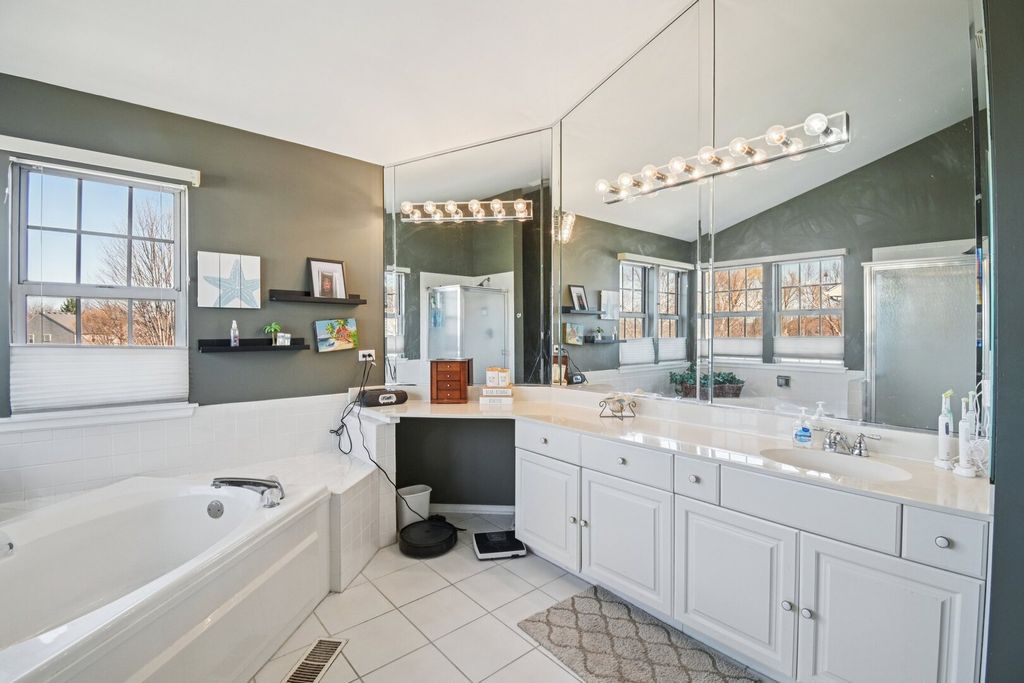 Welcome home to The Villages! With over 3,000 square feet of finished living space, 5 full bedrooms, and a cul-de-sac location, this one checks all the boxes. The finished English basement offers abundant natural light and features a 5th bedroom, private office, and large recreation area. The main level includes an open kitchen with eating area overlooking the greenbelt behind the home, along with separate living and dining rooms for added flexibility. Upstairs, you will find generously sized bedrooms, including a spacious primary suite with an oversized ensuite bath featuring a separate soaker tub, double vanity, and shower. Located in one of Crystal Lake's most sought-after communities, this home is a must-see. Be sure to check out the floor plan and photos, then schedule your private showing.