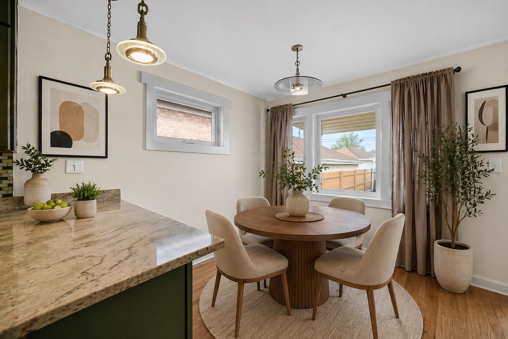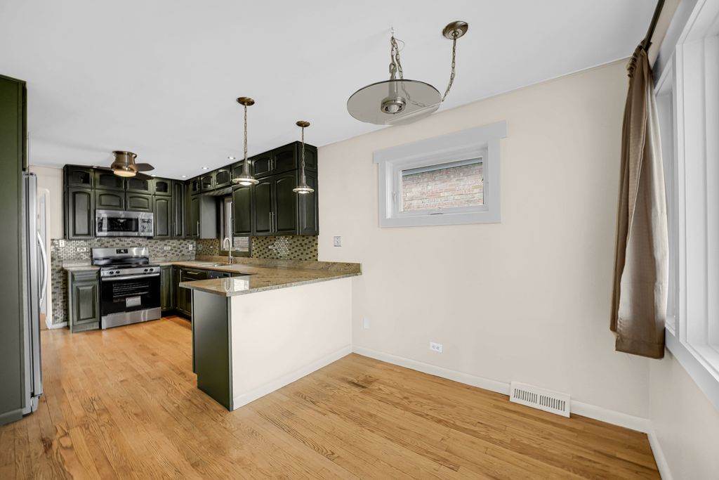 Beautiful ranch home located in desirable Harwood Heights, offering convenience and comfort in a prime location close to restaurants, grocery stores, banks, gas stations, and all your daily needs. Situated in the highly sought-after Maine South High School district. This inviting home features three spacious bedrooms on the main level, all with generous closet space. The living room and bedrooms showcase new luxury laminate flooring, while hardwood flooring extends through the kitchen and third bedroom. Enjoy an updated kitchen with abundant cabinet space, granite countertops, and stainless steel appliances-perfect for everyday living and entertaining. Additional highlights include newer windows, new storm doors at both the front and back, and a heated back porch that serves as a great mudroom or home office space. The fully finished basement offers even more living space, complete with a beautifully updated full bathroom, a stylish bar area, large storage closets in both the front and back, and an updated laundry room with newer washer and dryer, plus a utility sink. The basement also features a separate exterior access via a rear staircase-ideal for flexibility and convenience. Step outside to a fenced backyard with a nice concrete patio, perfect for relaxing or entertaining. A 2.5-car detached garage completes this fantastic property. This move-in-ready home truly has everything you and your family need-don't miss this opportunity!