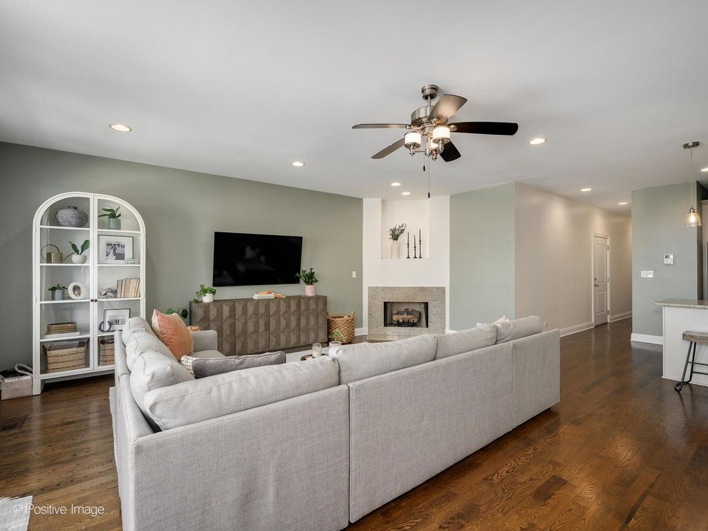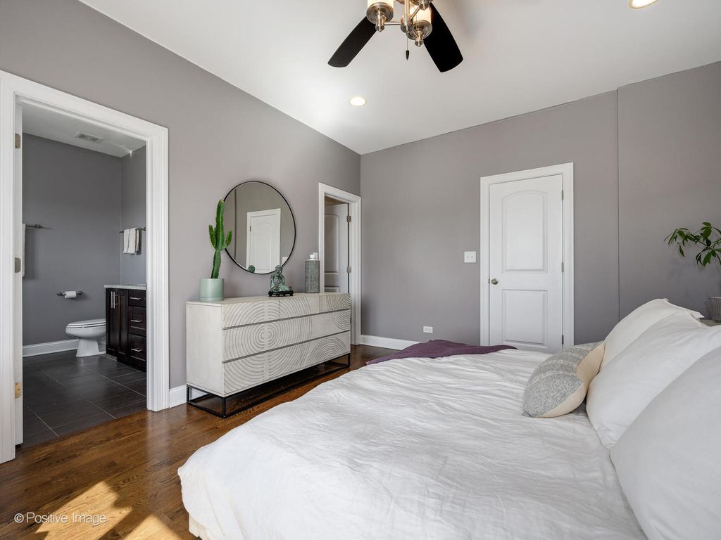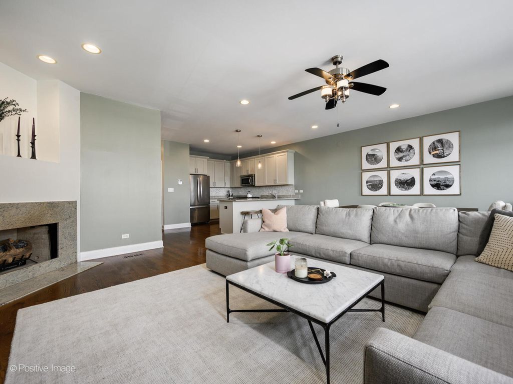 Pent house, extra-wide 3-bedroom, 2-bath condo located in the highly sought-after Blaine School District. This bright and spacious home offers an open floor plan with hardwood floors throughout, a gas-lit fireplace, and in-unit washer and dryer. Enjoy three private outdoor spaces, including a 22' x 6' front terrace off of the living and dining area, perfect for grilling and entertaining, a south-facing balcony off the primary bedroom, and an expansive private rooftop space. The roof has been recently resealed, and the rooftop is ready for your vision, offering the opportunity to build out a stunning private deck.The kitchen features recently modernized custom 42" cabinets, granite countertops with a peninsula breakfast bar, a stylish herringbone backsplash, and stainless steel appliances. The primary suite includes a large, professionally organized walk-in closet and an en-suite bath with double sinks, a separate shower, and a soaking tub.Exterior parking is included. Ideally located just blocks from the Irving Park Brown Line, shopping, and dining.