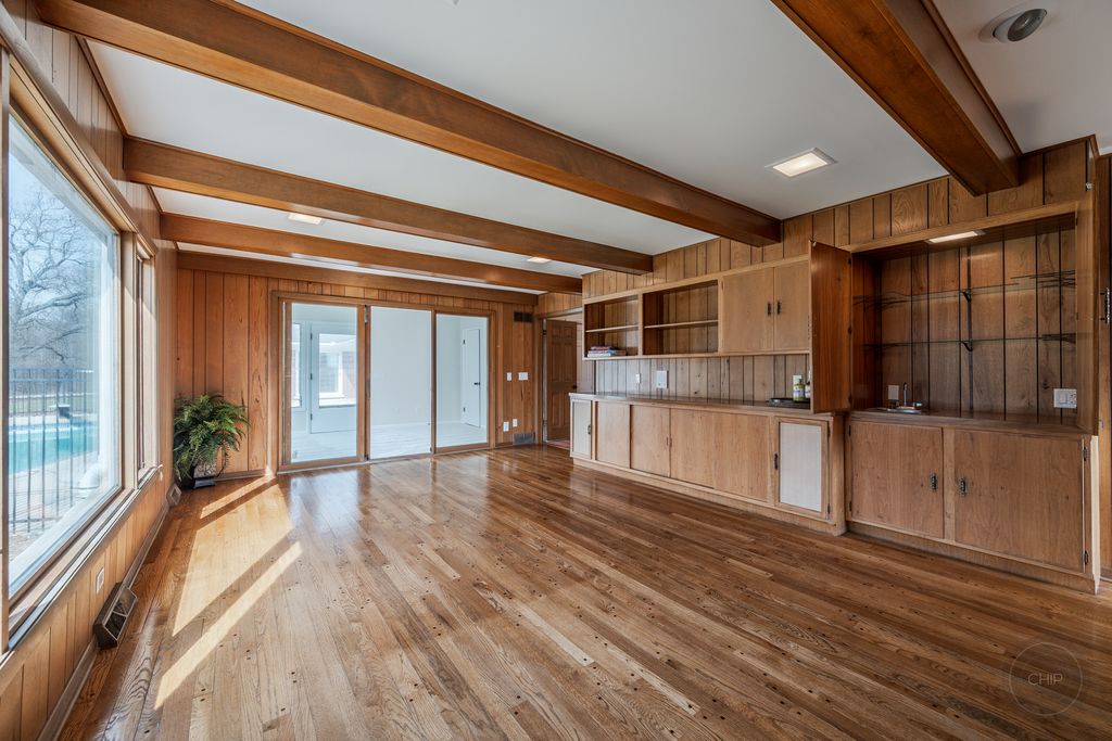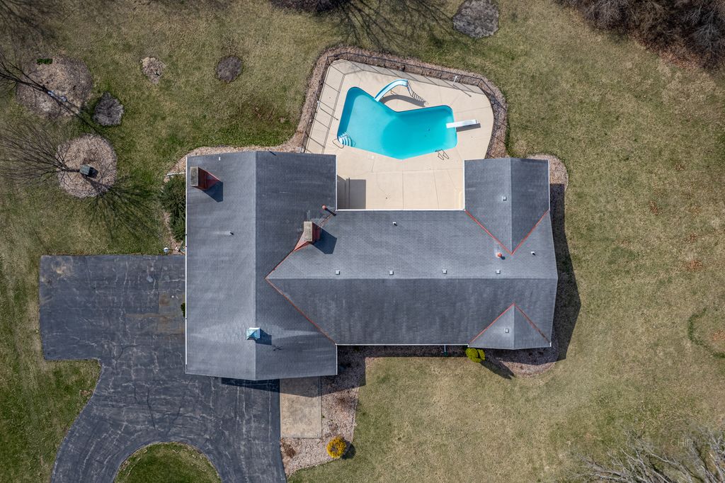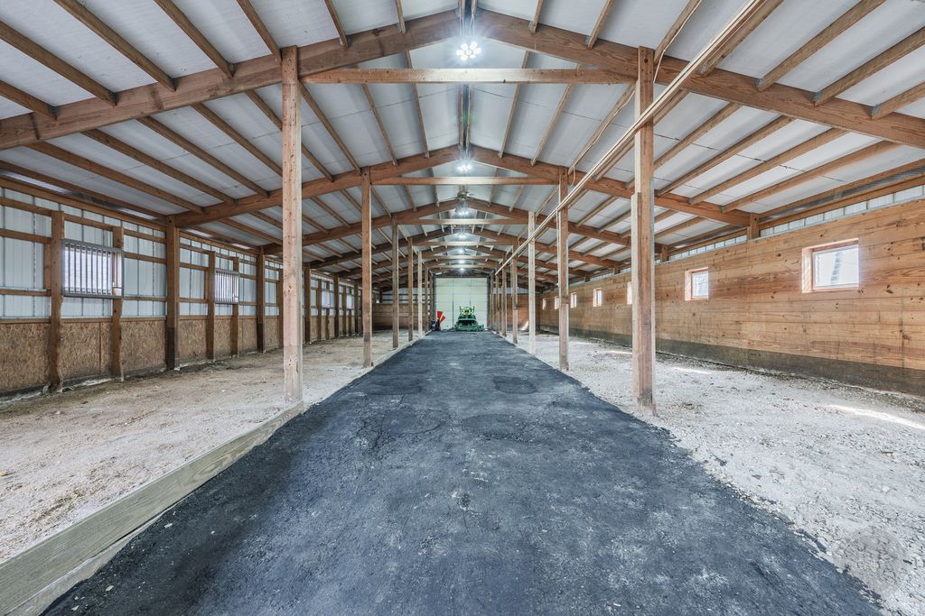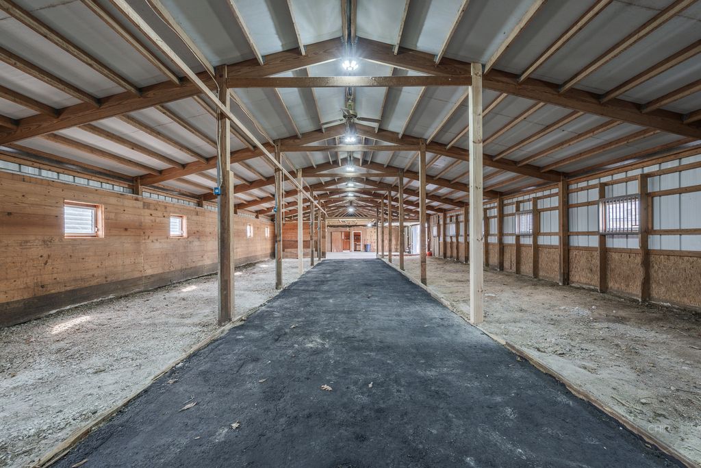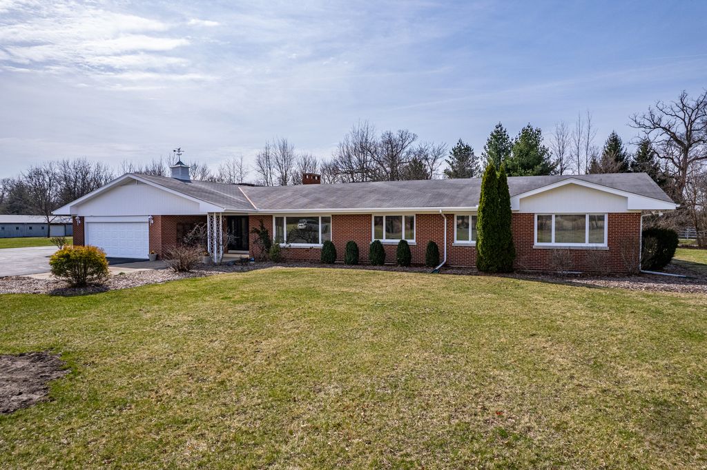 Experience refined country living in this exceptional custom all brick ranch estate, previously part of a historic equestrian Polo Farm, gracefully set on 5+ private acres of picturesque land. Blending timeless craftsmanship with elevated comfort, this expansive residence offers a rare combination of space, privacy, and versatility. From the moment you arrive, the estate captivates with its stunning curb appeal, highlighted by several 100-year-old oak trees, lighted entrance pillars, winding circle drive and an inviting oversized covered front porch. Superior Americana craftsmanship in the mid-century modern style is captivating. Inside, you will find over 3,700 sf of living space. The large entry foyer leads to a living room featuring a large picture window overlooking the property and allowing an abundance of natural lighting. Spacious kitchen showcases newer stainless-steel appliances, open shelving, and an abundance of upper and lower cabinets! The kitchen offers unique built-in accessories, providing ample counter space. Solid wood beams add a charming feel to this room along with the stone fireplace. The family room offers the perfect place to gather featuring a second fireplace, custom built-in bookcases, cabinetry, and a wet bar, hardwood floors and so much more. Off the family room is a true four-season room with access to the outside patio. This sprawling ranch includes 4 spacious bedrooms, an office and 3 full bathrooms. All new carpet throughout and freshly painted! Main floor laundry room with newer machines as well as a sink, folding counter and built-in ironing board. For even more space the 8' deep full basement will impress at an incredible 3770sf! Multiple storage rooms with floor-to-ceiling shelving available in the basement, which could easily be used as a private wine cellar. The basement also has an additional half bathroom. Outdoors, the property offers a peaceful retreat. A beautifully updated in-ground pool serves as the centerpiece for entertaining, complemented by a fenced patio designed for intimate gatherings complete with a built-in gas grill for effortless outdoor dining. Surrounded by open land and natural beauty, the setting offers both serenity and exclusivity. Adding to the estate's unique appeal is the impressive, metal outbuilding at 4550sf! Horses allowed! Two separate overhead garage doors for easy access for large vehicles or equipment. Asphalt drive through outbuilding with natural floors on the sides ready for horse stalls. Large concrete floor shop area with rooms for offices or storage. Kitchen sink and full bathroom (requires reconnecting water hookup) perfect for a workshop, business operations, creative studio, or even a golf simulator! This one-of-a-kind unique historical property combines rural charm with modern convenience, creating a rare opportunity to own a versatile estate with room to live, work, and play. Make sure to check out the extensive list of updates to comprehend the full scope of what this home has to offer!