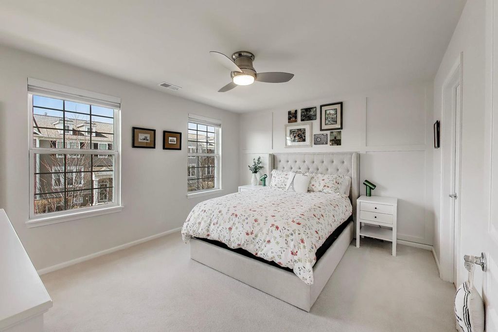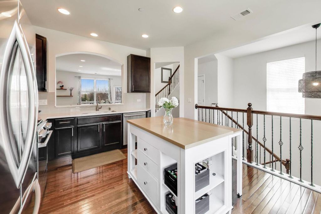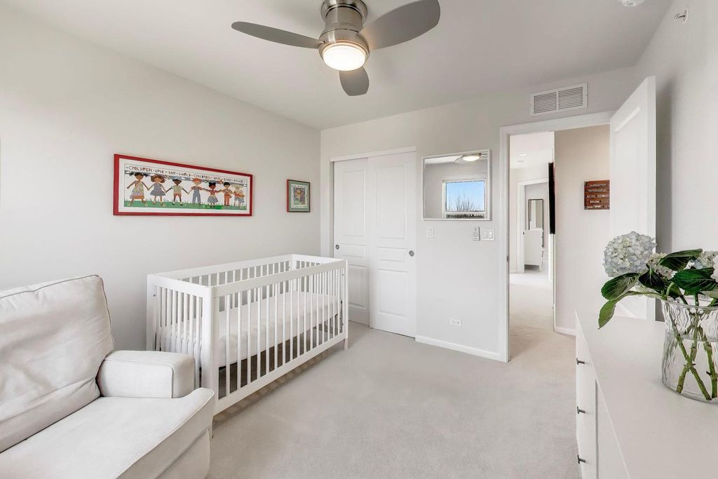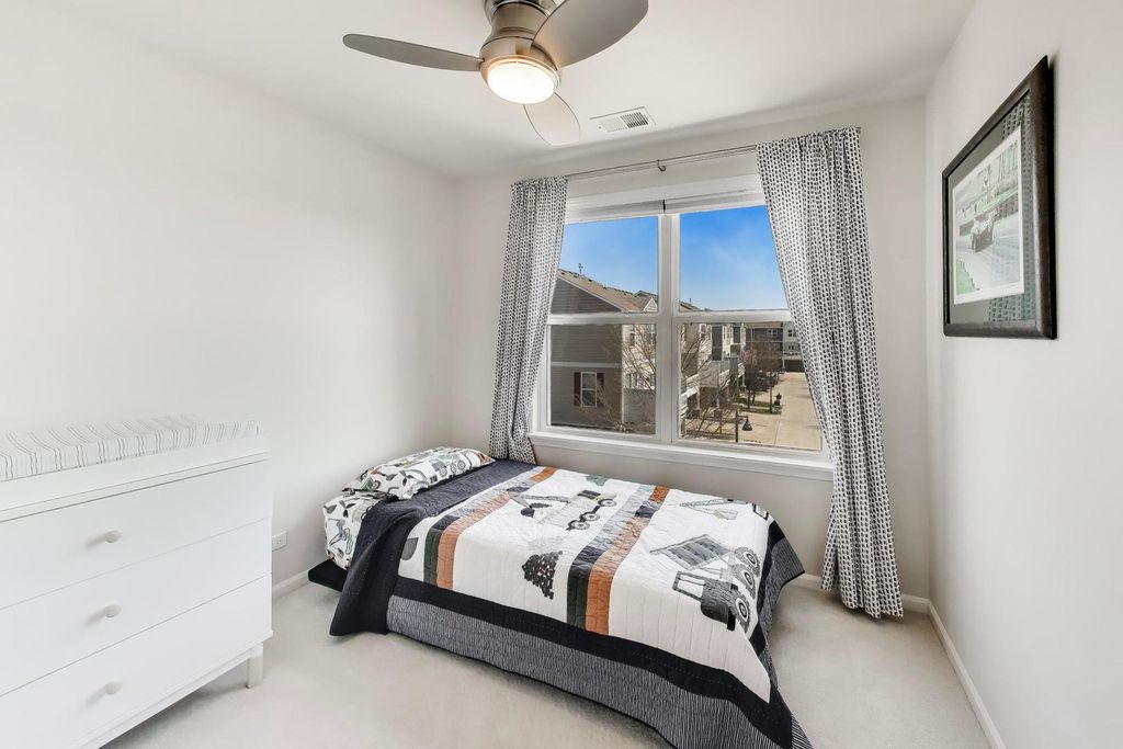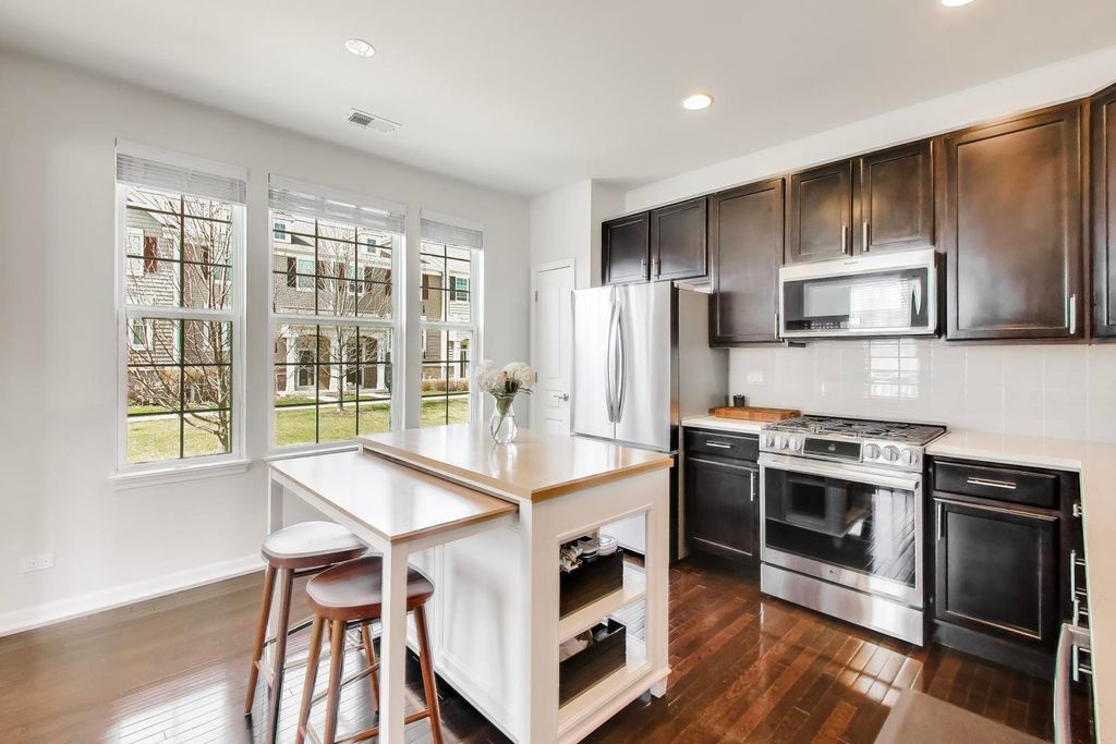 SUNNY AND PRISTINE END-UNIT TOWNHOME IN COVETED REGENCY AT THE GLEN! Sun-drenched, open floor plan with elevated updates throughout. Generous eat in kitchen upgraded with gorgeous new Cambria quartz countertops, tile backsplash, Moen hardware, LG refrigerator, LG Studio stove, Bosch dishwasher, and Whirlpool microwave. The largest model built, this home enjoys an expansive main level with high ceilings, gleaming hardwood floors, and a roomy living/dining area, which opens to an extra wide balcony with new decking. Three bedrooms and laundry on the upper level, primary bedroom has a large walk-in closet. Both second floor baths are upgraded with Cambria quartz countertops, new tile in shower, and Moen hardware. Lower level with new french doors offers flex space as a rec room, office, or extra bedroom. New light fixtures throughout and Karastan carpet, Minca fans and blackout shades in bedrooms, make this move-in ready gem even better. Location cannot be beat - walk out your front door into shared green space, around the corner to the beautiful swan pond, and just a short distance to running trails, golf, Glen Town Center, Metra, Kohl's Children's Museum, groceries and entertainment. Award winning schools make this the complete package, welcome home!