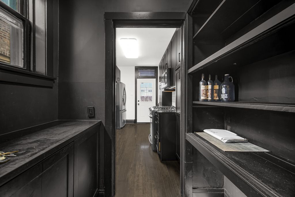 Rarely available, this charming vintage condo is nestled in an intimate four-unit building and filled with timeless character. Step into a welcoming foyer with a generously sized coat closet. To your right, a bright and expansive living room features beautiful hardwood floors, a decorative fireplace, classic 1920s inward-swinging wood windows, and a striking Serge Mouille-inspired spider ceiling lamp. Just beyond the foyer, French doors lead you into a spacious formal dining room, complete with hardwood floors, original inward swinging wood windows, updated recessed lighting, and a modern West Elm LED chandelier. Through the pantry/bar area, you'll find a fully updated kitchen boasting hardwood floors, newer appliances, quartz countertops, and ample cabinet space. The condo offers two generously sized bedrooms with hardwood floors, along with a versatile den/office-perfect for working from home. The bathroom has been thoughtfully renovated to preserve its 1920s charm while incorporating modern updates. Enjoy summer days on your private back porch. This truly unique and spacious condo combines vintage appeal with modern convenience, with kitchen, bathroom, plumbing, and electrical updates all completed in 2019. Additional features include three storage units and one garage parking space. Ideally located near shopping, dining, and transportation, including Jewel, Walgreens, the upcoming Pete's Market, CTA bus lines, Blue and Green lines, I-290, and the shops and restaurants of downtown Oak Park.