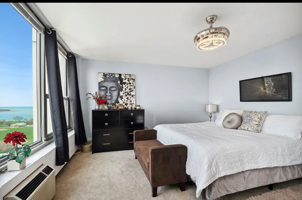 If you're looking for breathtaking views, this is the one. This gorgeous and spacious one-bedroom corner unit offers extraordinary, unobstructed panoramic views of both the city and lake. The modern kitchen features rich cherry cabinetry with a built-in wine rack, granite countertops, and stainless steel appliances. A thoughtfully designed layout includes a generous dining area and a large primary bedroom with stunning views right from your bed. Hardwood floors run throughout, complemented by abundant closet space. The home is located in a full-amenity building offering 24-hour door staff, a rooftop deck, a beautifully landscaped courtyard, BBQ grills, an on-site grocery store and dry cleaner, two fitness centers, and garage parking. Ideally situated between the lakefront and the vibrant shops and restaurants along Broadway in East Lakeview, this property is an exceptional opportunity for both comfortable living and long-term investment. The unit is currently tenant-occupied, with a lease in place through September-providing a turnkey opportunity for investors, as the seller will transfer the lease to the buyer at closing.