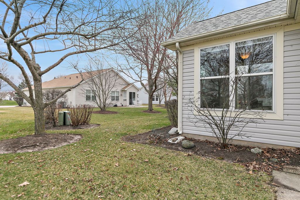 Highly desirable Manistee model, original Del Webb construction. You are greeted with a charming 5x18 covered front porch, perfect for morning coffee or relaxing evenings. Step inside to a tiled entry that opens into the spacious living and dining area, originally designed as the great room, featuring wood laminate flooring that flows throughout the main living spaces, with comfortable carpet in both bedrooms. The home offers a thoughtful layout with a full hallway bath featuring an enclosed shower, along with a full-size laundry room that leads to the Illinois room which consist of extra large storage area complete with custom cabinetry. The two car garage provides plenty of room for vehicles, storage, or even a golf cart. The master suite includes a walk-in closet and a recently updated private bath with a tub and shower combination. The kitchen has been tastefully updated with stainless steel appliances, custom cabinetry, a pantry closet, and a flexible eating area that can accommodate a table or center island. Just beyond, the family room features a cozy electric corner fireplace, which is included with the home, and flows into a bright four season sunroom room filled with natural light and sliding doors that lead out to a 10x20 (approx) concrete patio. The backyard is nicely landscaped, offering a peaceful and quiet setting to enjoy the outdoors. Roof replacement in 2018, Sprinkler system installed in 2013, Kitchen 2017 with recent appliance replacement in 2024 (refrigerator and microwave) This home is situated in Del Webb Sun City Huntley, a premier adult lifestyle 55+ community offering a wide range of amenities, including multiple lodges, fitness centers, indoor and outdoor pools, tennis courts, pickleball, bocce ball, and various social clubs plus so much more.