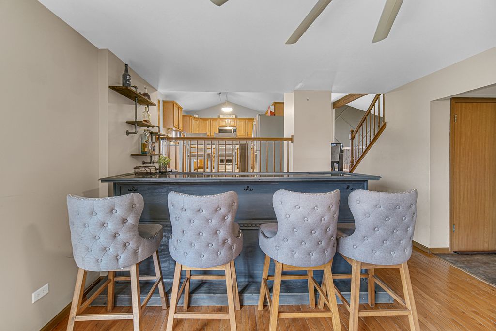 The moment you step through the door, the vaulted ceiling opens above you, wood beam overhead, hardwood underfoot, and a grand staircase anchoring a living space that immediately feels different from everything else in this price range. This is not a house you walk through and forget. Designed for families who actually live in their home, 624 Driftwood delivers space on every level. The split-level layout creates natural zones a vaulted living and dining room up top, a family room below anchored by a built-in bar you can see right from the main level. Sliding glass doors open to a large fenced backyard with an incredible covered deck, turning every evening into something worth looking forward to. The kitchen overlooks the private yard and flows into the main living areas hardwood flooring runs throughout the entire home, giving every room a cohesive, elevated feel. Updated bathrooms and new light fixtures mean the finishing touches have already been done for you.The owner's suite includes a large walk-in closet and private full bath. Three additional bedrooms give growing families the room they need. The full finished basement adds another dimension of living space whether a playroom, home office, or a place for the kids to disappear on a Sunday afternoon. Major systems are handled: furnace replaced in 2024. Deep garage. Large crawl space for storage. Beautiful neighborhood, family-oriented, with commuter-friendly access. This one is built to live in for years.