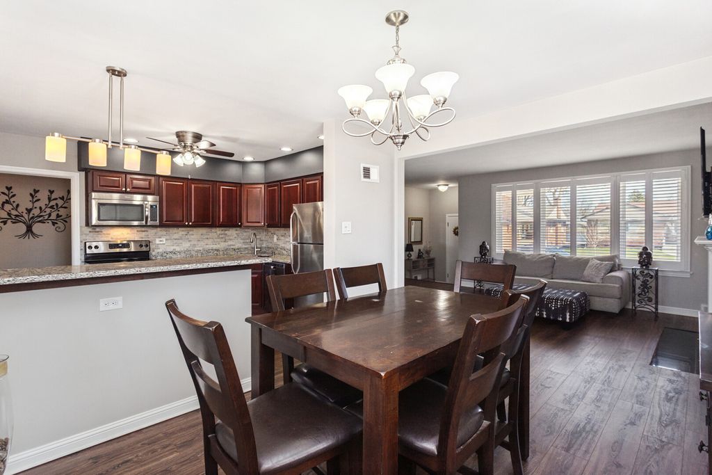 Must see picture-perfect, brick ranch situated on a spacious corner lot. This well-maintained home features an inviting, light-filled living room with great flow into the eat-in kitchen, which includes a breakfast bar, plenty of cabinets, and generous counter space - ideal for everyday living. The three bedrooms are nicely sized with ample closet space, including a primary bedroom with two closets. The finished basement offers exceptional additional living space, complete with a second kitchen and a large island perfect for gathering. You'll also find a comfortable family room, and multiple storage areas. A heated breezeway connects the home to the attached 2-car garage and offers functional space for a mudroom or drop zone. Enjoy the fenced backyard with patio, perfect for outdoor relaxation and entertaining. This home combines comfort, space, and versatility in a desirable setting. Property being sold AS-IS.