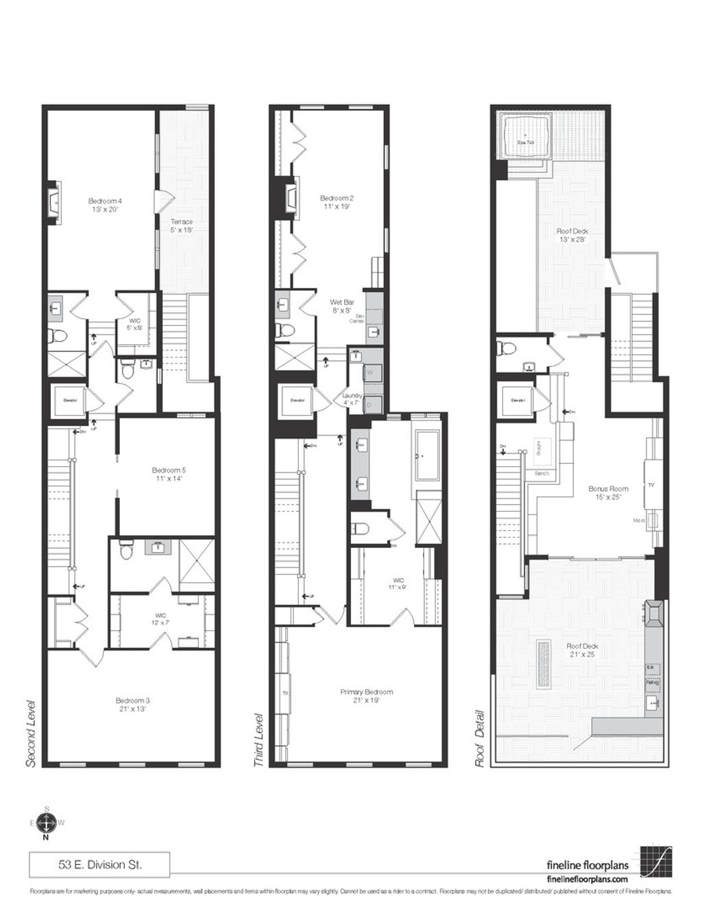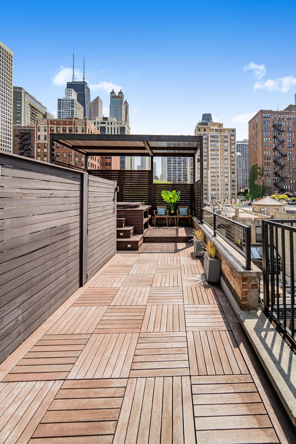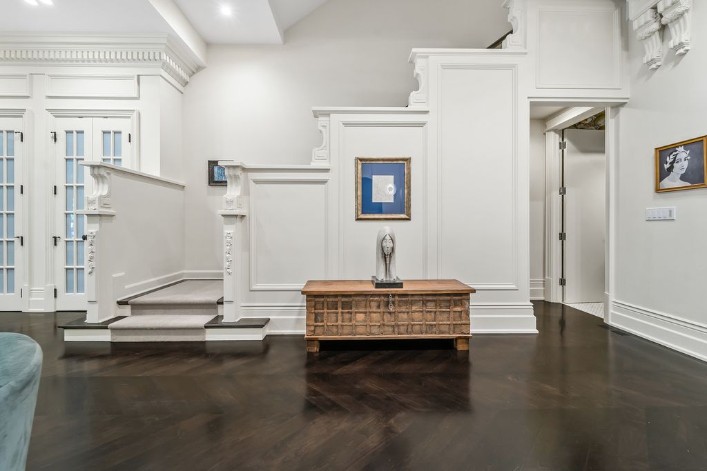 Classic in style and transitional in design, 53 E. Division St. is a 7,500-square-foot, 5 bed/9 bath luxury home in the heart of the Gold Coast with four private outdoor spaces and a rare attached garage. One of the only residential works by famed architect Jarvis Hunt, located steps from Oak Street Beach and moments from the Mag Mile, the renovated Beaux-Arts exterior is a masterpiece of ornate ironwork and limestone, accented by beautiful landscaping and a fountain. Inside, the main level begins with a foyer that teases the world-class finishes that can be found throughout, including moments of expertly preserved original marble and millwork details. The impressively spacious, open-concept living/dining room sets the stage for elevated entertaining, and features 12'-high ceilings, an extremely rare 20'-wide footprint for the Gold Coast, herringbone hardwood floors, French doors that open to Juliet balconies, and the first of three wood-burning fireplaces. The dining space flaunts beautiful built-ins and marble stairs that ascend into a handsome family room with coffered ceiling and a custom bar center. Most recently, this home's gorgeous chef's kitchen underwent a complete renovation courtesy of KitchenLab Interiors and features custom cabinetry, natural stone countertops, professional-grade appliances, a long island with dine-up seating, and character from a limestone fireplace and more French doors. Four distinctive, design-forward en-suite bedrooms are spread across the second and third levels, including one that's styled as a gorgeous owners' den, another that's designed as a light and bright home office with a custom wet bar, and one with a private patio (5'11" x 21'3"). The spectacularly spacious primary suite boasts arched windows, a sitting area, bespoke built-ins, a custom walk-in closet with styling and beverage stations, and a newly renovated marble bath with dual vanity, soaking tub, and a glass-encased shower. The top level is an indoor/outdoor entertainer's paradise, including two incredible rooftop spaces: one with a full professional-grade kitchen, dining and lounge spaces, and a fire table (22'4" x 26'5"); the other with a luxe, open-air spa (12'4" x 29'3"). Better still, the lower level features a temperature-controlled wine room, a large recreation/media room, the fifth en-suite bedroom (perfect for extended-stay guests or an au pair as it has its own entrance), and access to the home's fully finished, attached garage with a bonus refrigerator and wine fridge. Additional callout details include multiple half-baths, full-home automation via a Control4 system, state-of-the-art mechanicals including an all-floors elevator, designer wallcoverings and statement lighting throughout, an upstairs laundry room, a lower level mudroom, and abundant storage. Walking distance to world-class dining and shopping, top schools, and the Division Street Farmers' Market, 53 E. Division St. is turnkey luxury with the very best of Chicago right outside your front door.