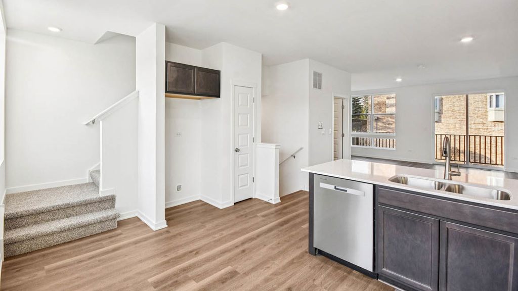 Welcome to your new home at 392 Summit Circle in Lombard, Illinois in our Summit at Yorktown community. This townhome will be ready for a Spring move-in! Enjoy low maintenance living, including snow removal, lawn care and exterior maintenance, allowing you more time to relax and enjoy your surroundings. The Monroe floor plan offers 1,661 sq ft of comfortable living space featuring 2 bedrooms, 2.5 baths, a convenient loft, and a finished flex space. As you step upstairs into the main living area, you'll be greeted by an inviting open concept layout with lofty 9ft ceilings, creating a spacious and airy atmosphere. The corner kitchen, complete with soft-close cabinets and wrapped in Quartz countertops, overlooks the dining area and great room, perfect for entertaining or relaxing with loved ones. The kitchen comes with stainless steel appliances. Experience the comfort of a spacious primary bedroom flooded with light from the wall of windows including windows in the walk-in closet! The adjoining en suite bathroom has beautiful Quartz counters atop raised double sink vanity. Also upstairs, you'll find the laundry room, secondary bedroom adjacent to the loft, perfect for a sitting room, office, workout room or playroom with a full second bath and a linen closet. Luxury vinyl plank flooring adorns the entry way, main level of kitchen, dining and family rooms, bathrooms and laundry. This home is equipped with an innovative ERV furnace system and a tankless water heater, adding to the multitude of impressive features and quality 2"x6" construction with Hardie board siding. The townhomes also feature a convenient 2-car garage with a rough-in for an EV charger and a 2-car driveway, providing ample parking space for residents and guests. All Chicago homes include our America's Smart Home Technology. Photos are of a similar home and model home. Actual home build may vary.
