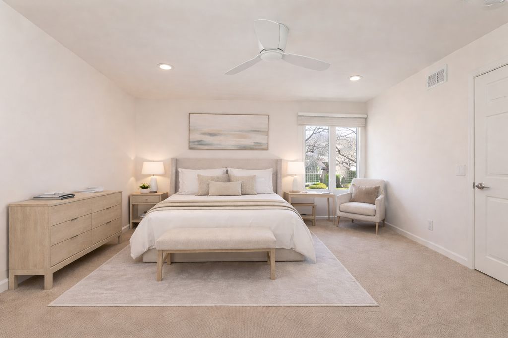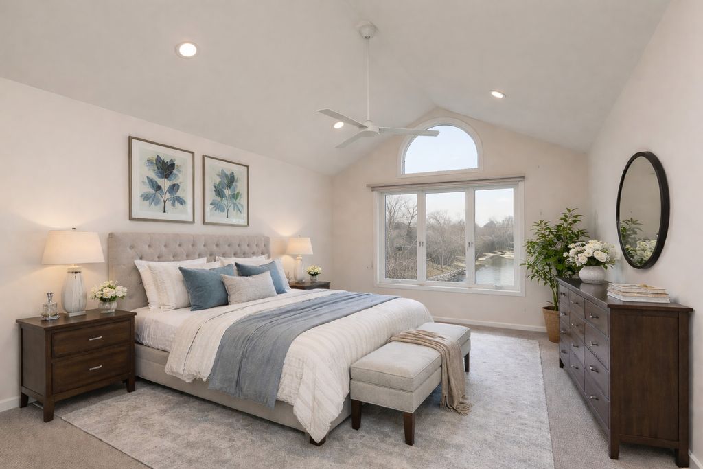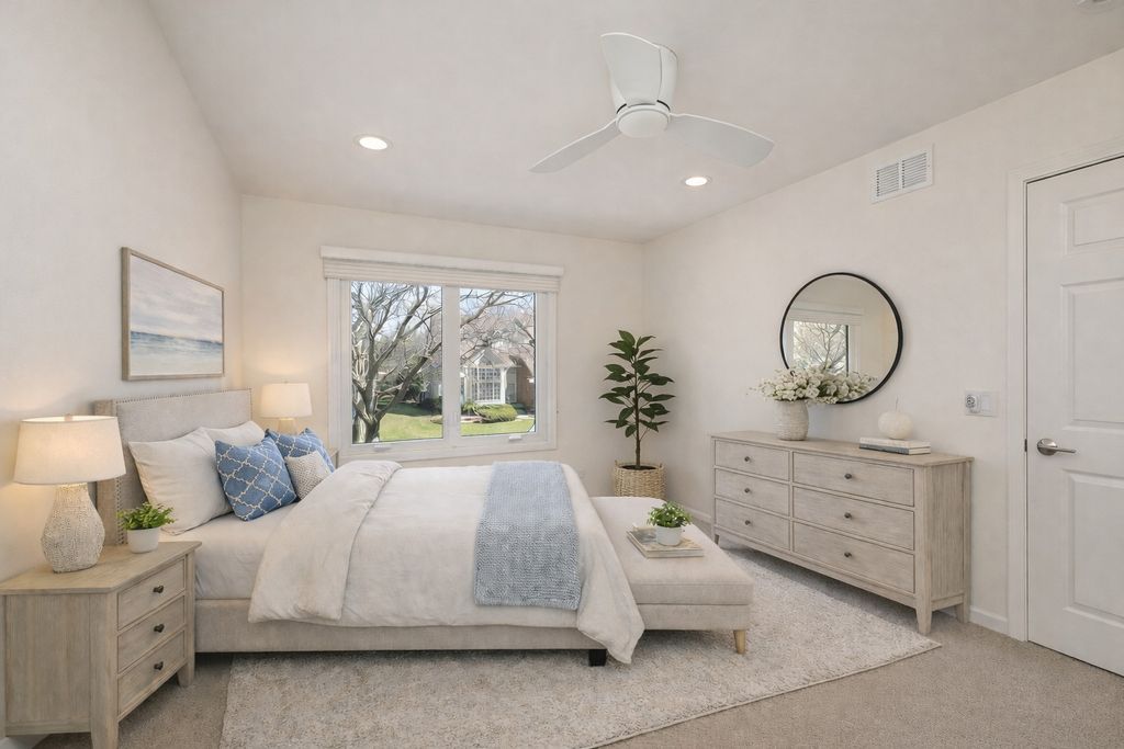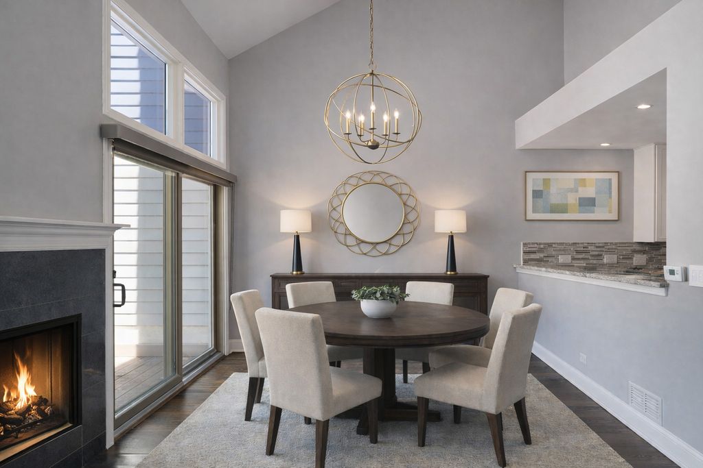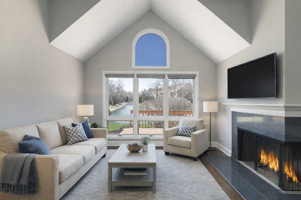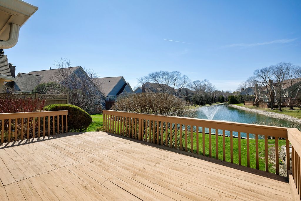 Enjoy resort-style living or a fantastic rental investment opportunity in this beautifully updated 3-bedroom, 2.5-bath townhome with serene pond views, ideally located in the sought-after Fountains of Deerfield community. The main level features gleaming hardwood floors, soaring ceilings, and an open, modern layout. The updated white kitchen offers granite countertops, stainless steel appliances, and a bright eating area. The living room (or office), dining room, and family room flow seamlessly, anchored by a centrally located fireplace. Walls of windows and sliding doors lead to a spacious deck overlooking a picturesque, fountain-filled pond-perfect for relaxing and enjoying scenic views year-round. Upstairs includes three generously sized bedrooms and a renovated hall bath. The primary suite features vaulted ceilings, water views, a walk-in closet, and a beautifully updated en-suite bath with dual vanities, a soaking tub, and separate shower. The finished lower level provides approximately 1,200 square feet of additional living space, ideal for recreation, fitness, or entertaining, plus ample storage. A full laundry room sits just off the attached two-car garage. Conveniently located near shopping, parks, the Patty Turner Center, expressways, downtown Chicago, and O'Hare Airport. Estate sale conveyed as-is with immediate possession possible. Move right in and enjoy low-maintenance living in a prime location. All images featuring furniture are virtually staged.