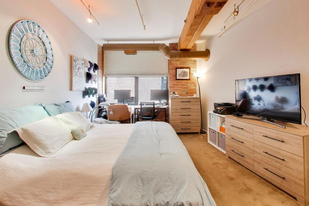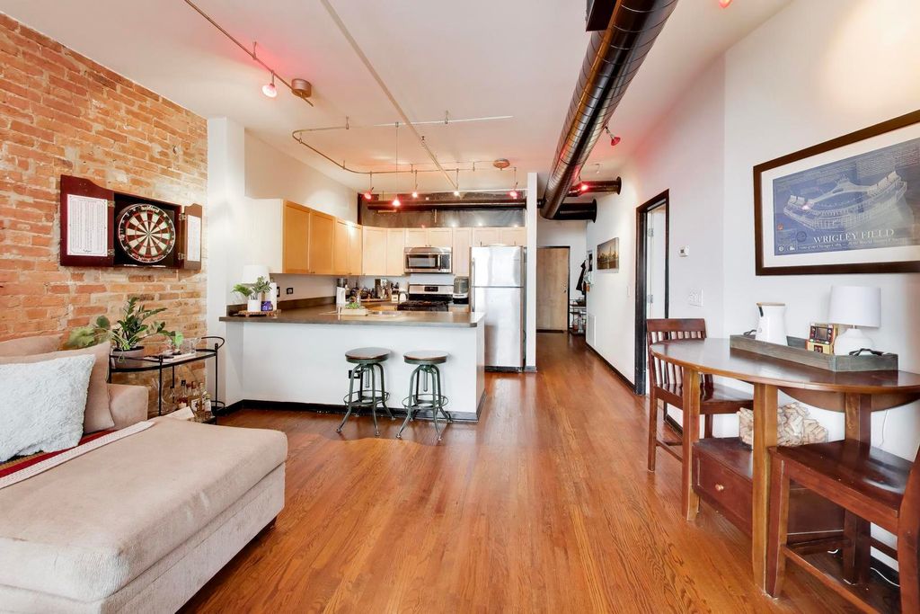 Welcome to one of the city's top brick-and-timber loft homes at coveted River North Commons. Where timeless character meets the energy of city living. All the warmth of classic exposed brick, soaring timber beams, yet none of the noisy or dusty cons of exposed timber ceilings. All in an airy open layout that create a space that feels both grounded and expansive. Plus a rare chance to not stare at a brick wall like most loft views. The kitchen is thoughtfully positioned to maximize open flow, function, and casual entertaining, flowing seamlessly into the living space where a fireplace adds warmth and ambiance, and continues to a wall of floor to ceiling windows and a sliding door to your peaceful balcony. The fully enclosed primary bedroom offers a sense of retreat, inviting you to unwind and recharge at the end of the day. Featuring well positioned stunning timber beams, a large window, ample room for king bed and additional furniture, or even space for a home office. Many of these loft 2 beds at this price have a tiny 2nd bedroom. Yes this is an interior 2nd bedroom-however it is fully enclosed, actually has a door, it is enclosed on all sides with a convenient glass panel to still allow natural light, and larger than most 2nd beds at this price. Plus easy access to the 2d full bath. Everyday conveniences like in-unit washer/dryer, additional storage, and central air ensure ease without compromise. Unit has secured tandem parking spot in the outdoor lot for $25K and additional optional heated garage parking $35K if a 3rd spot is desired. River North Commons delivers a full-service lifestyle with 24-hour door staff, fitness center, on-site management. Just outside your door, enjoy Larrabee Dog Park, Montgomery Park, the Riverwalk, acclaimed dining, vibrant nightlife, and seamless access to multiple CTA lines. This is more than a home-it's a space with presence and staying power in one of River North's most iconic loft buildings. Come see and make this your home today!