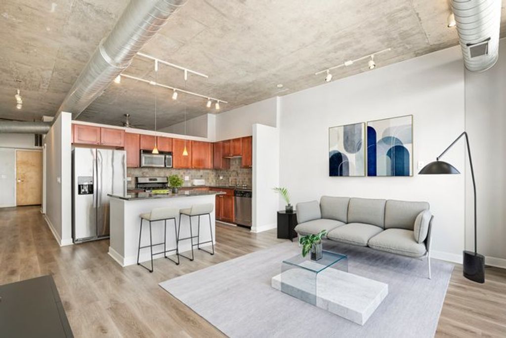 Sun filled 1 bed, 1 bath condo in River Village Lofts! Enjoy true loft living with concrete ceilings and exposed ductwork for a modern, industrial feel. This bright and airy home features a spacious open living area with floor-to-ceiling windows showcasing stunning views of the Chicago River. The kitchen features an island with breakfast bar, granite countertops and stainless steel appliances. The bedroom offers a ceiling fan and a full wall of closets, while the updated bathroom (2023) includes an extra-long vanity and a sleek shower/tub combo with glass doors. Additional highlights include a private balcony, deeded garage parking space and additional storage locker. Unbeatable location just seconds from the Riverwalk and minutes to the Blue, Brown, and Purple Lines, as well as Chicago & Division buses. Close to Goose Island, I-90/94, and surrounded by endless shopping, dining, and nightlife options.